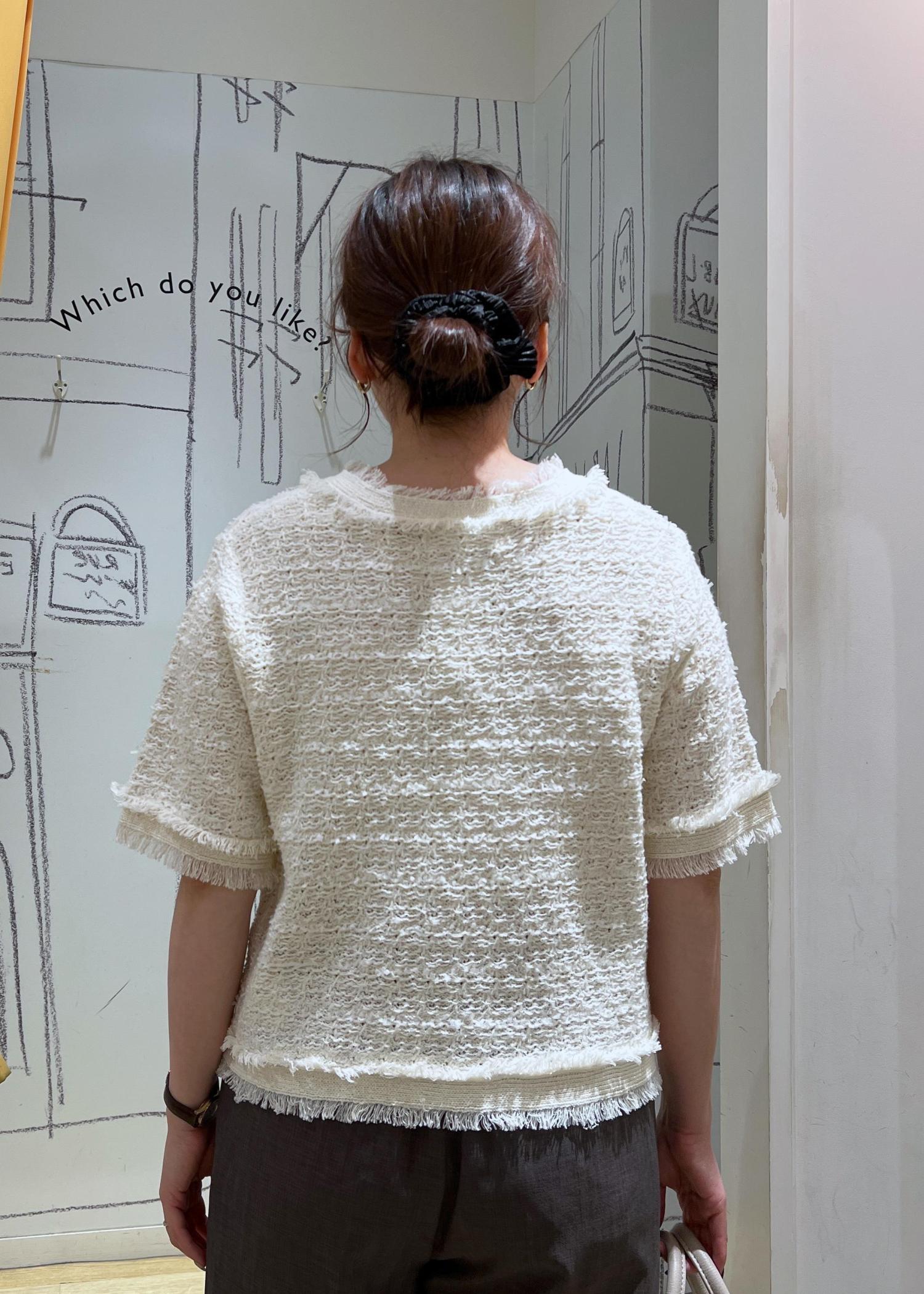薄手のサマーツイード素材で、柔らかいニット素材なのでチクチク感などは気になりにくかったです。
