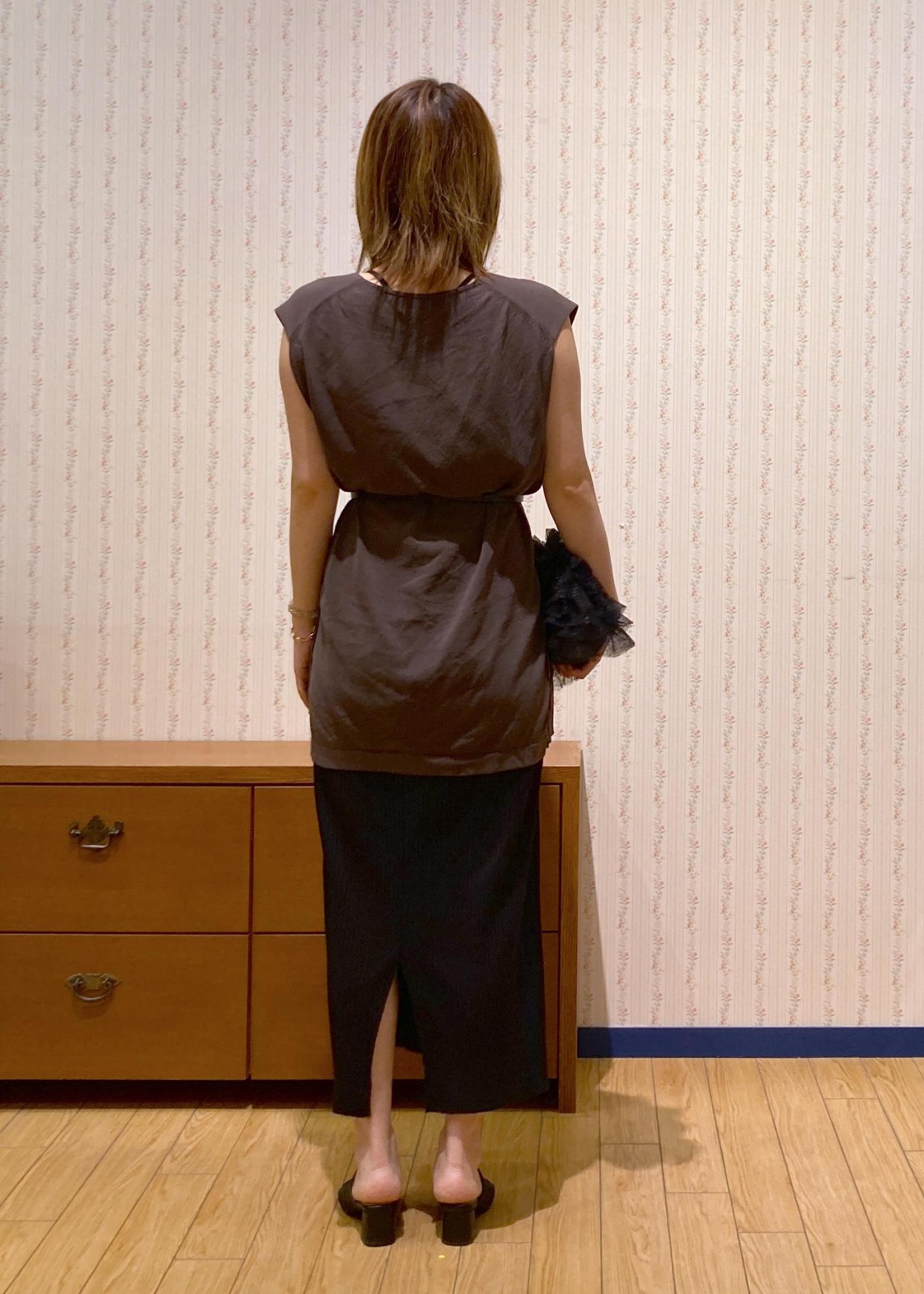 長めのトップスは細いベルトでウエストマークしてスッキリ見えるようにしたのがポイントです!