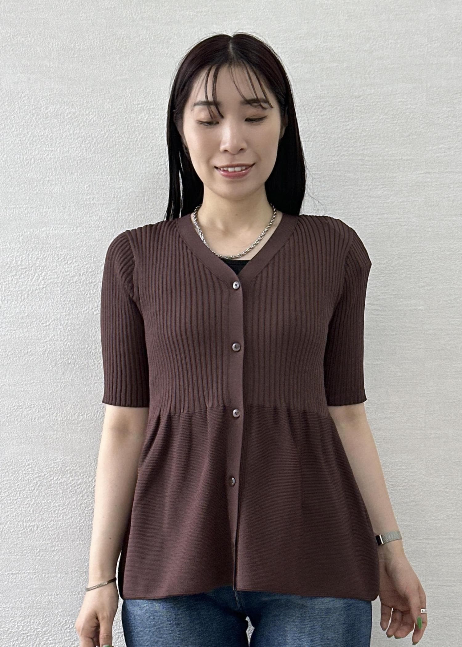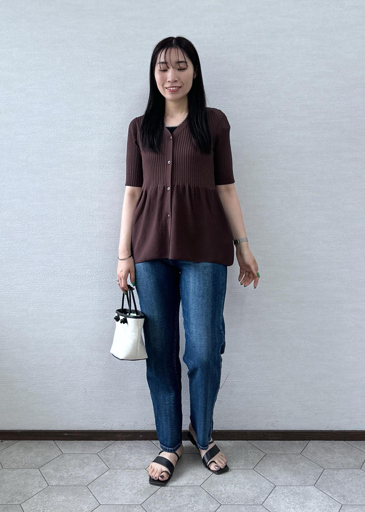 ペプラムシルエットで少しフェミニンさのあるカーディガンを主役にしたコーデ。