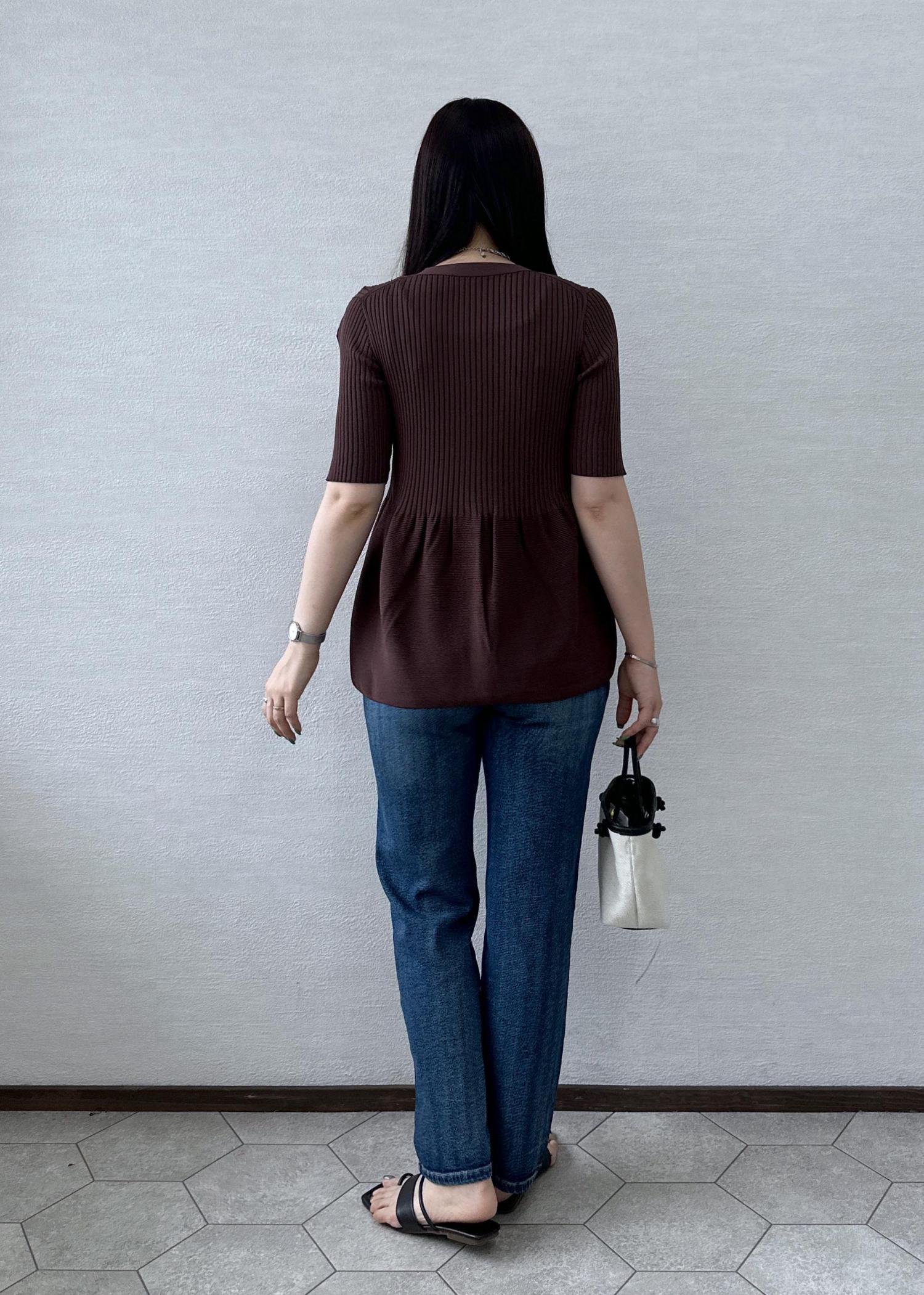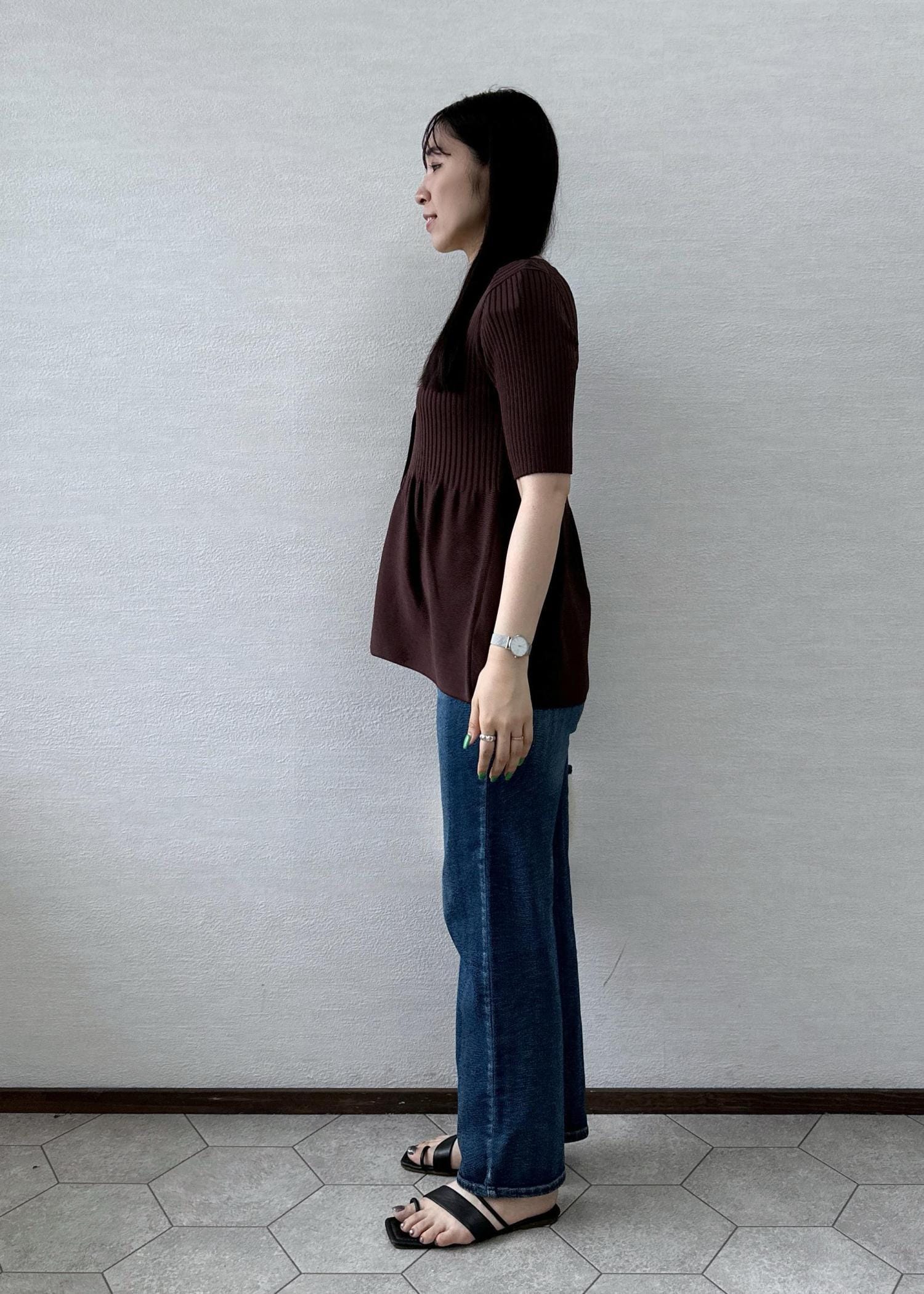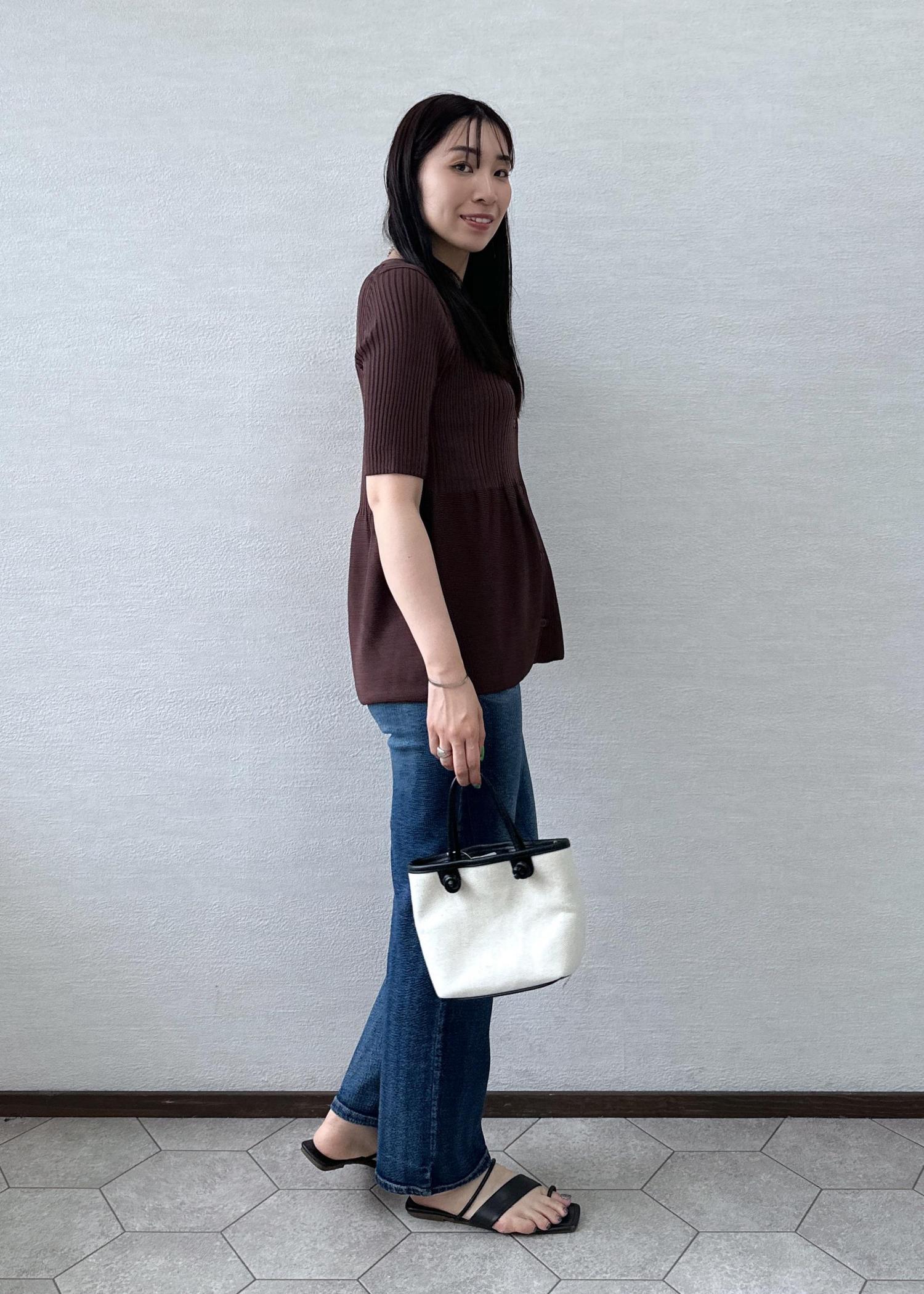 カラーはブラウンを選ぶことで大人っぽくなり、パンツはデニムを合わせることでカジュアルさをプラスしました。