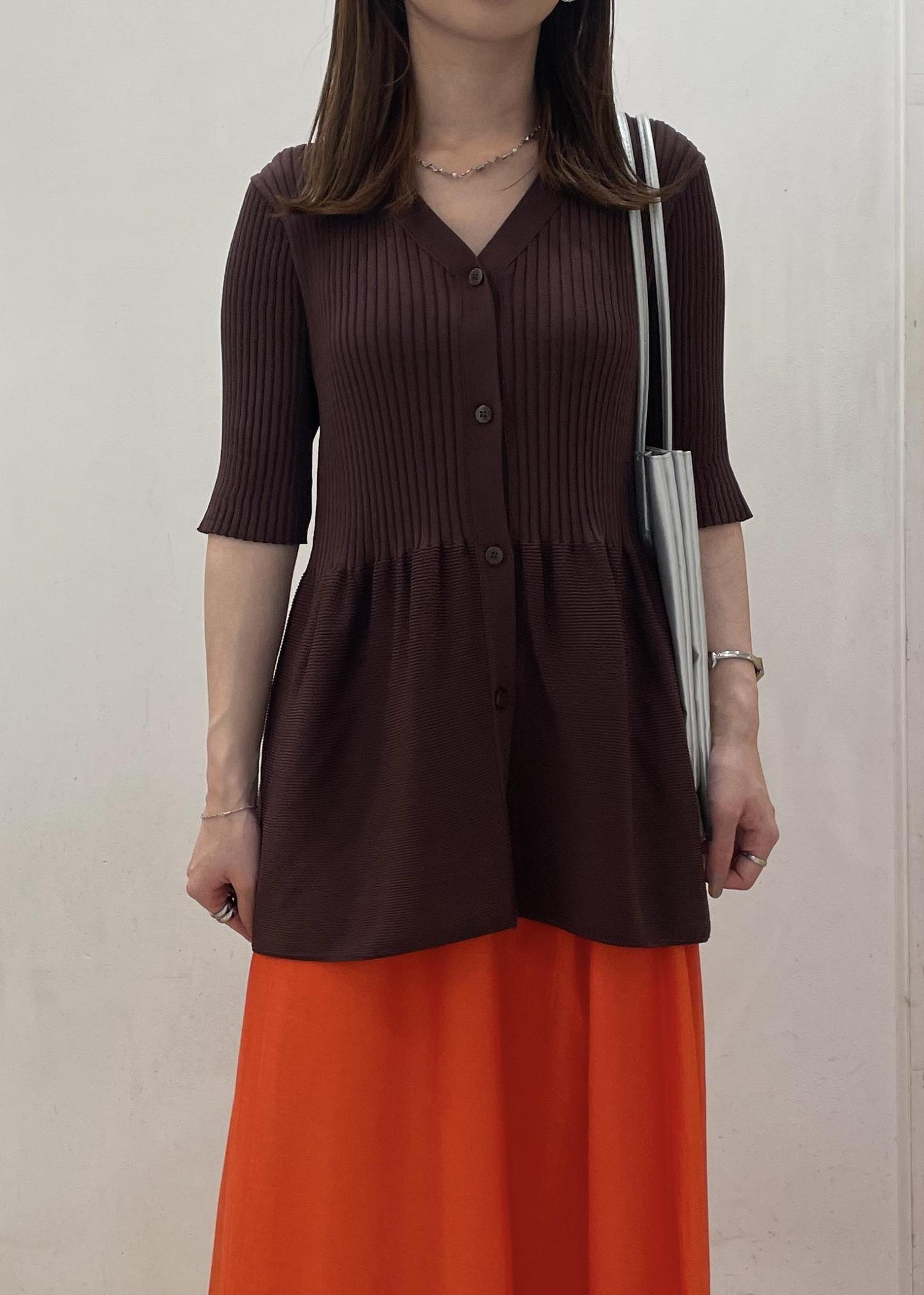 リブのフィット感とペプラムデザインが女性らしいトップスにコーデの主役になるカラースカートを合わせました☺︎