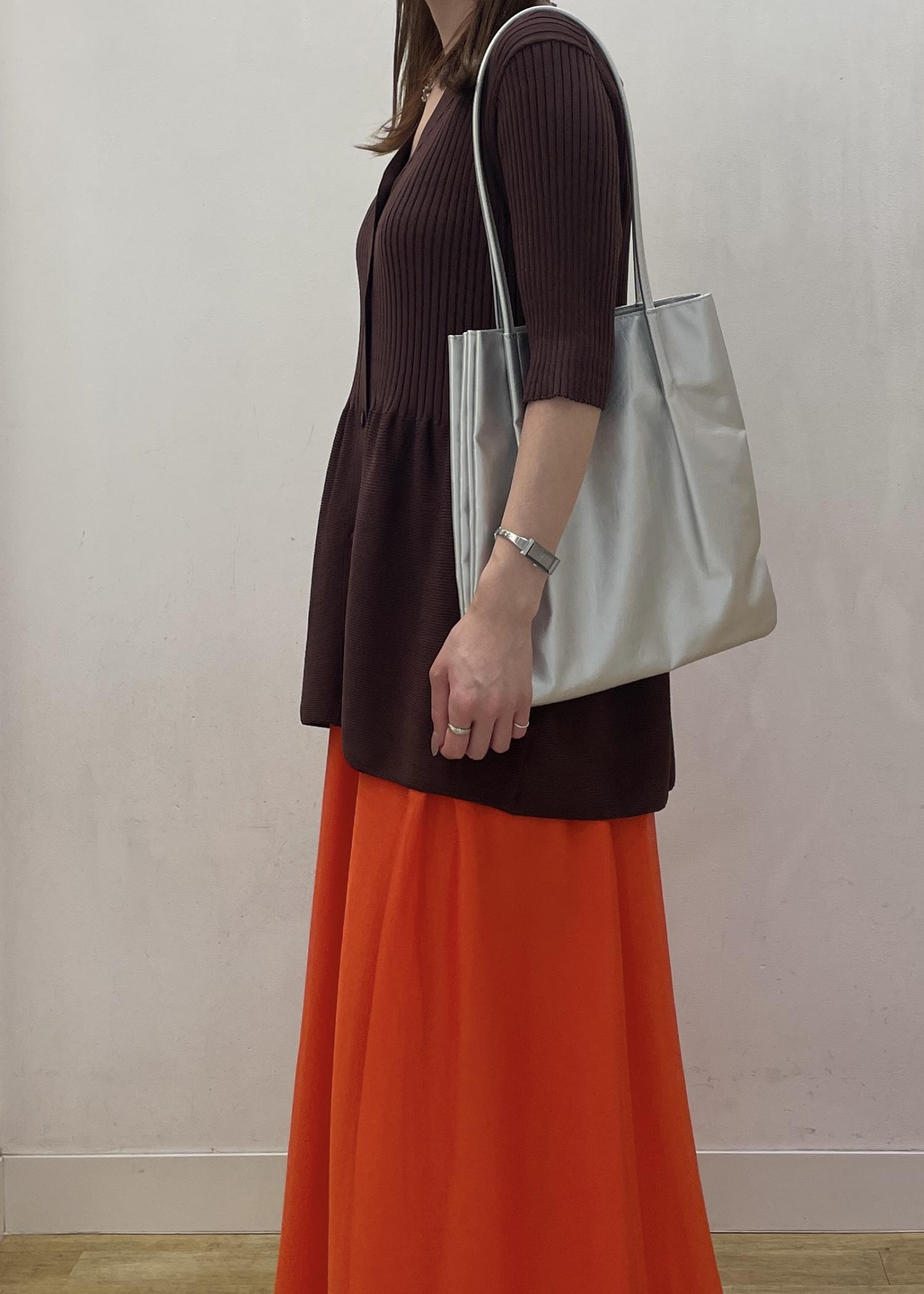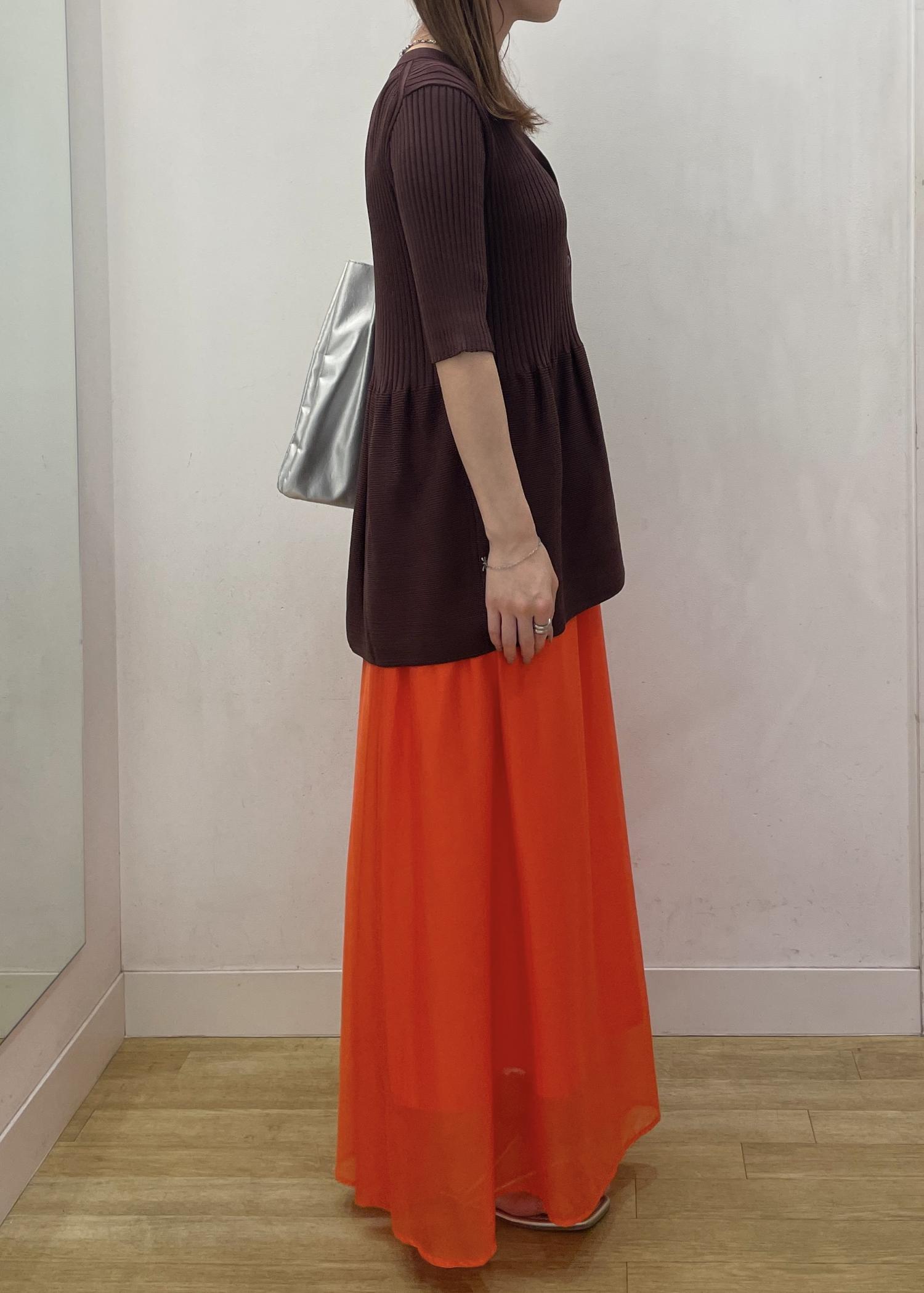 ROPÉ PICNICエアリーシアーギャザーロングスカートオレンジ / 38¥6,490レビューサラッとした柔らかい質感でウエストは総ゴムになっていて窮屈感無く快適な履き心地です。