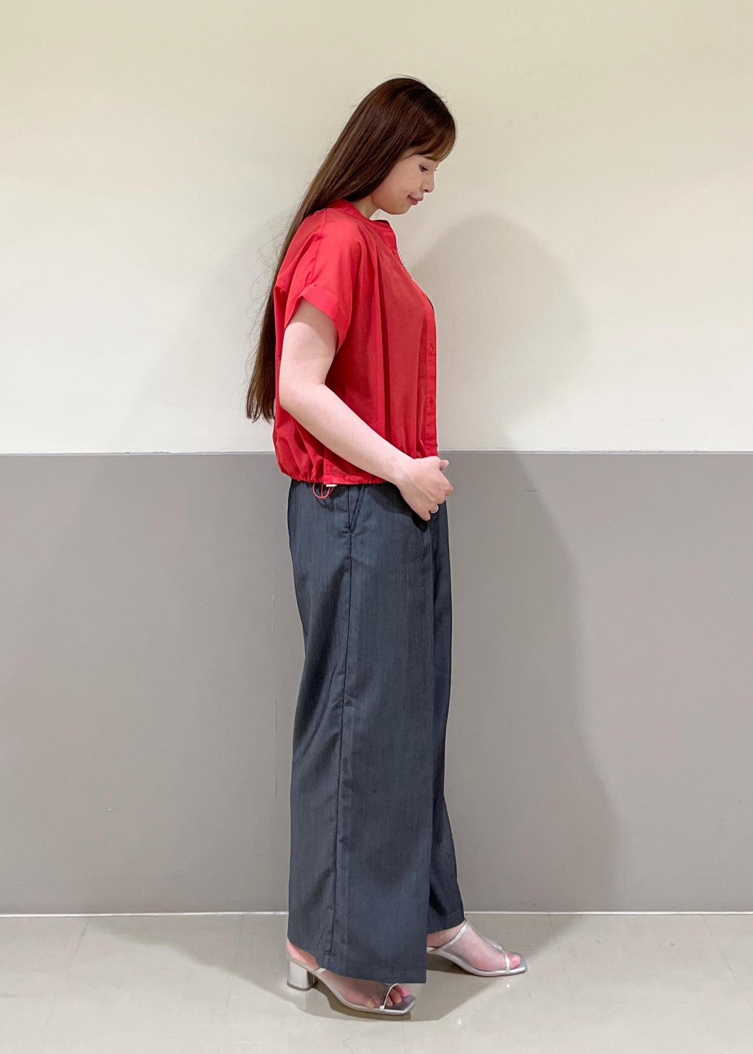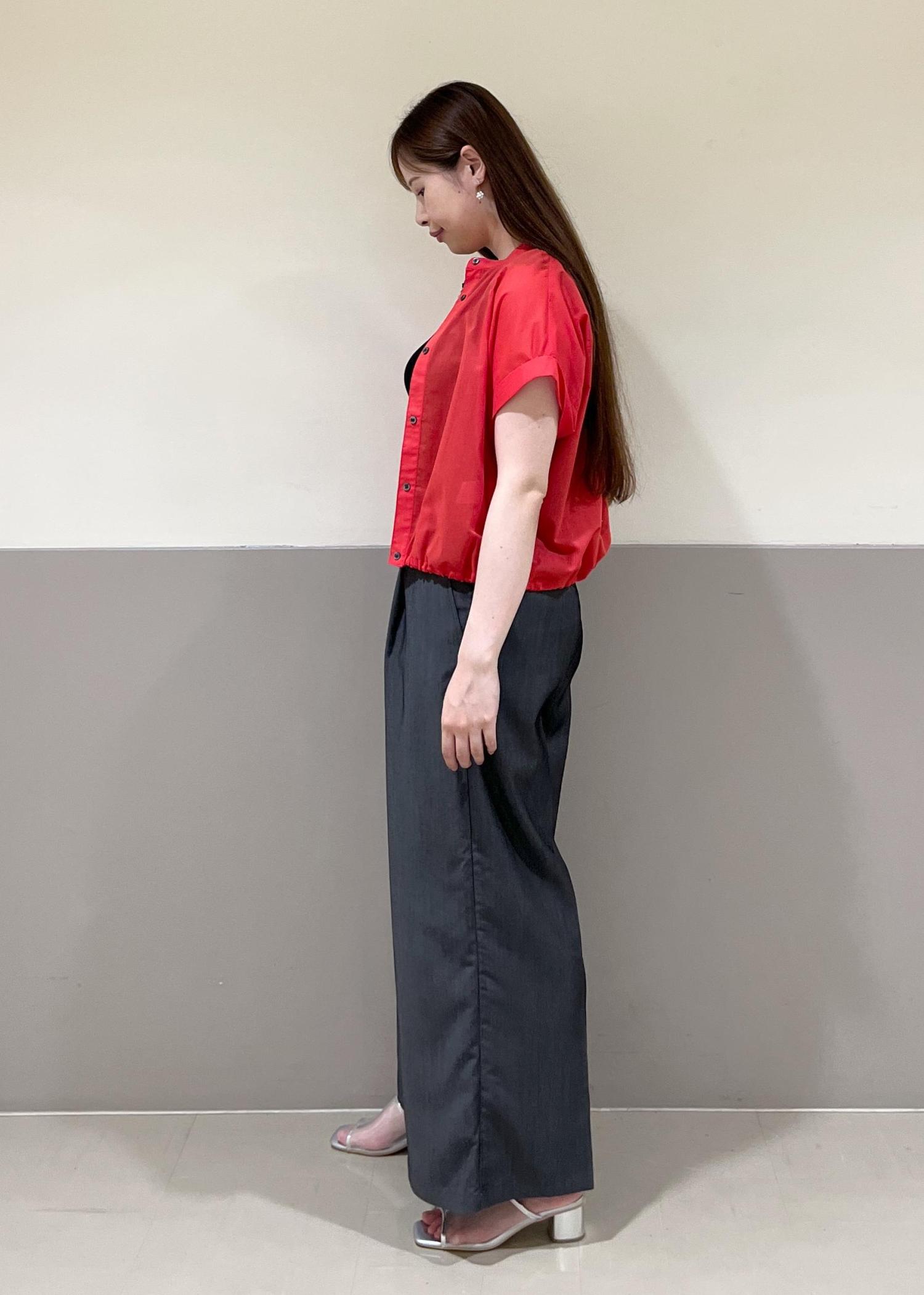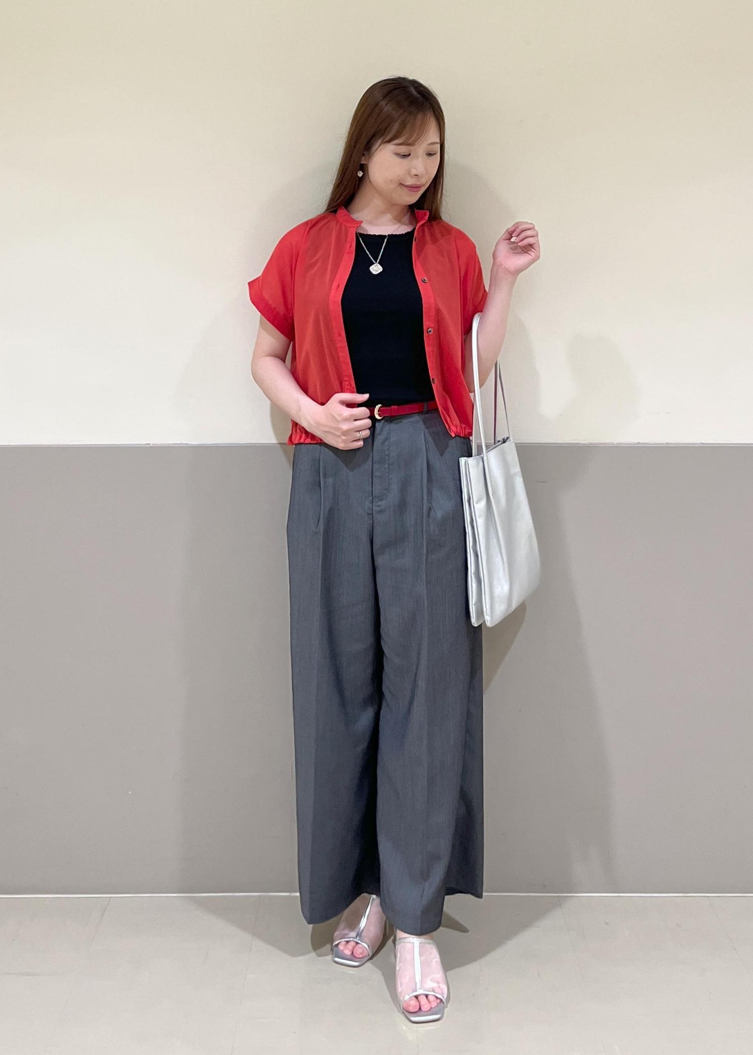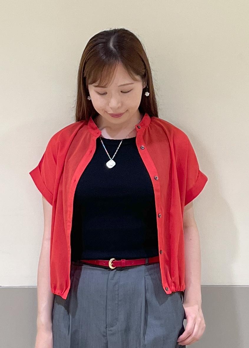 パッと目を引く、鮮やかなレッドを使ってコーディネートを組んでみました!インナーをブラックにして、大人でも楽しめるビビットカラーのシャツコーデです!