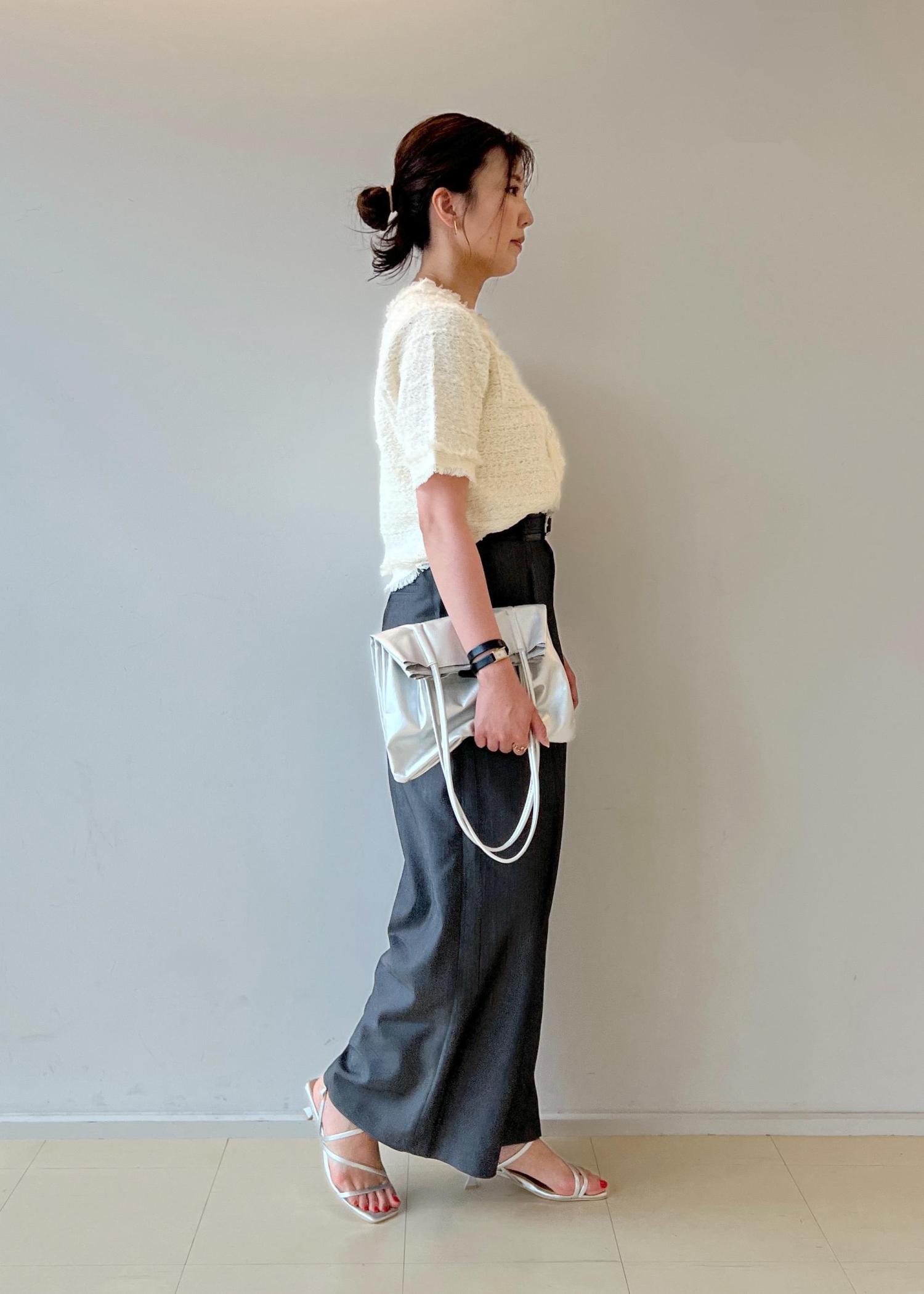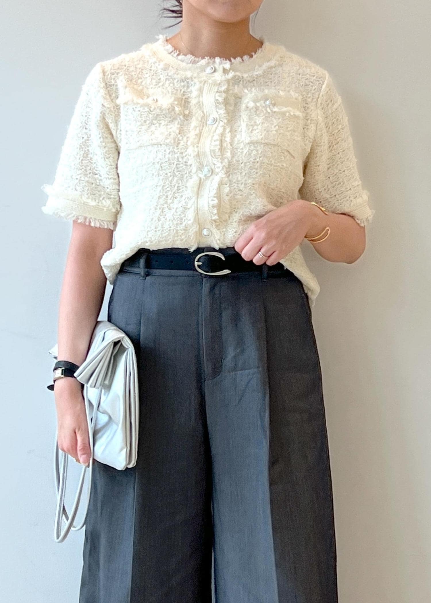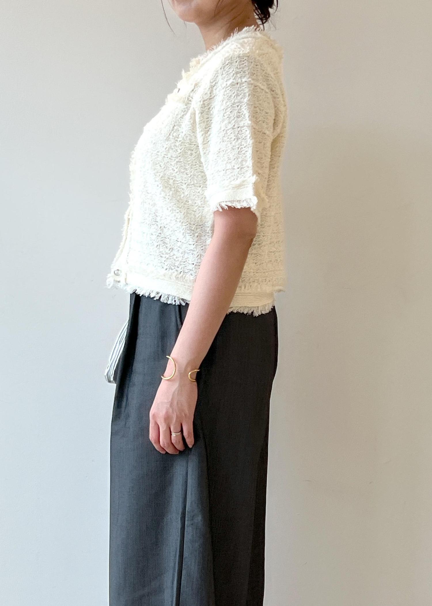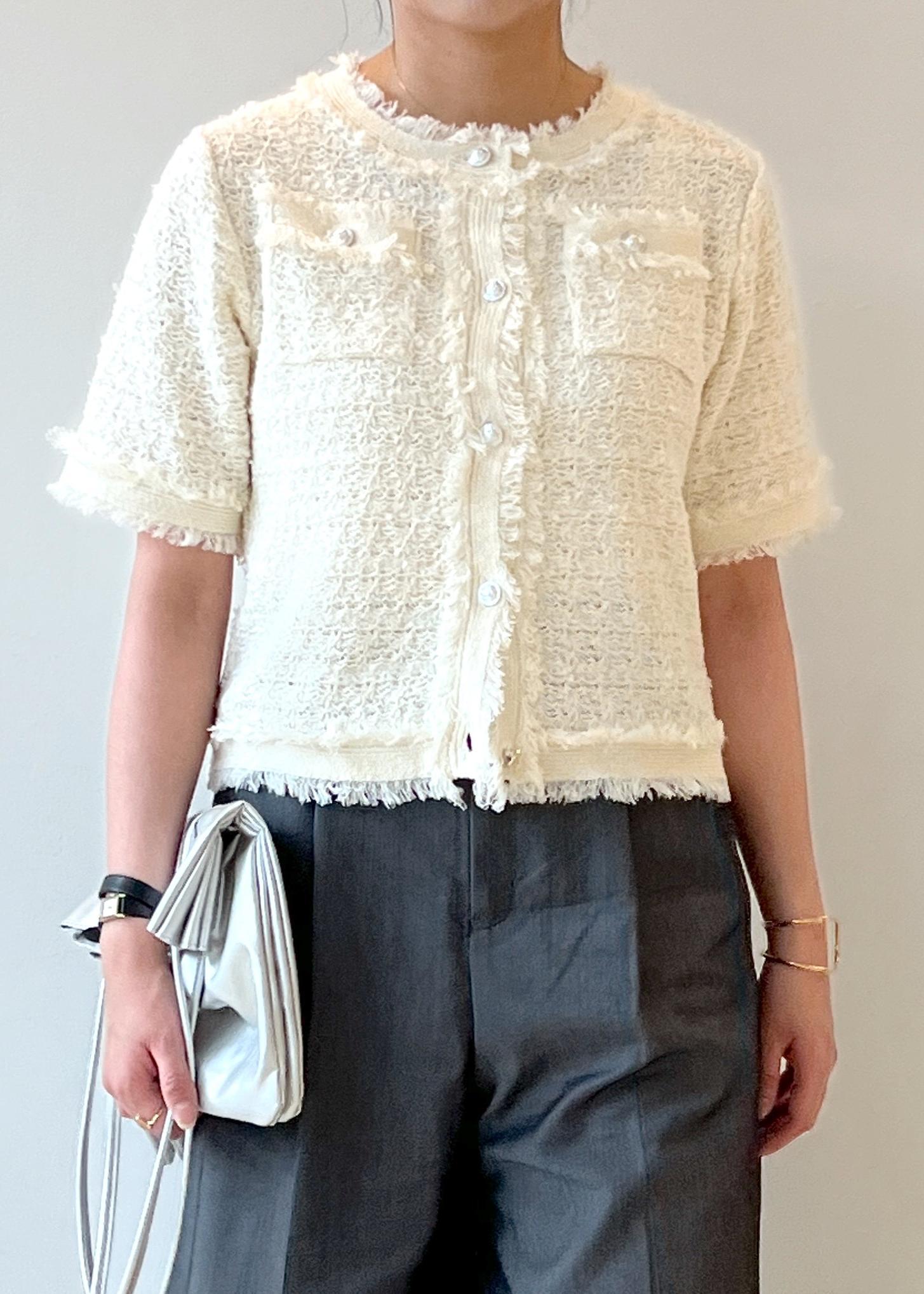 お仕事にもプライベートにも使える、ツイードカーディガンです。ボトム次第でテイストを変えられるので、様々なシーンにご利用頂けます。