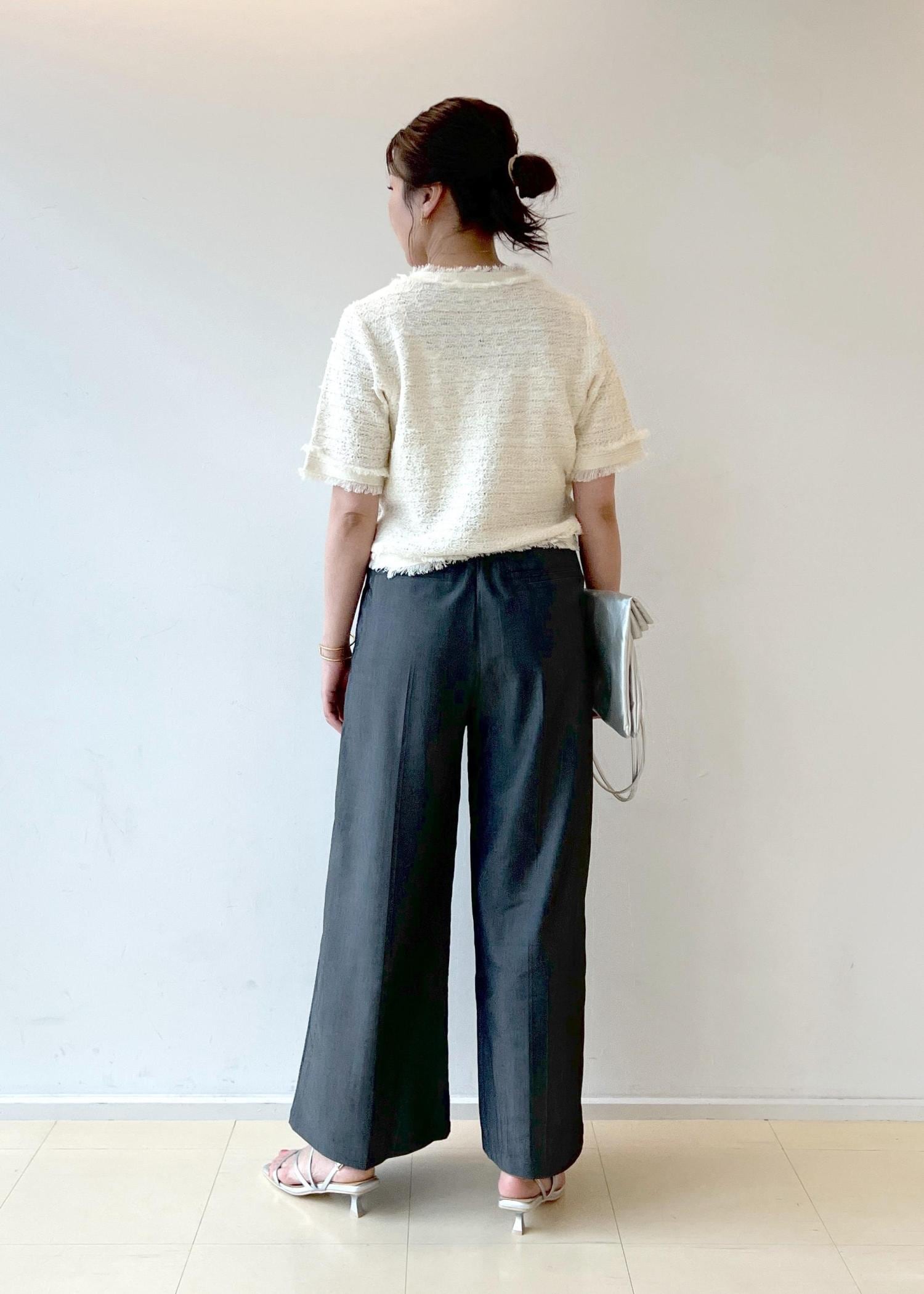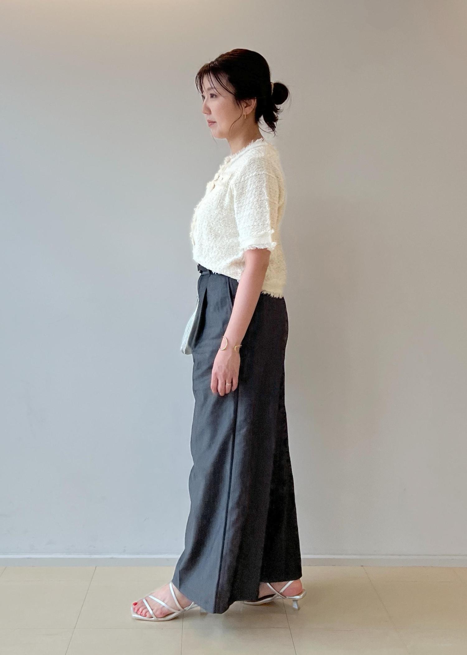 サラッとした素材で涼しくお召しいただけます。ヒップ周りはスッキリ、裾にかけてフレアになったラインで、キチンと見えするボトムです。