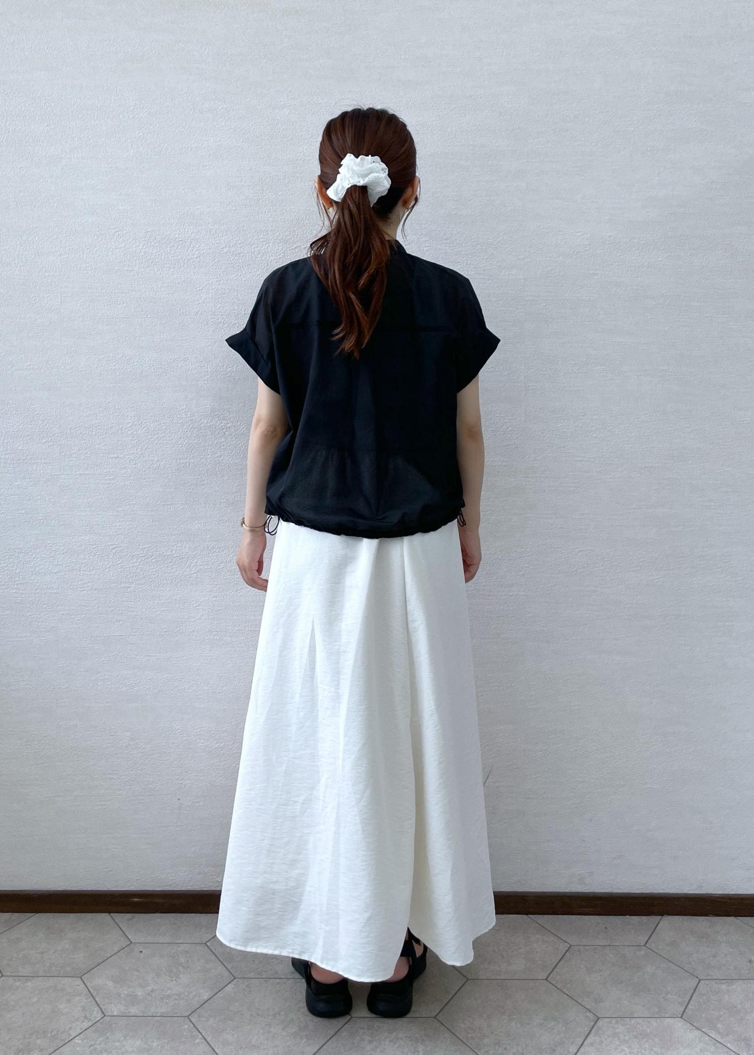 トップスの裾を絞って一工夫することでシンプルすぎず、おしゃれ感がアップします!フレアなスカートを合わて、可愛さと綺麗さを兼ね揃えたコーデに♪