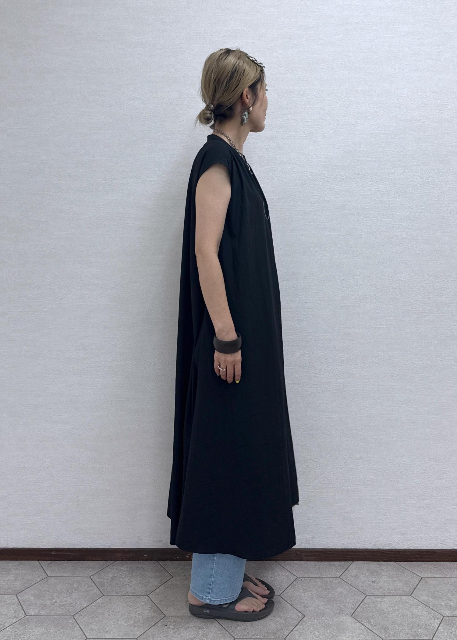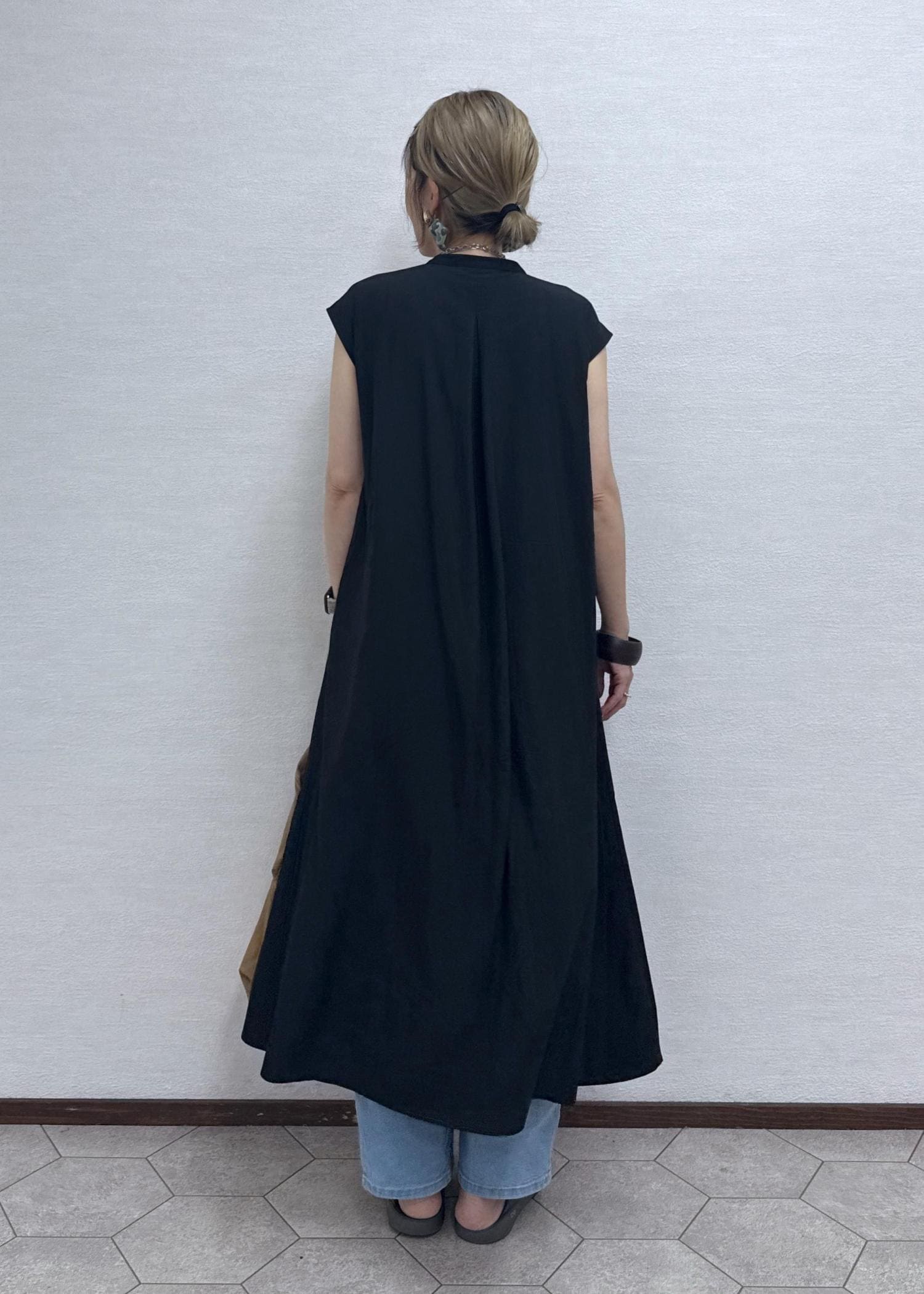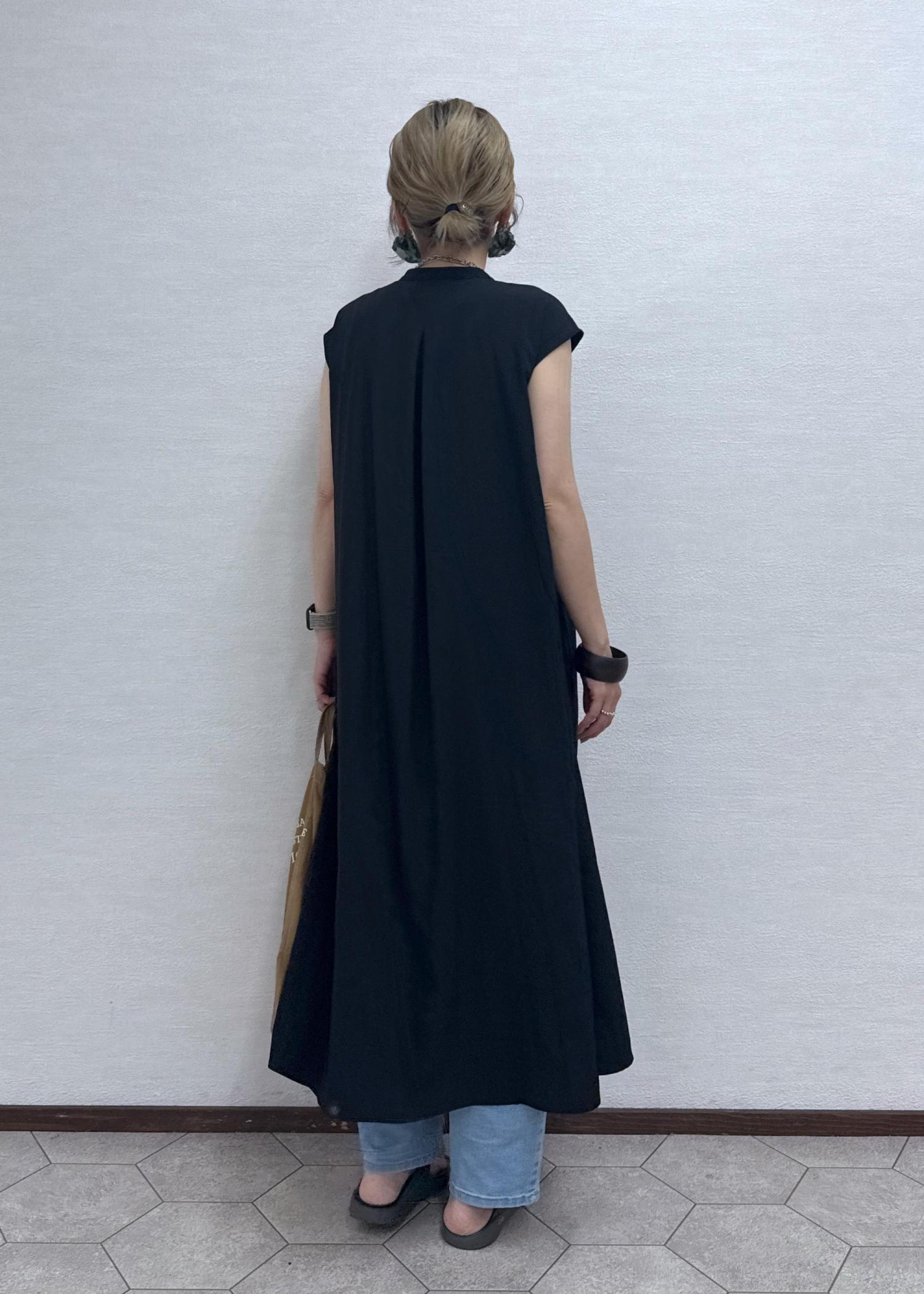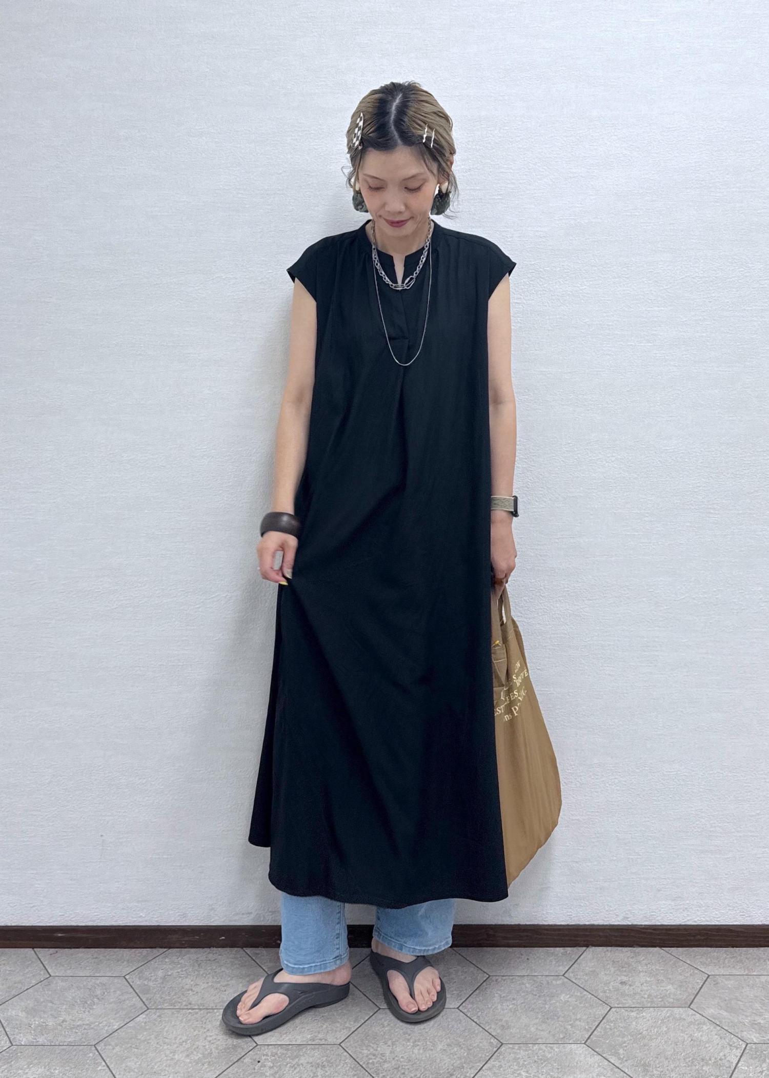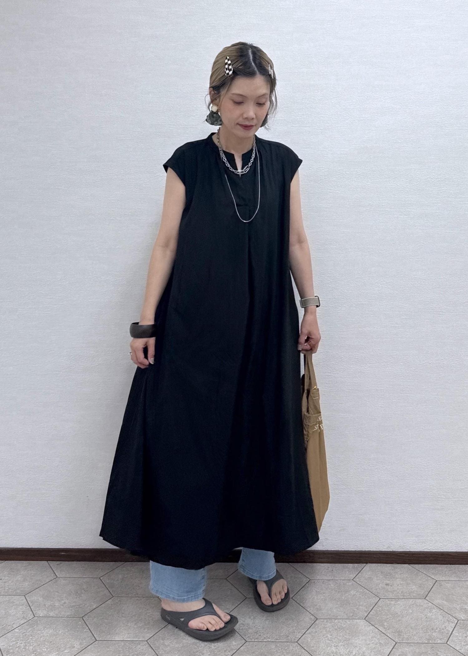 1枚でもシンプル可愛いスキッパーワンピースに、デニムをレイヤードした、こなれ感のある大人カジュアルコーデです。