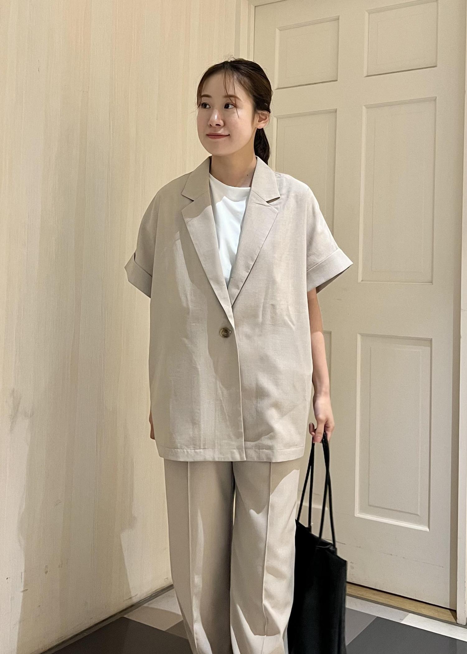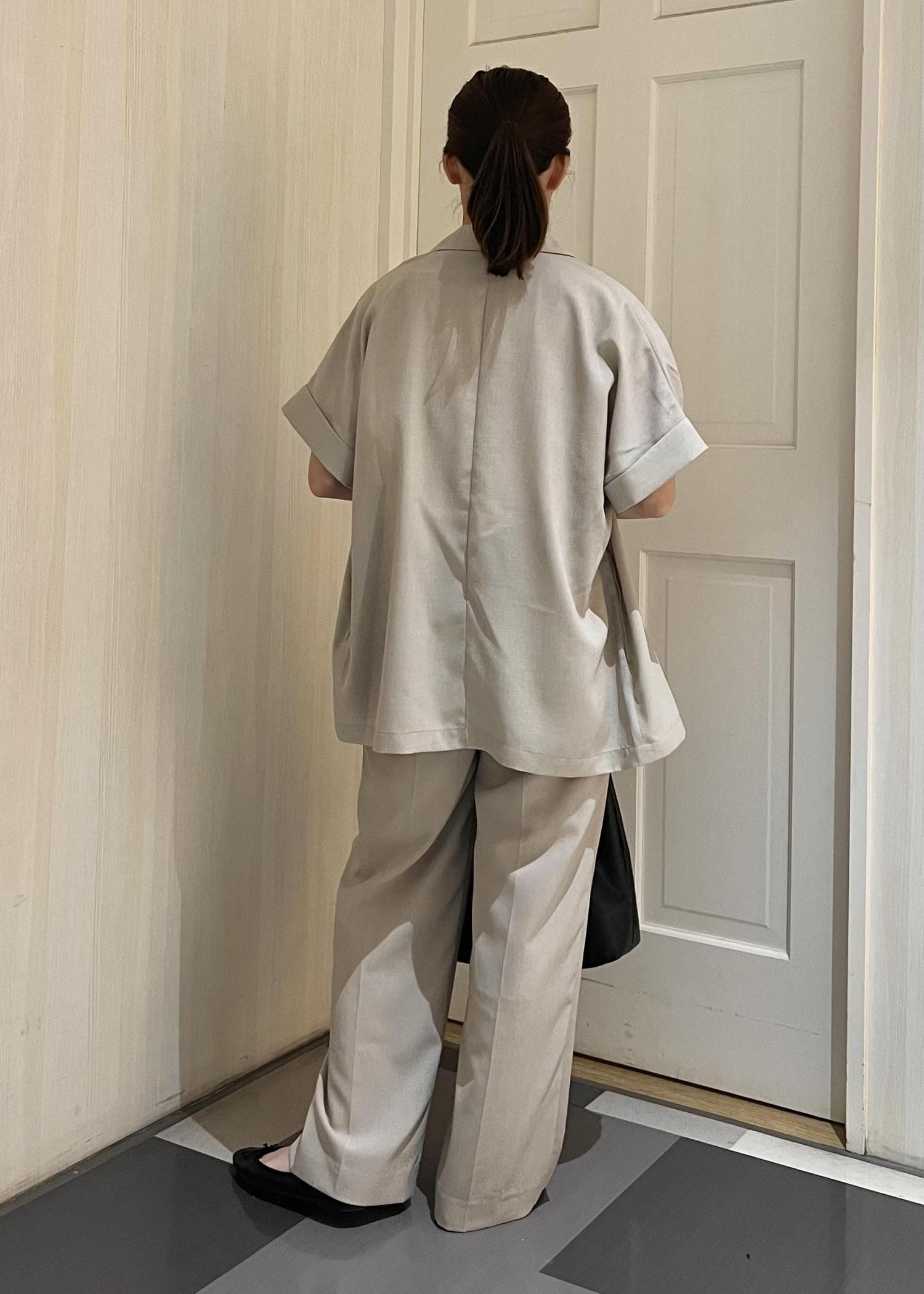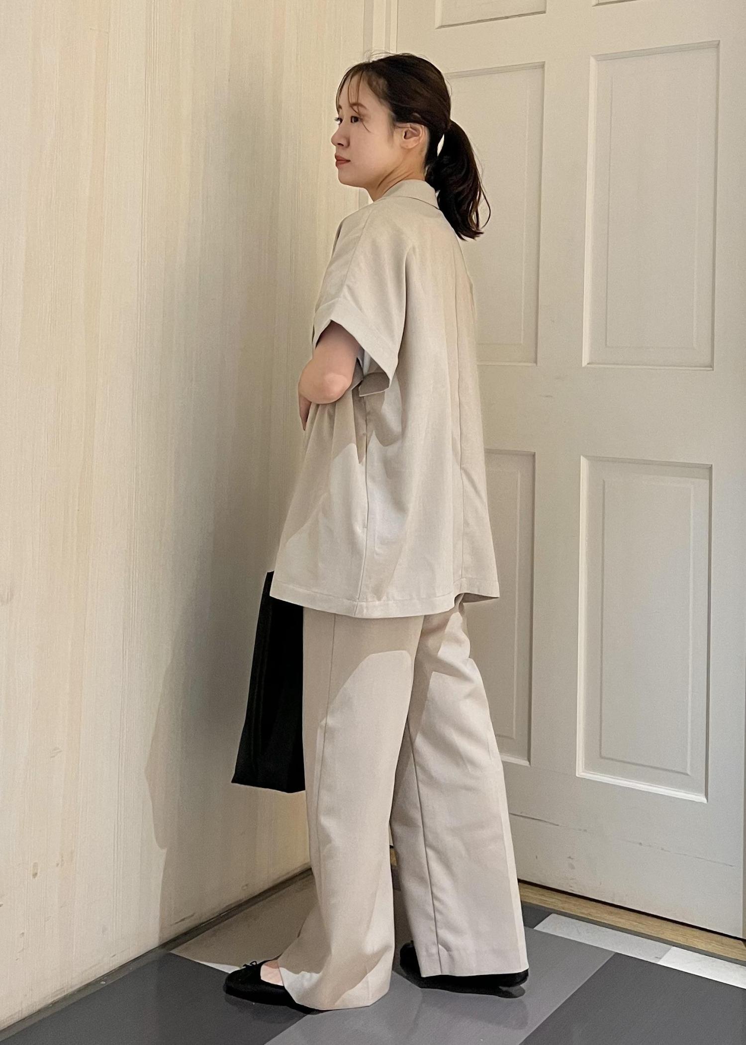 リネンライク素材のハーフスリーブジャケットとワイドパンツのセットアップコーデです。