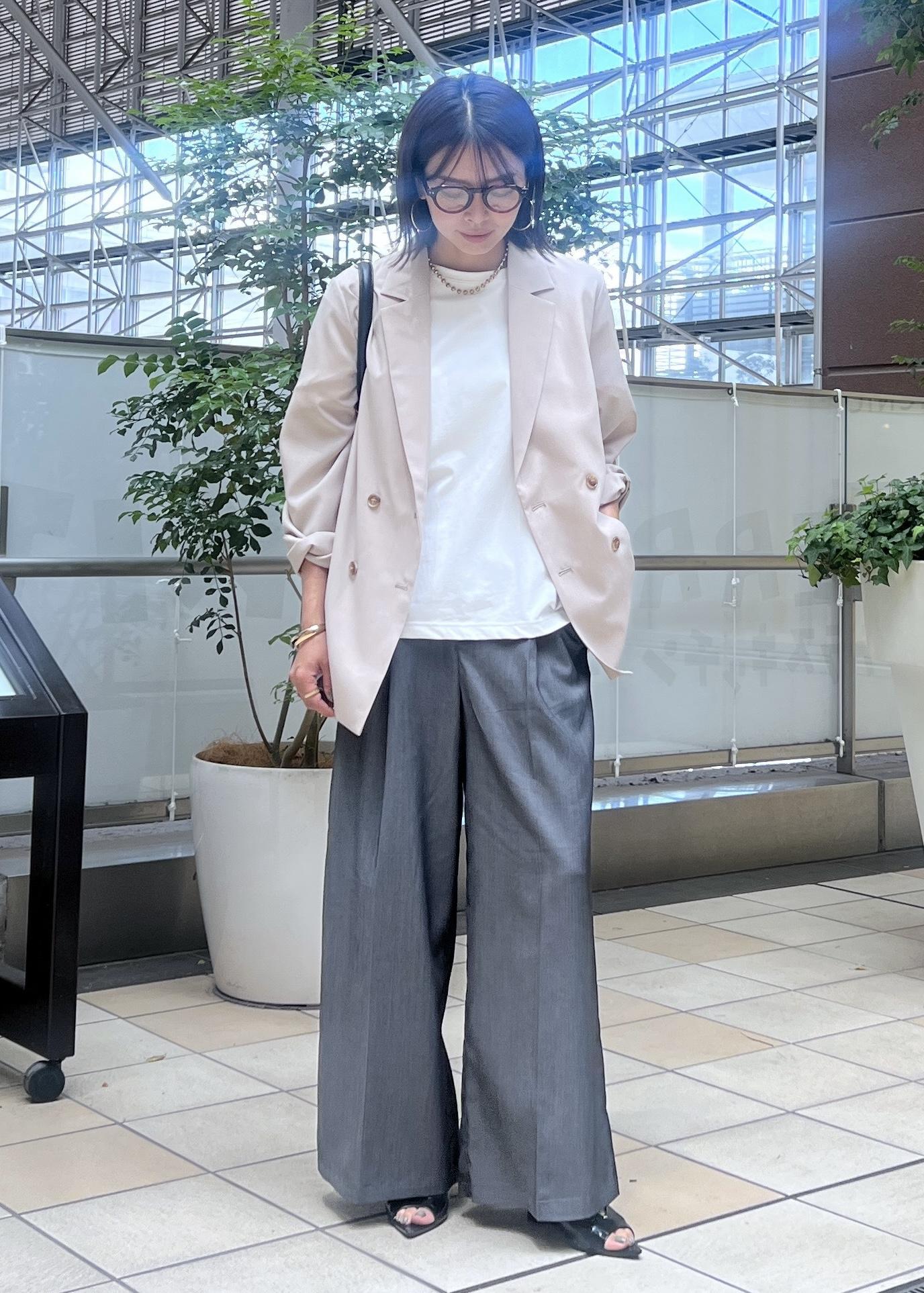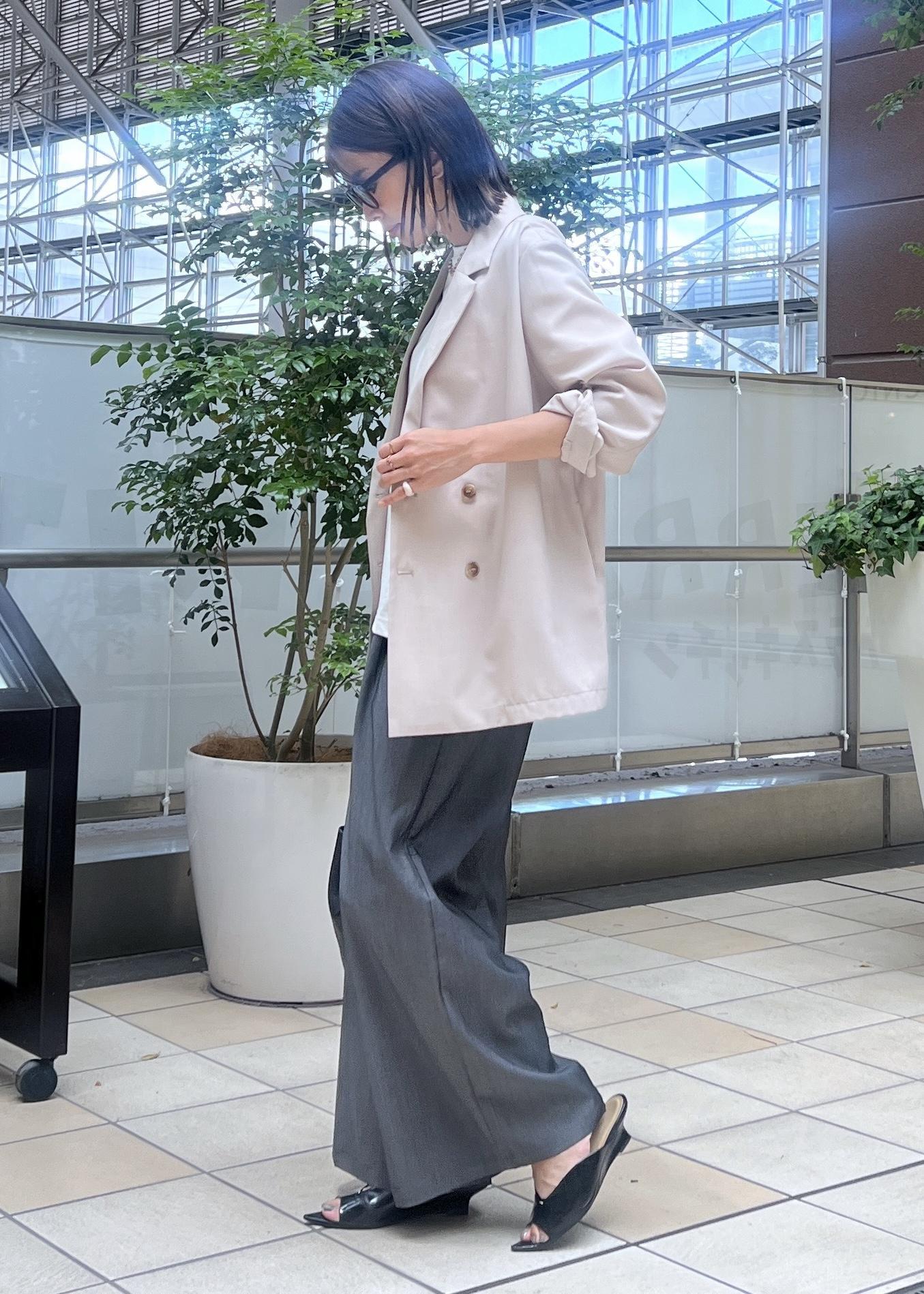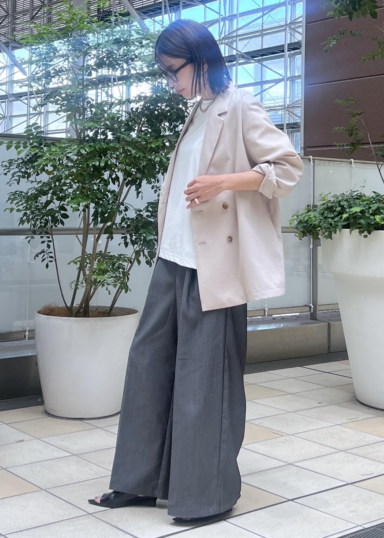 サラッと羽織やすいサマージャケットは、Tシャツ×タックパンツに合わせてきれいめカジュアルに。