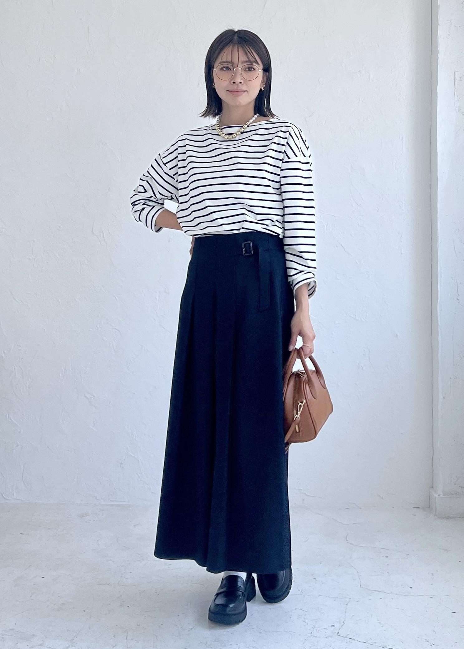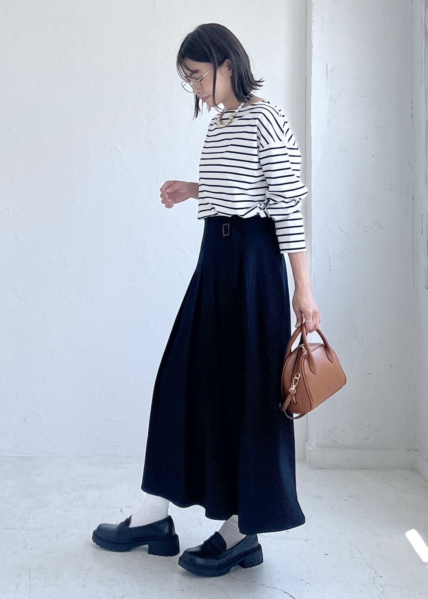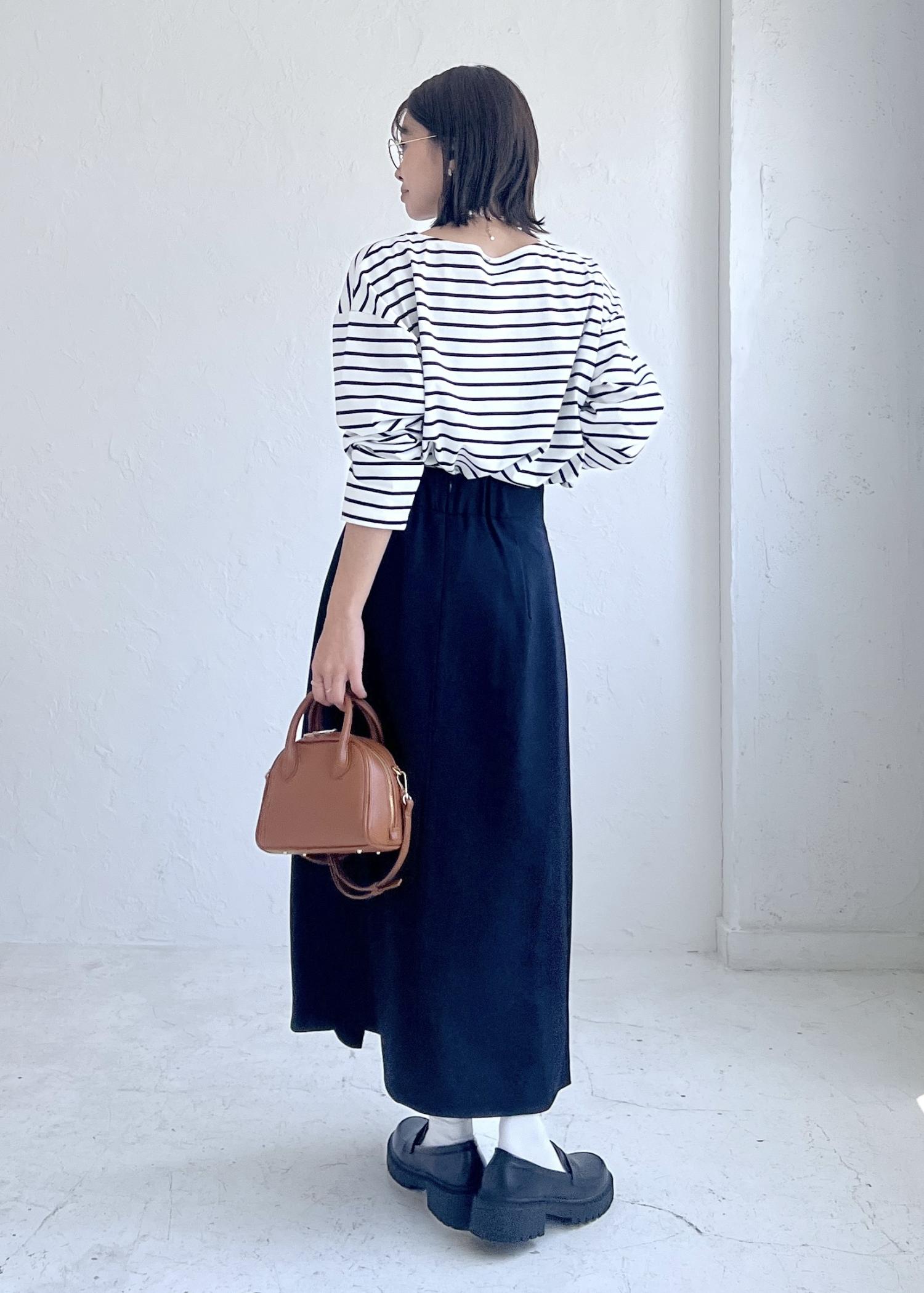 定番のボーダーカットソーには、ロングスカートを合わせてシンプルな大人カジュアルコーデに。