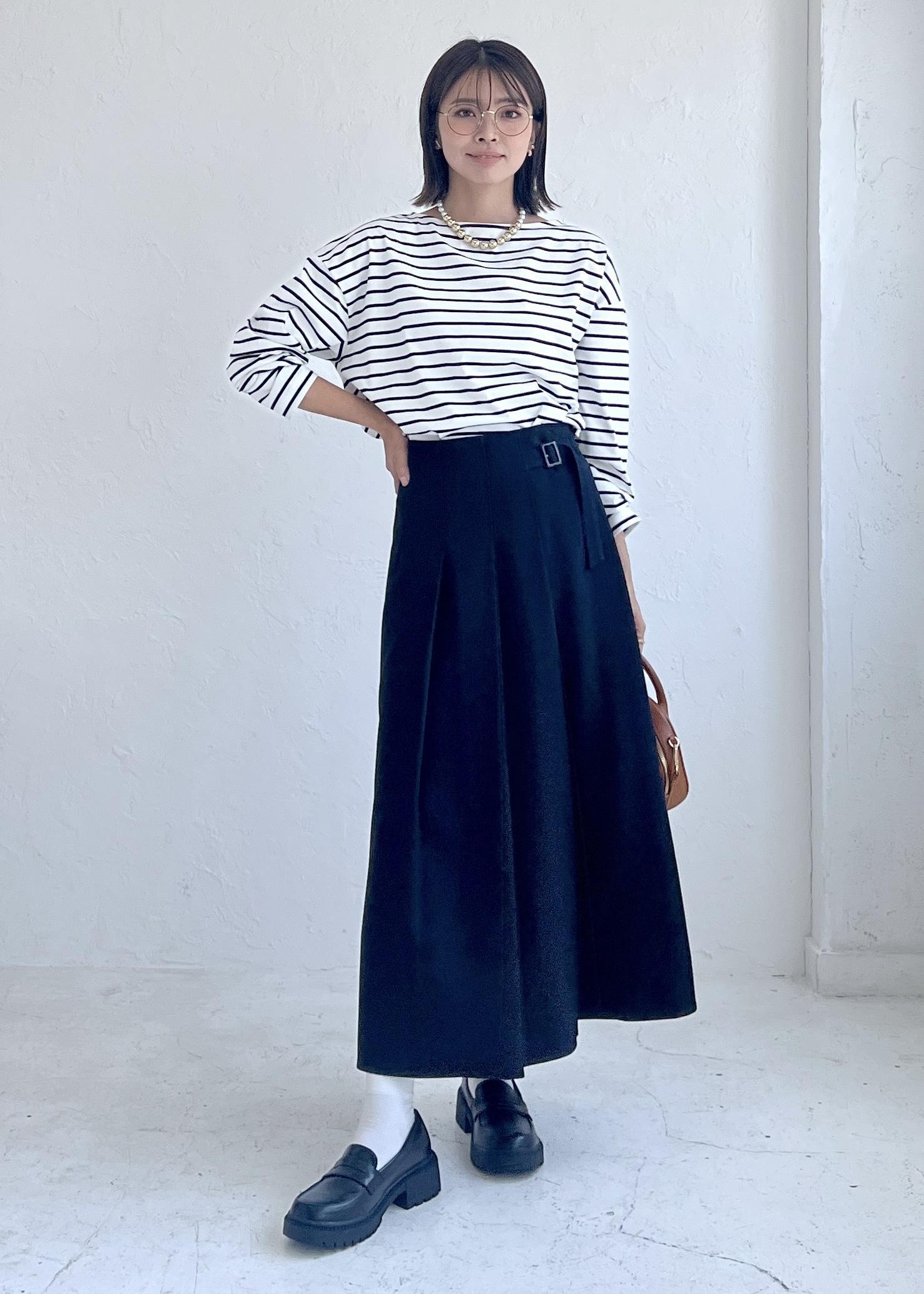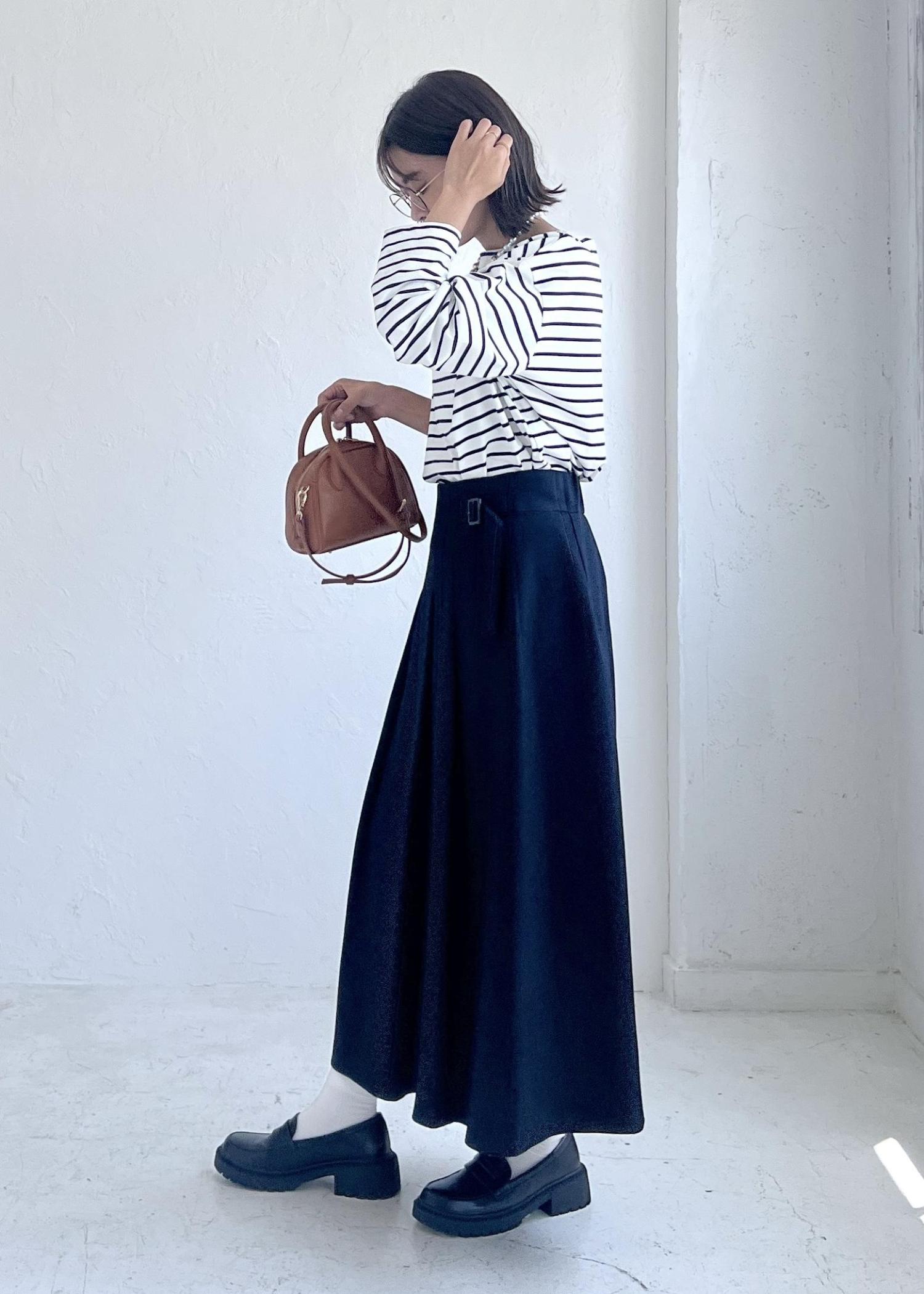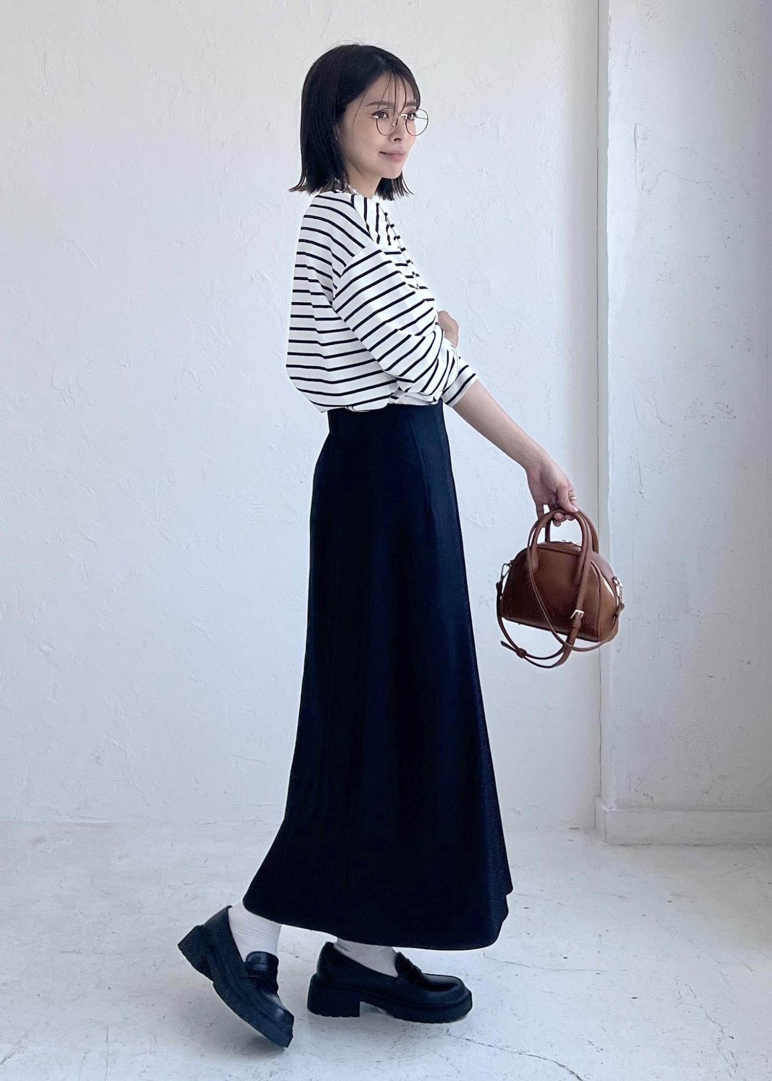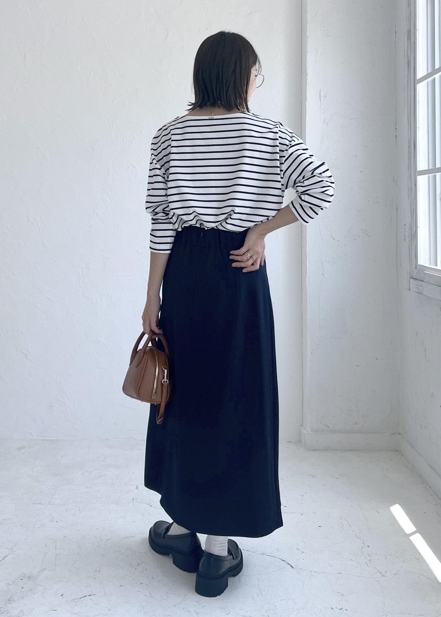 定番のボーダーカットソーには、ロングスカートを合わせてシンプルな大人カジュアルコーデに。