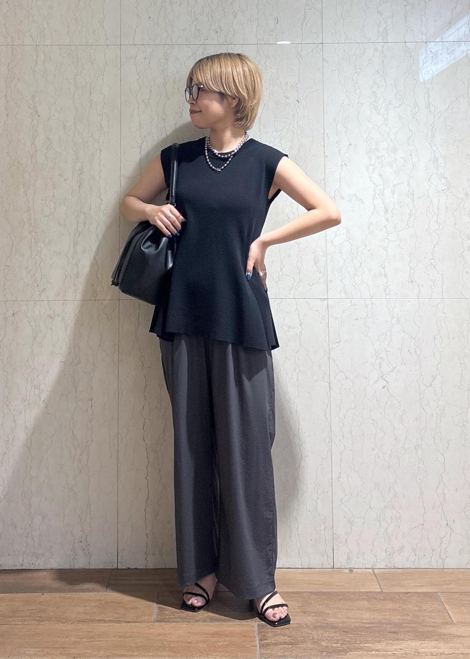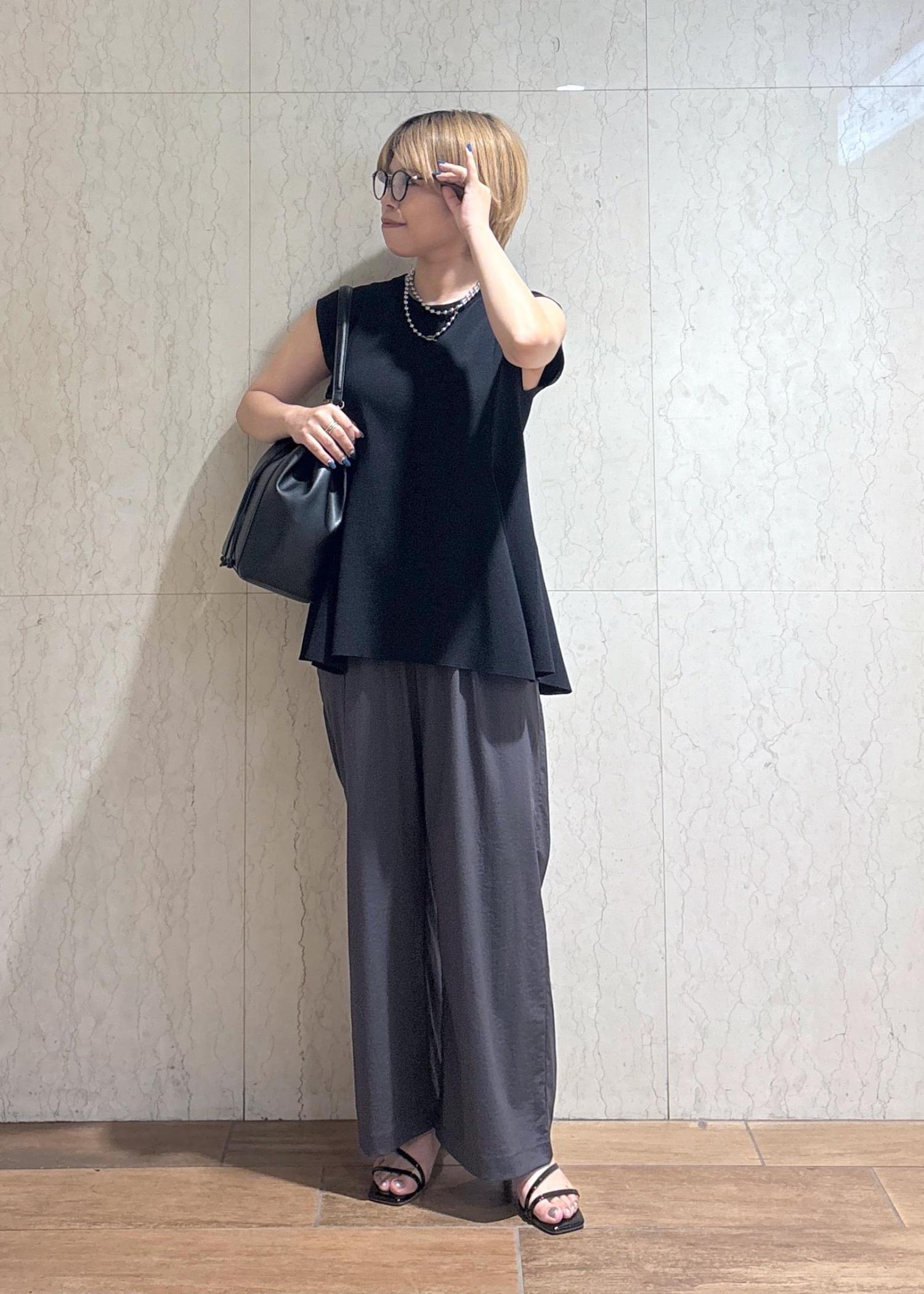 トップスを黒のスッキリしたキレイめなカットソーを選んだので、パンツをゆったりとしたカジュアルなパンツにして抜け感をだしたことがポイントです。
