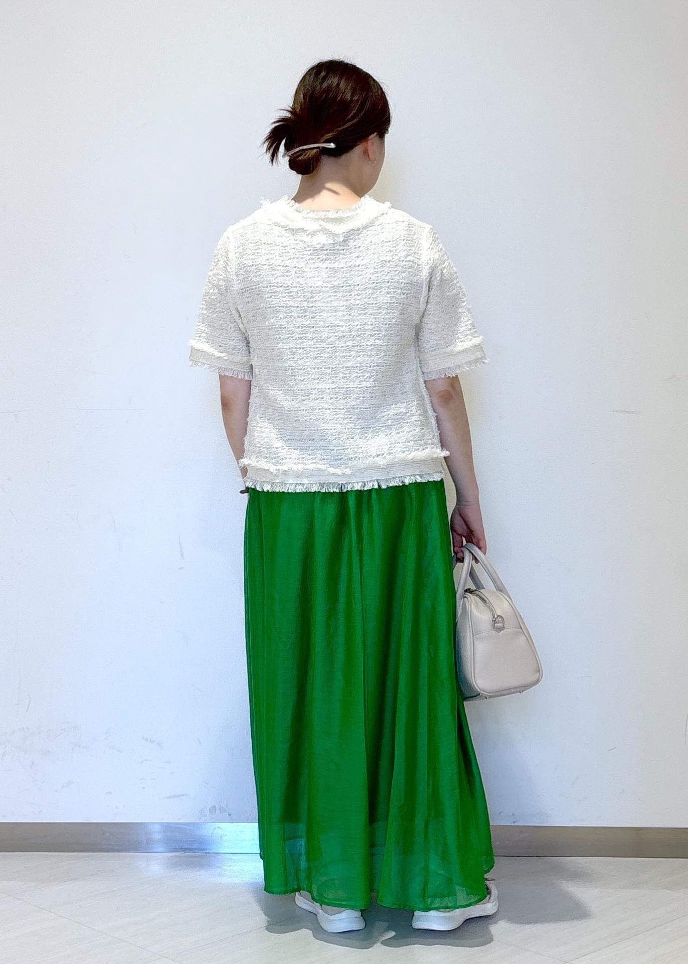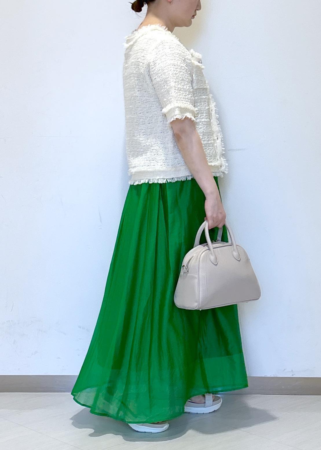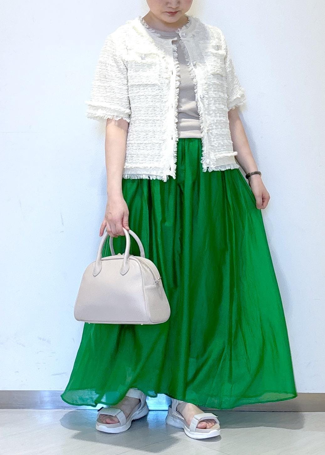 鮮やかなグリーンのスカートが爽やかに見せてくれるスタイリングです。