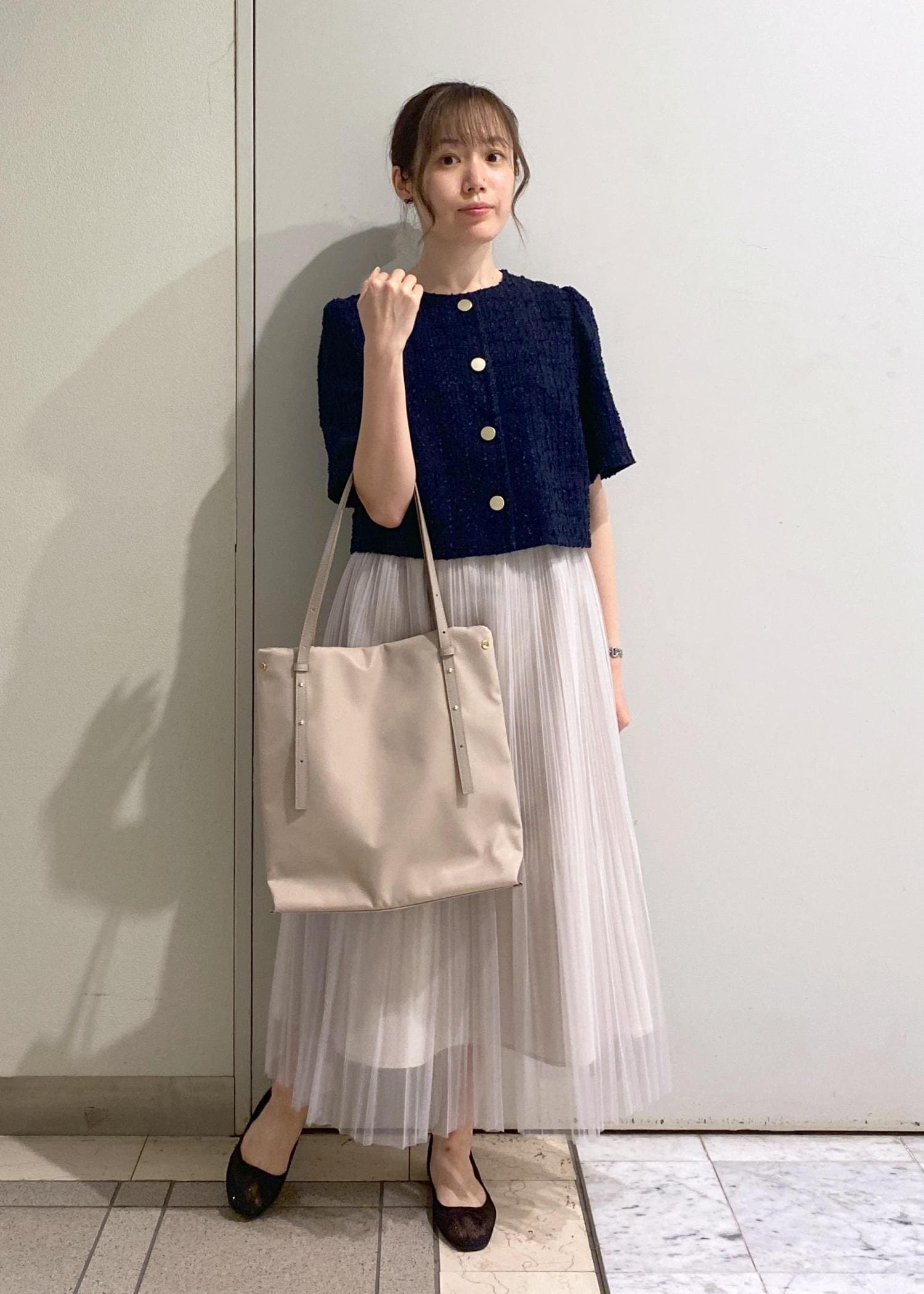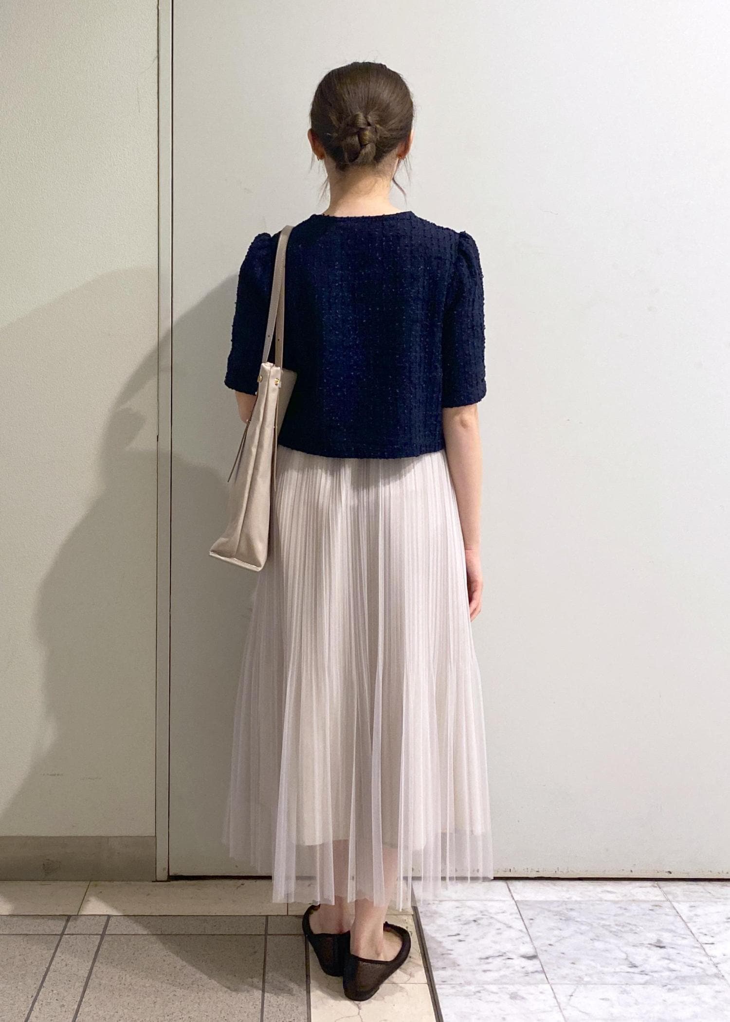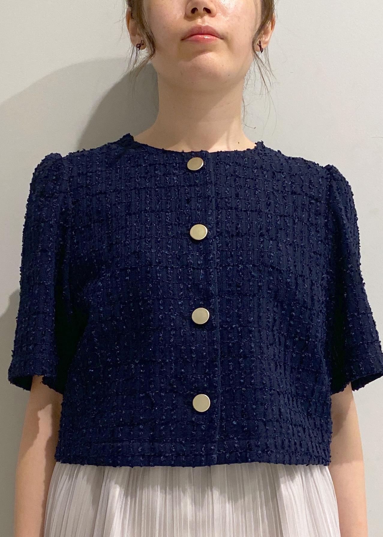 高級感のあるツイード素材にゴールドのボタンがかわいい、春夏にぴったりの1枚。