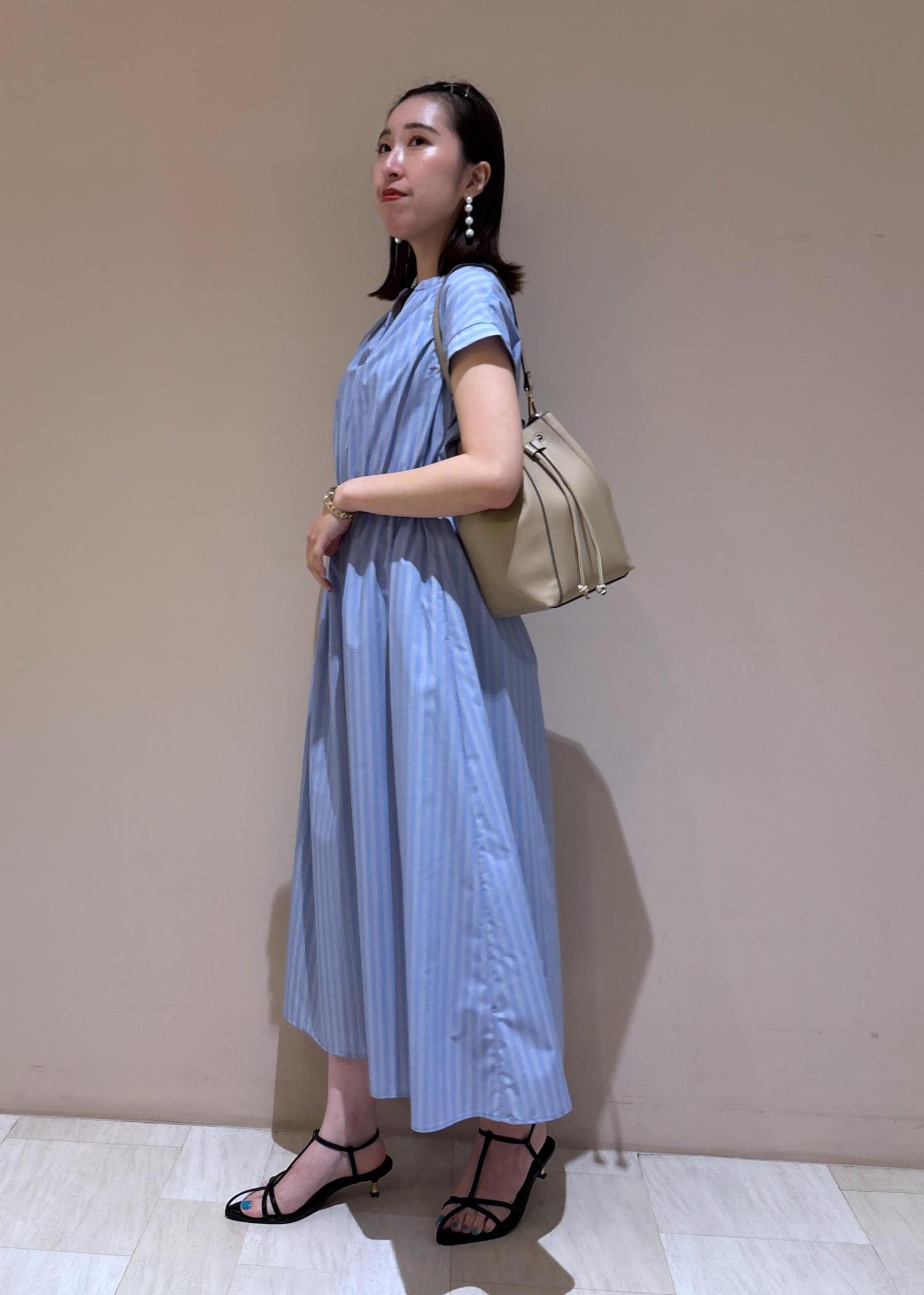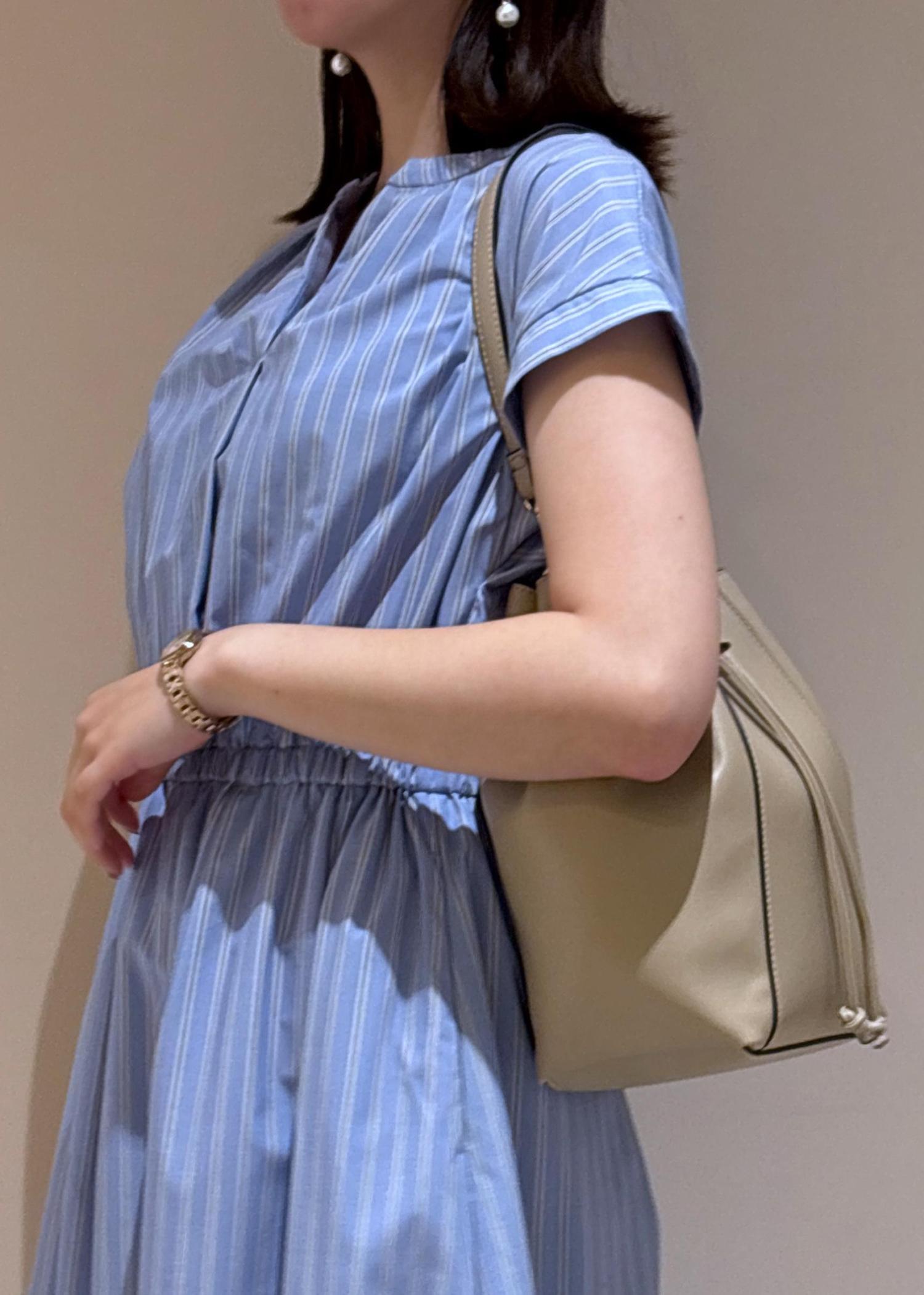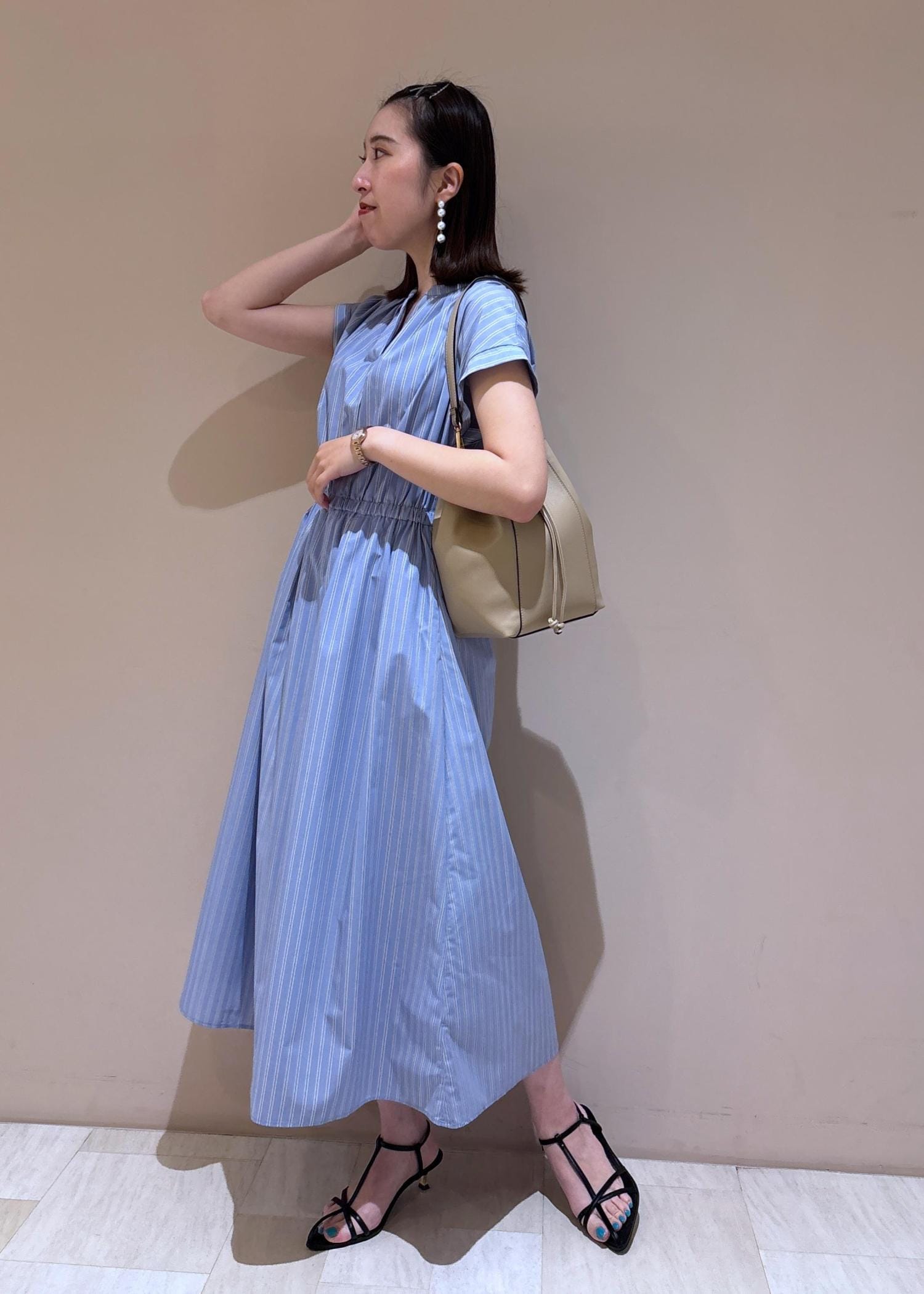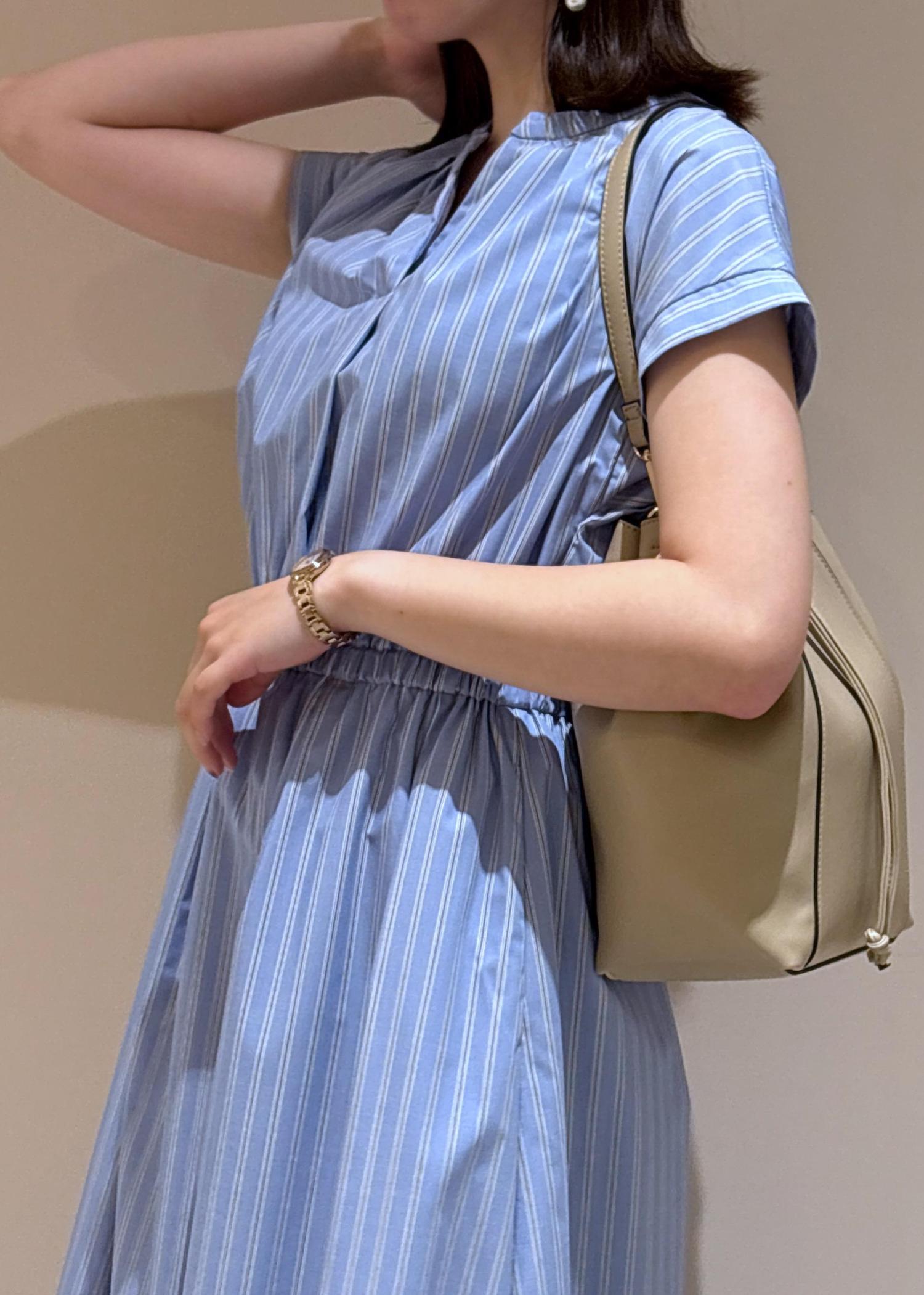 一枚着でも映えるストライプ柄ワンピースは、小物で明るくするとよりオシャレ見えします。