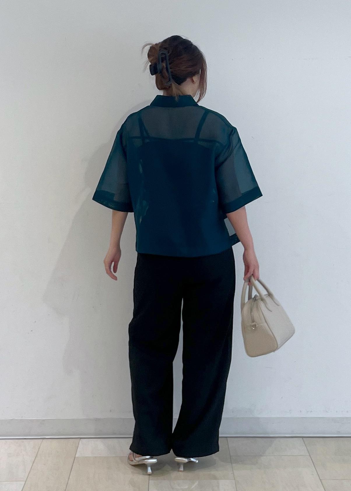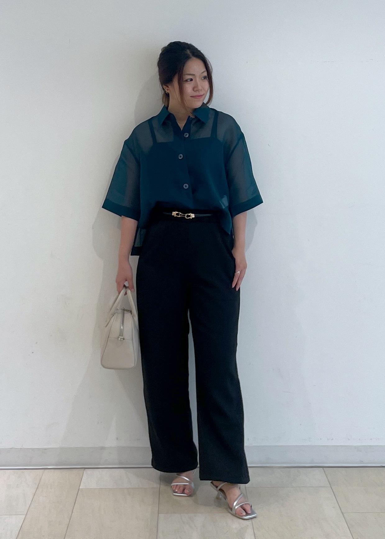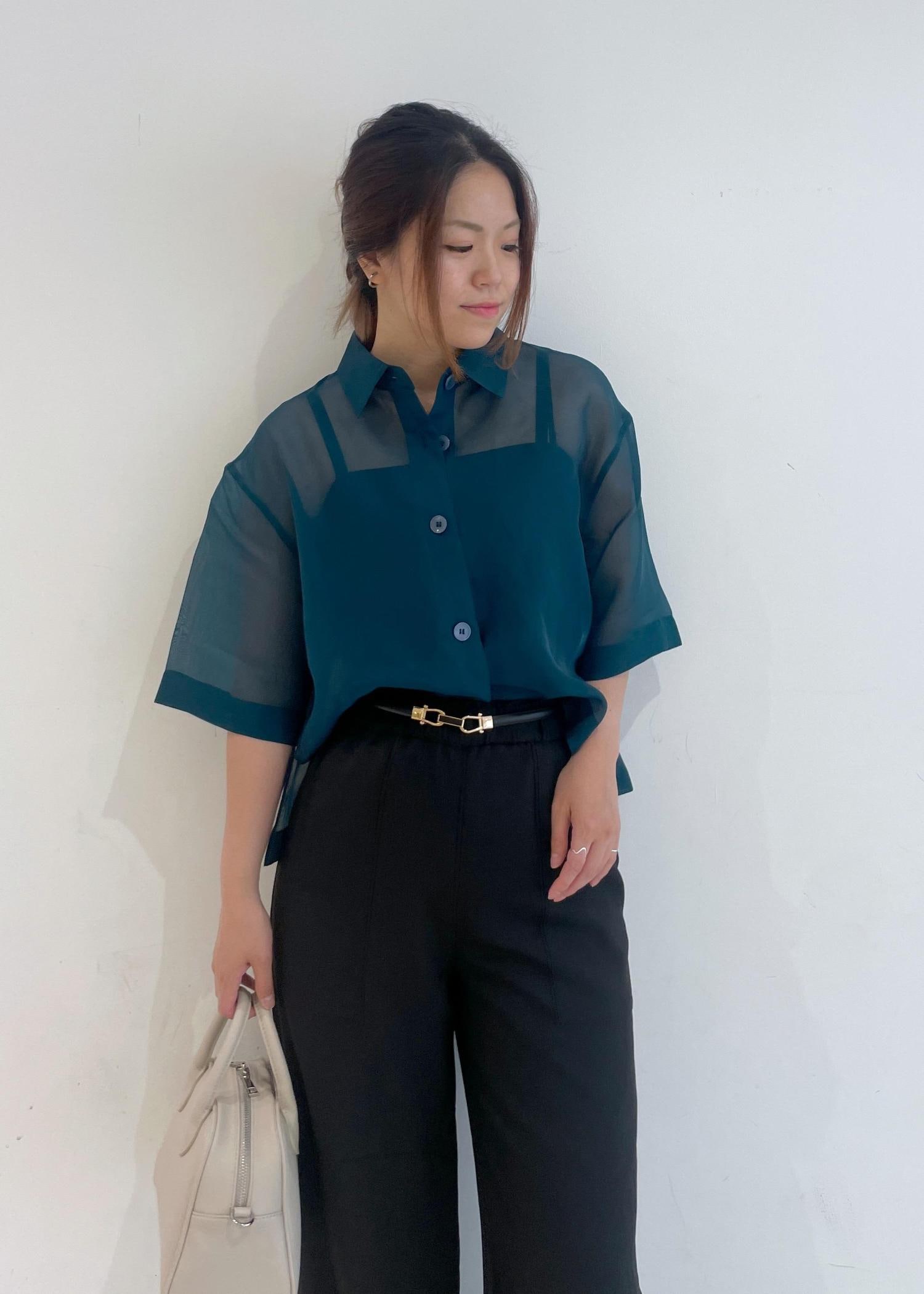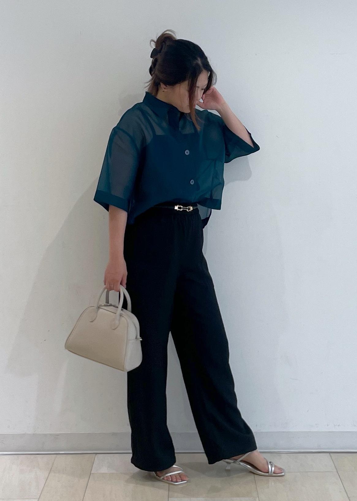 濃いめのグリーンのシアーシャツに黒で合わせてカッコイイ大人コーデにしました!
