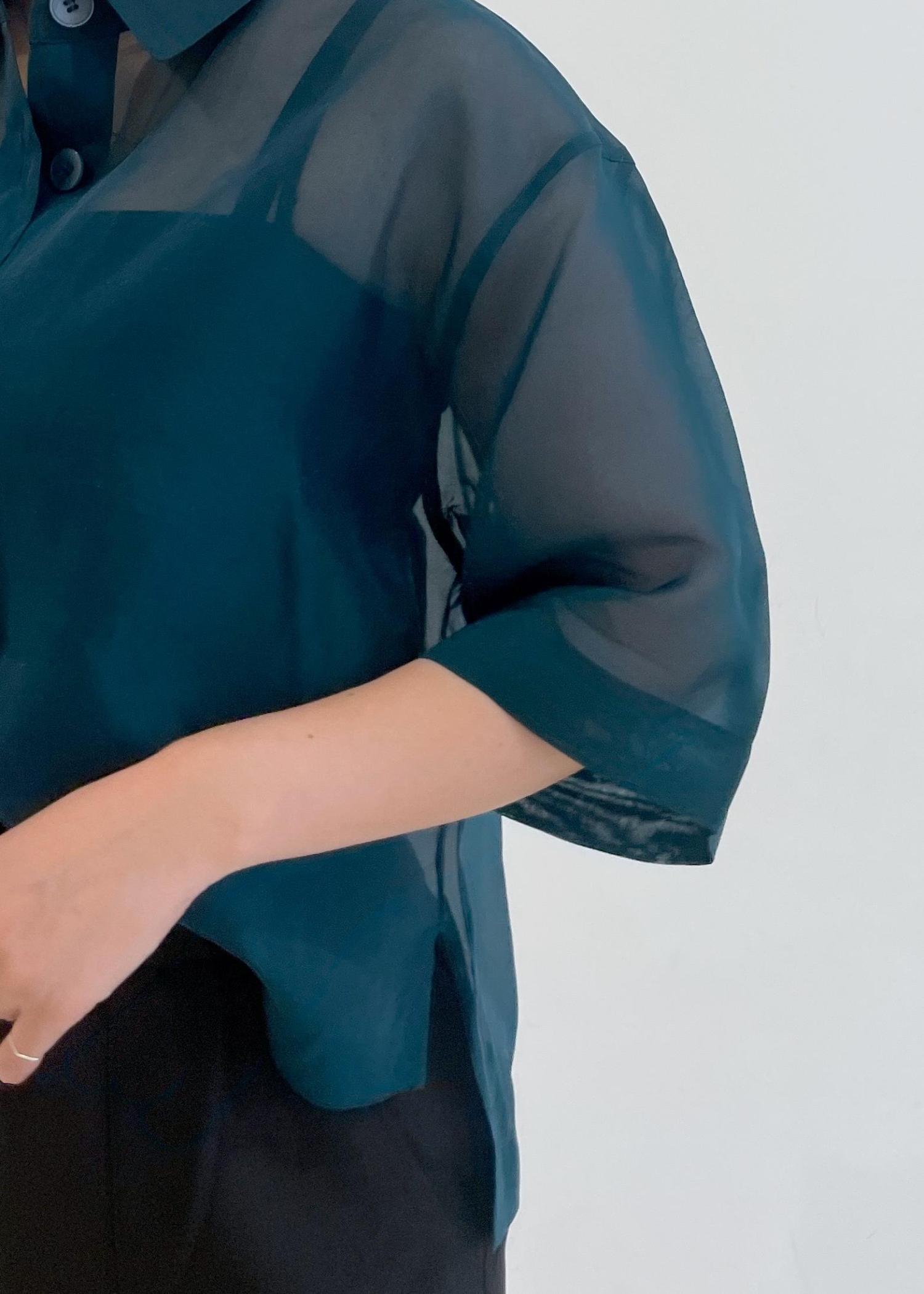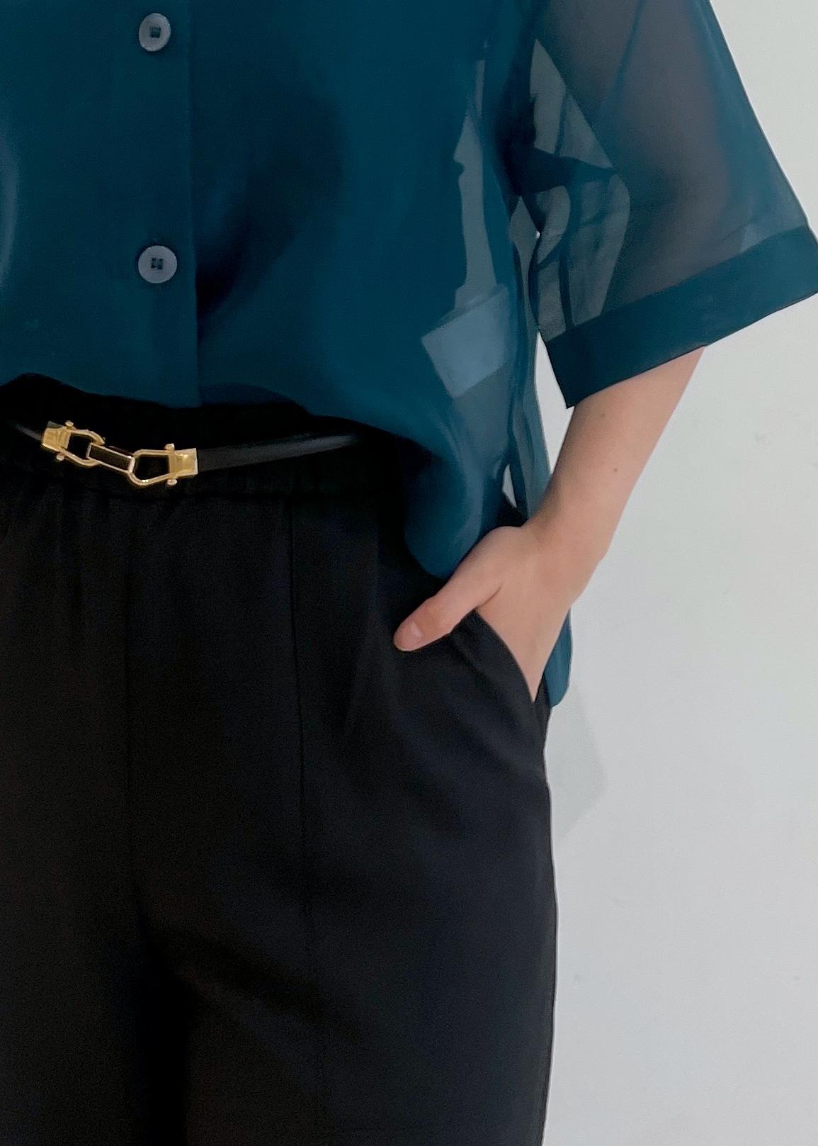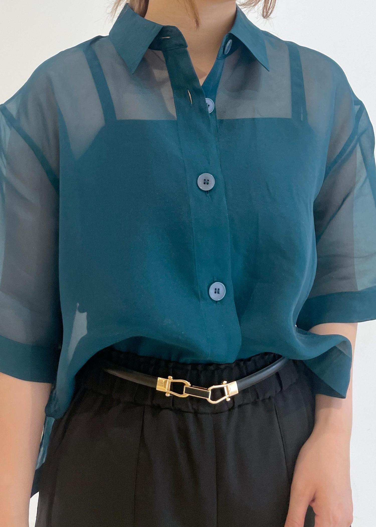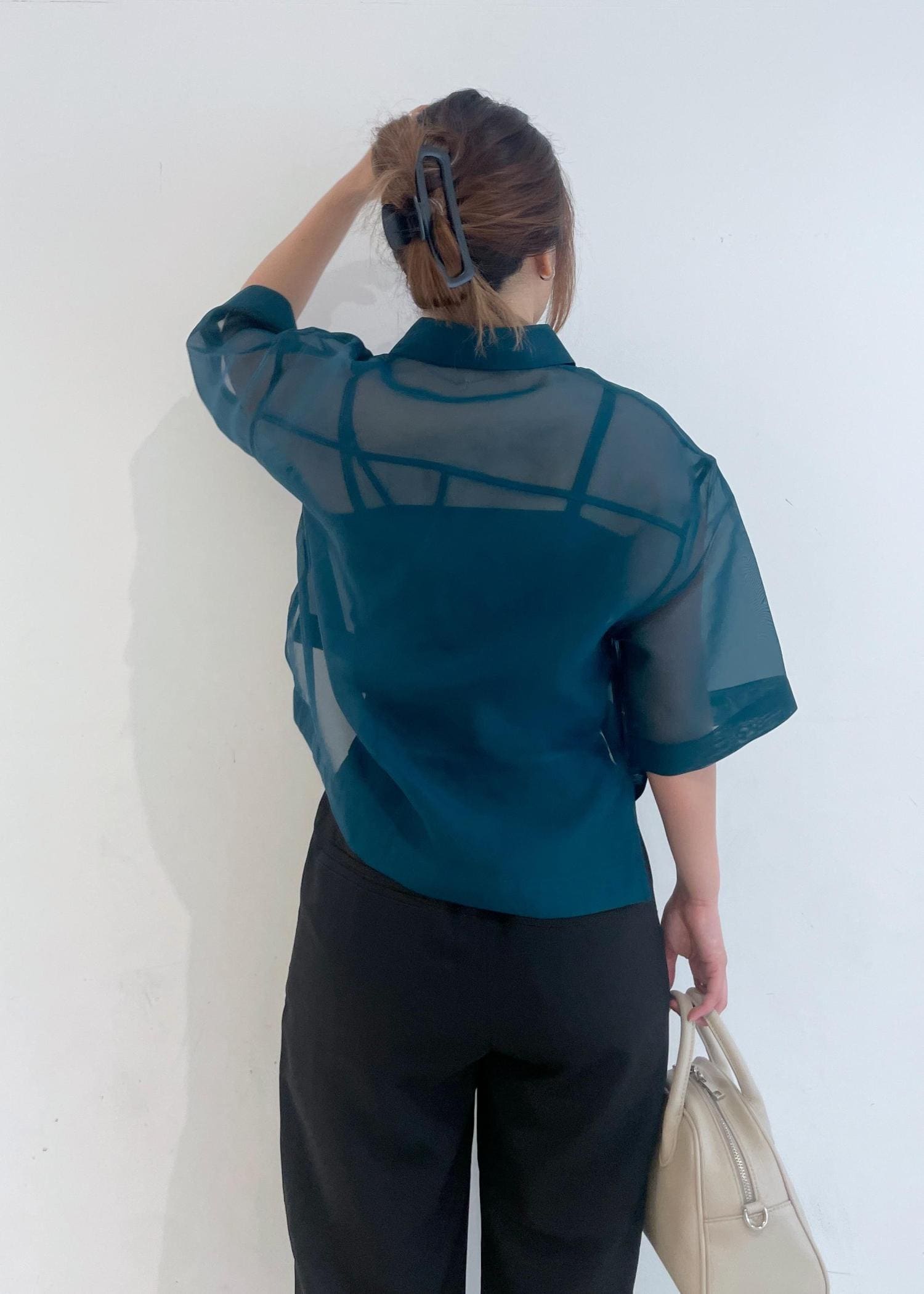 濃いめのグリーンのシアーシャツに黒で合わせてカッコイイ大人コーデにしました!