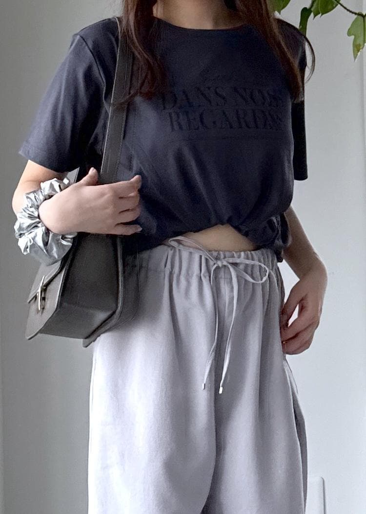 Tシャツの裾を結び中に入れ込んで、短めのトップスとして着用することでコーディネートにメリハリをつけています。