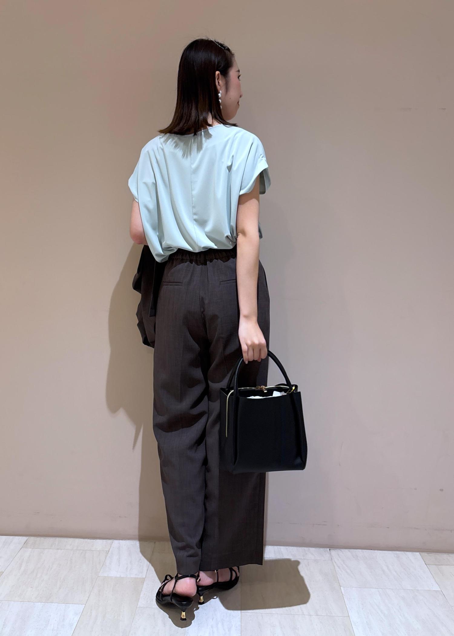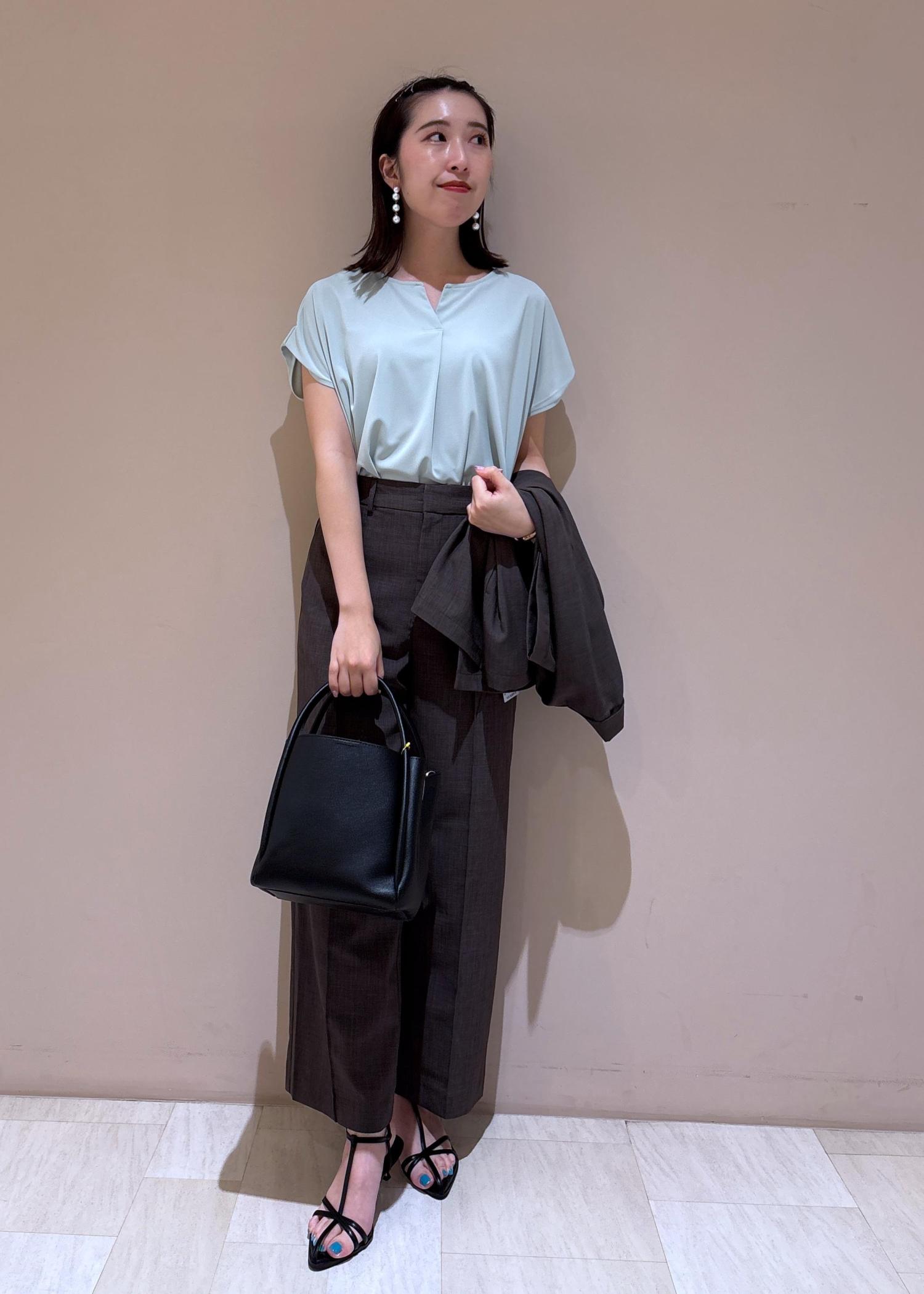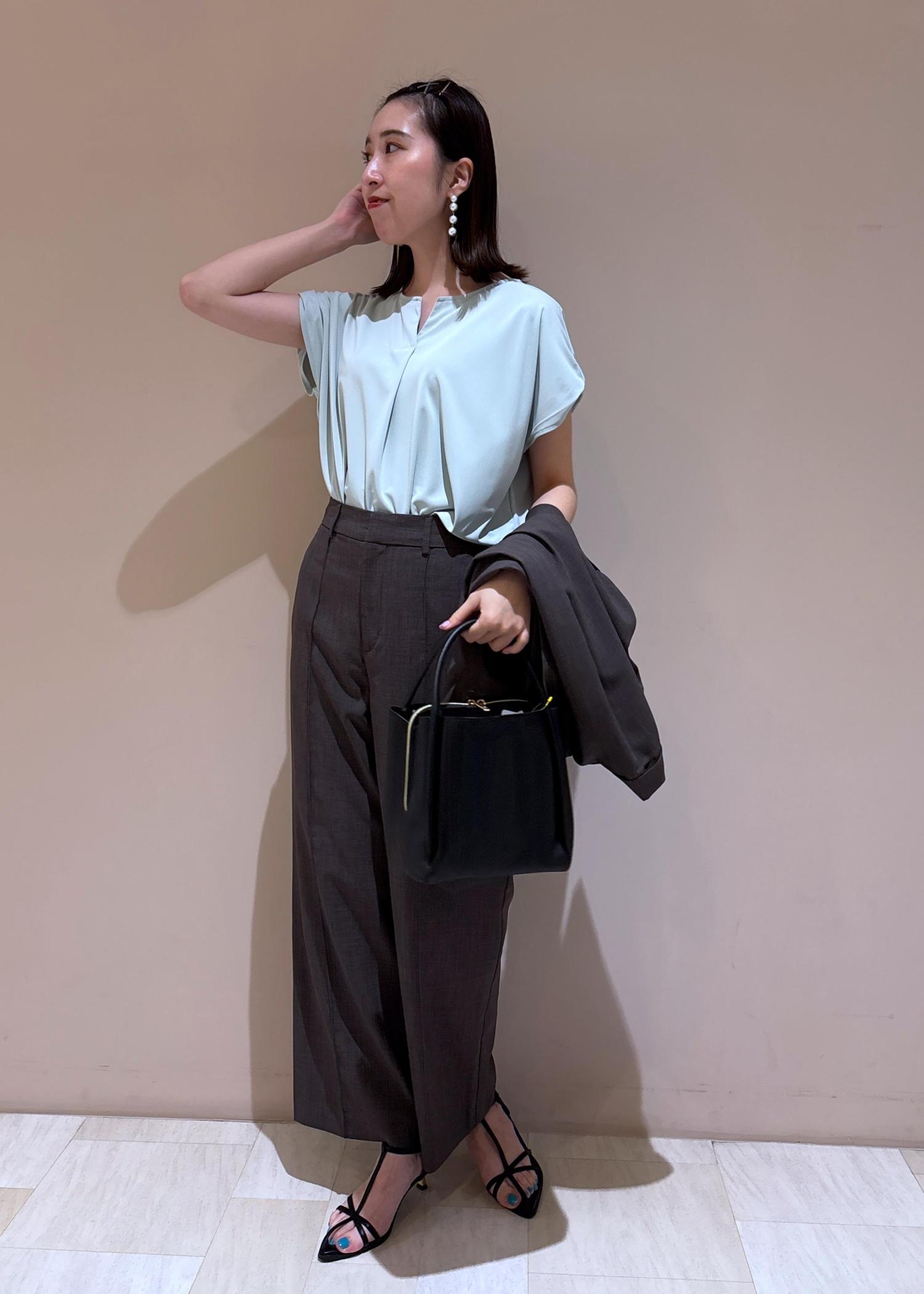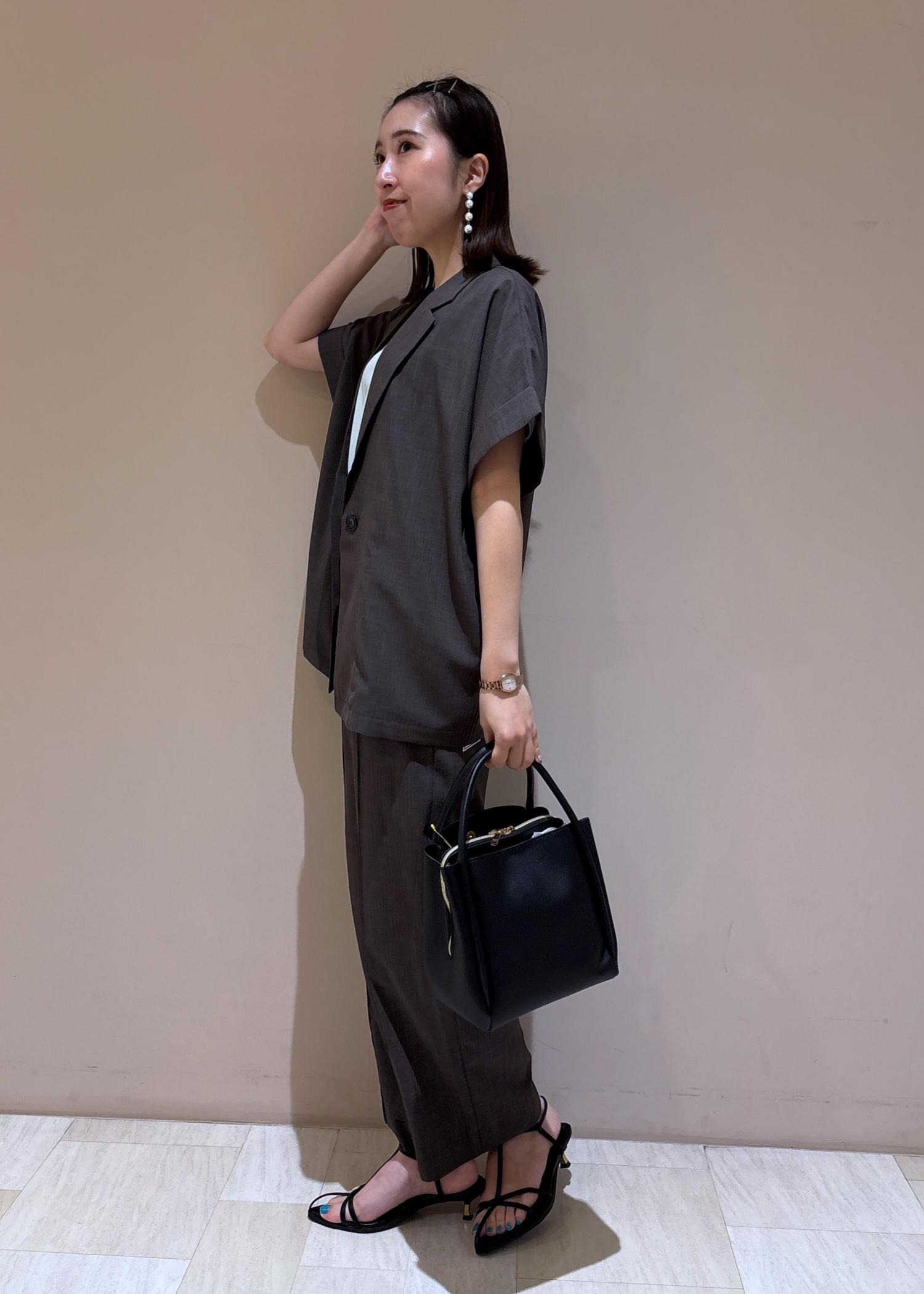 人気の麻調シリーズのセットアップを使ったオフィスカジュアルコーデ。