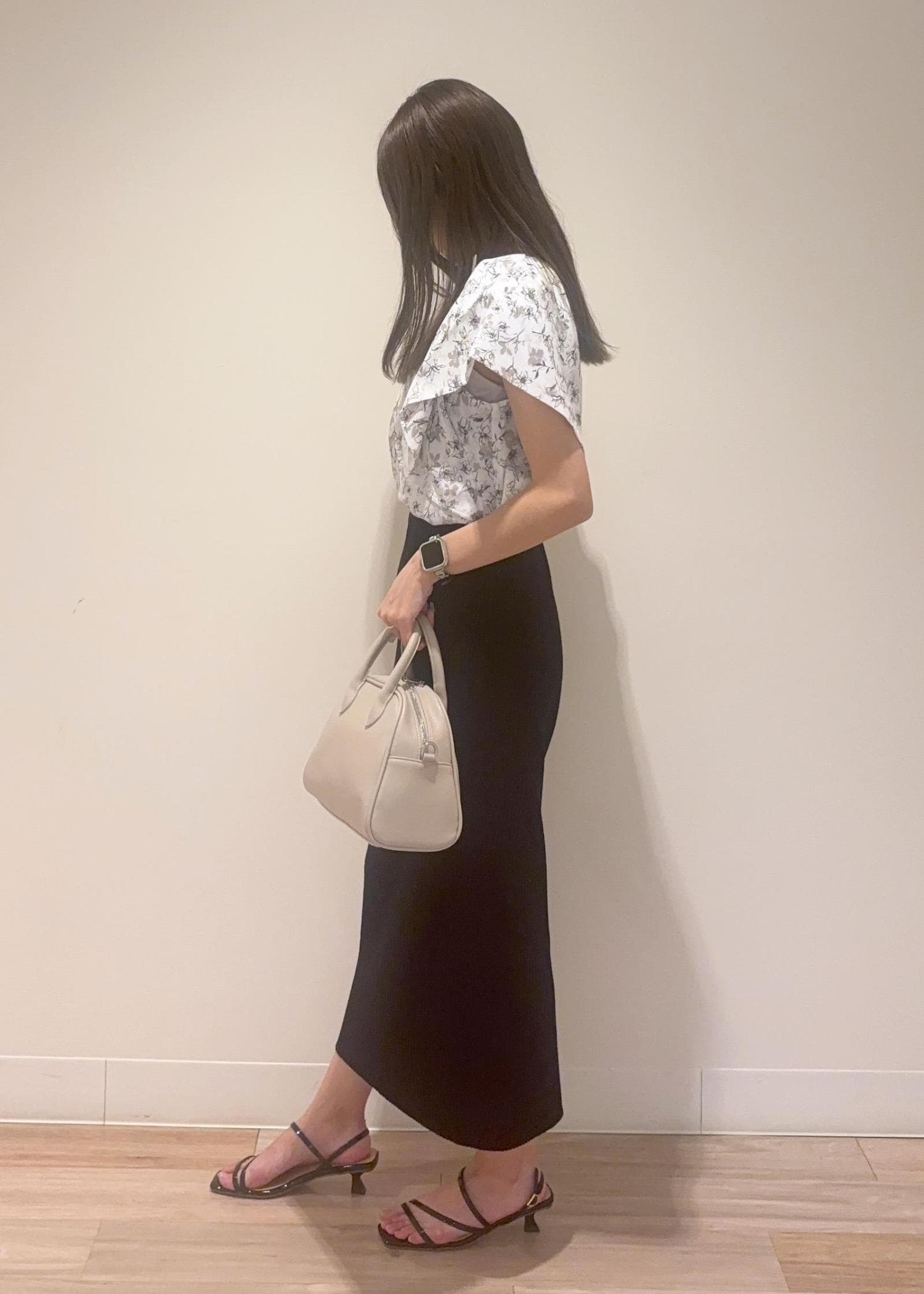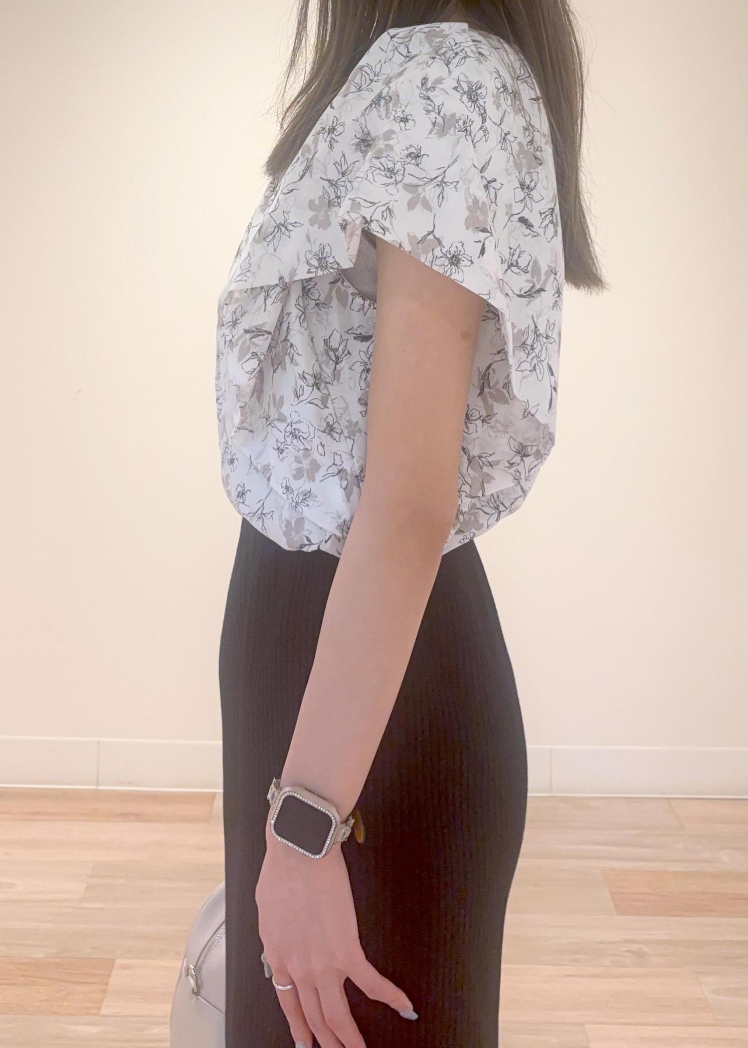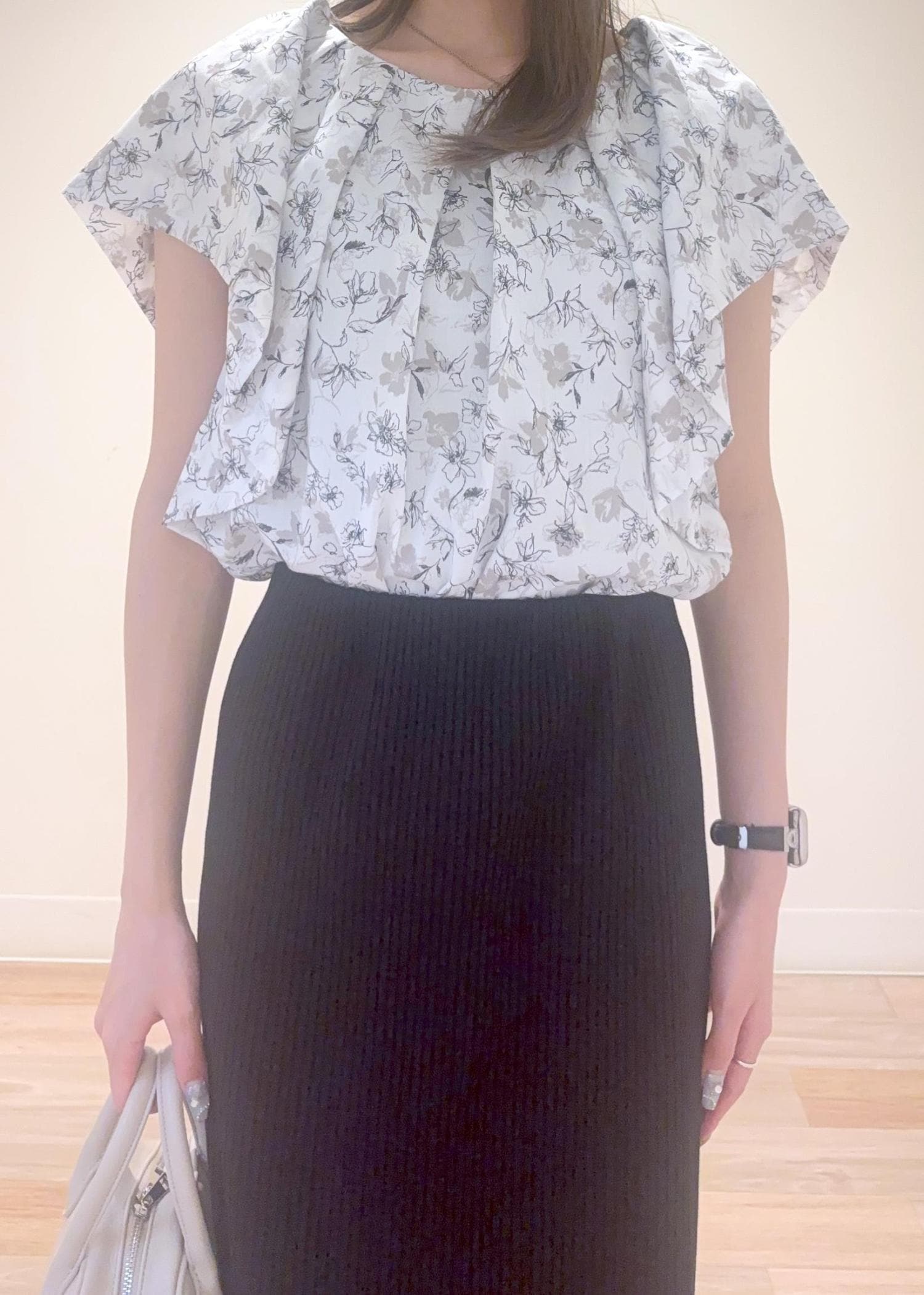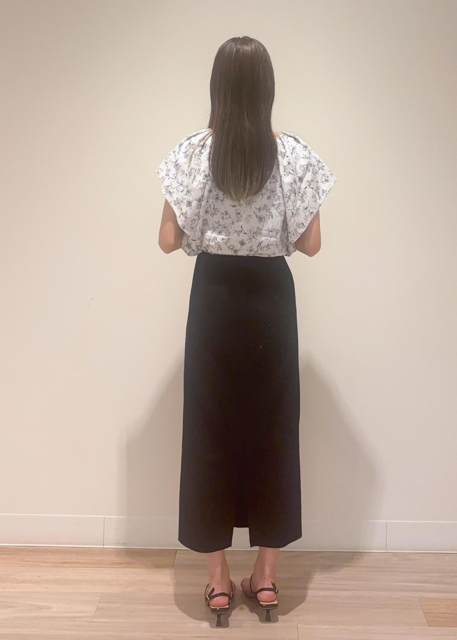 柄物ブラウスに無地の黒スカートを合わせるとシンプルすぎない大人っぽきれいめコーデになります♡