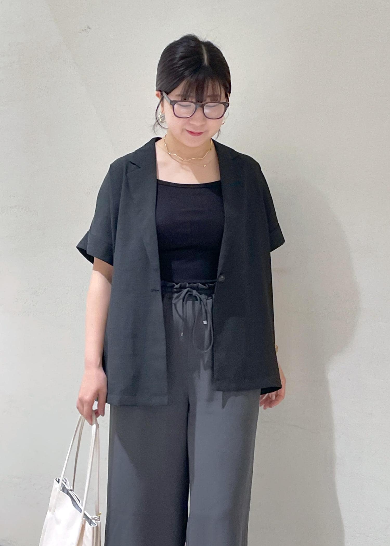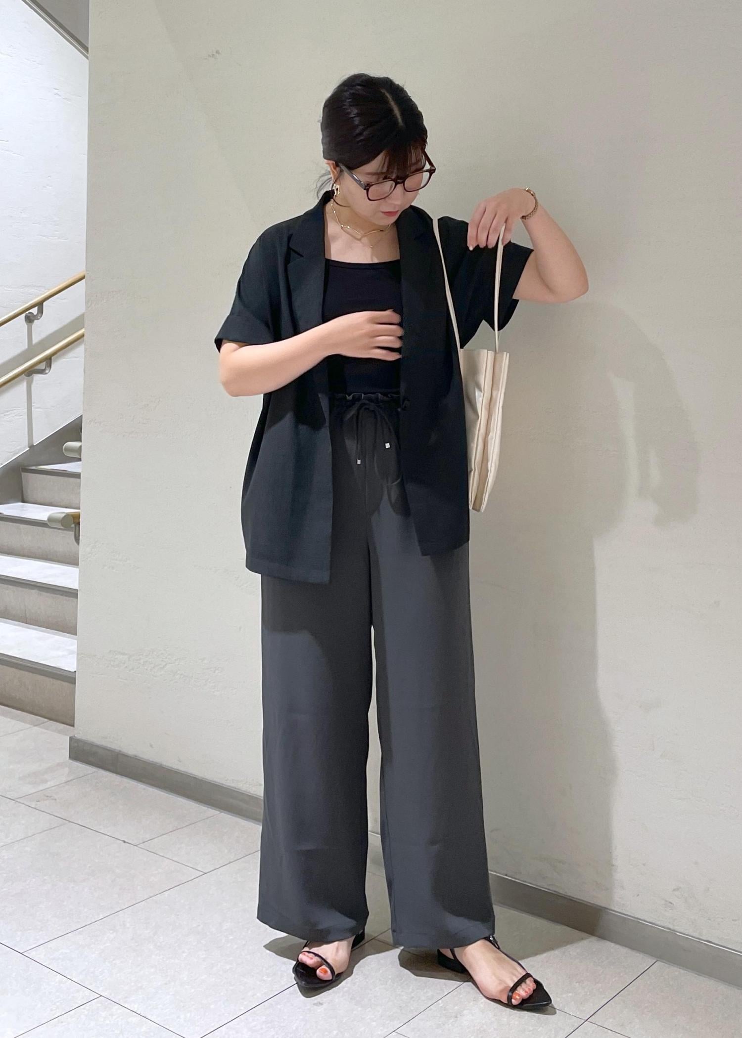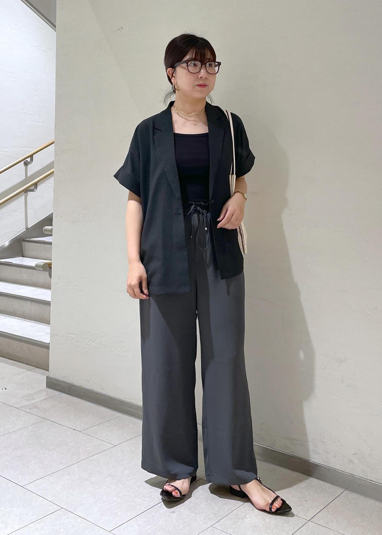 麻調ジャケットはセットでパンツがあるのですが、お腹周りやおしりが大きい私には履けなかったので、チャコールのとろみパンツを合わせてセットアップ風にしました!
