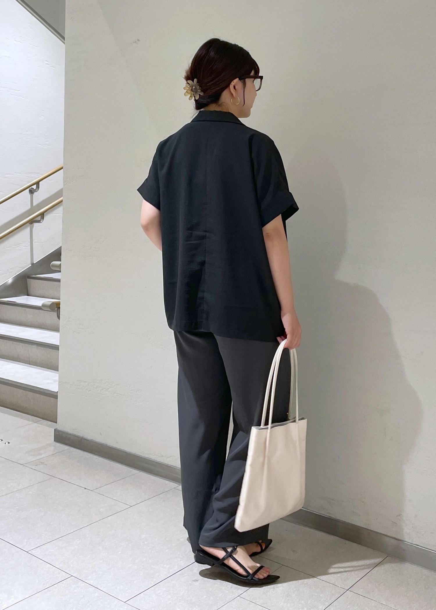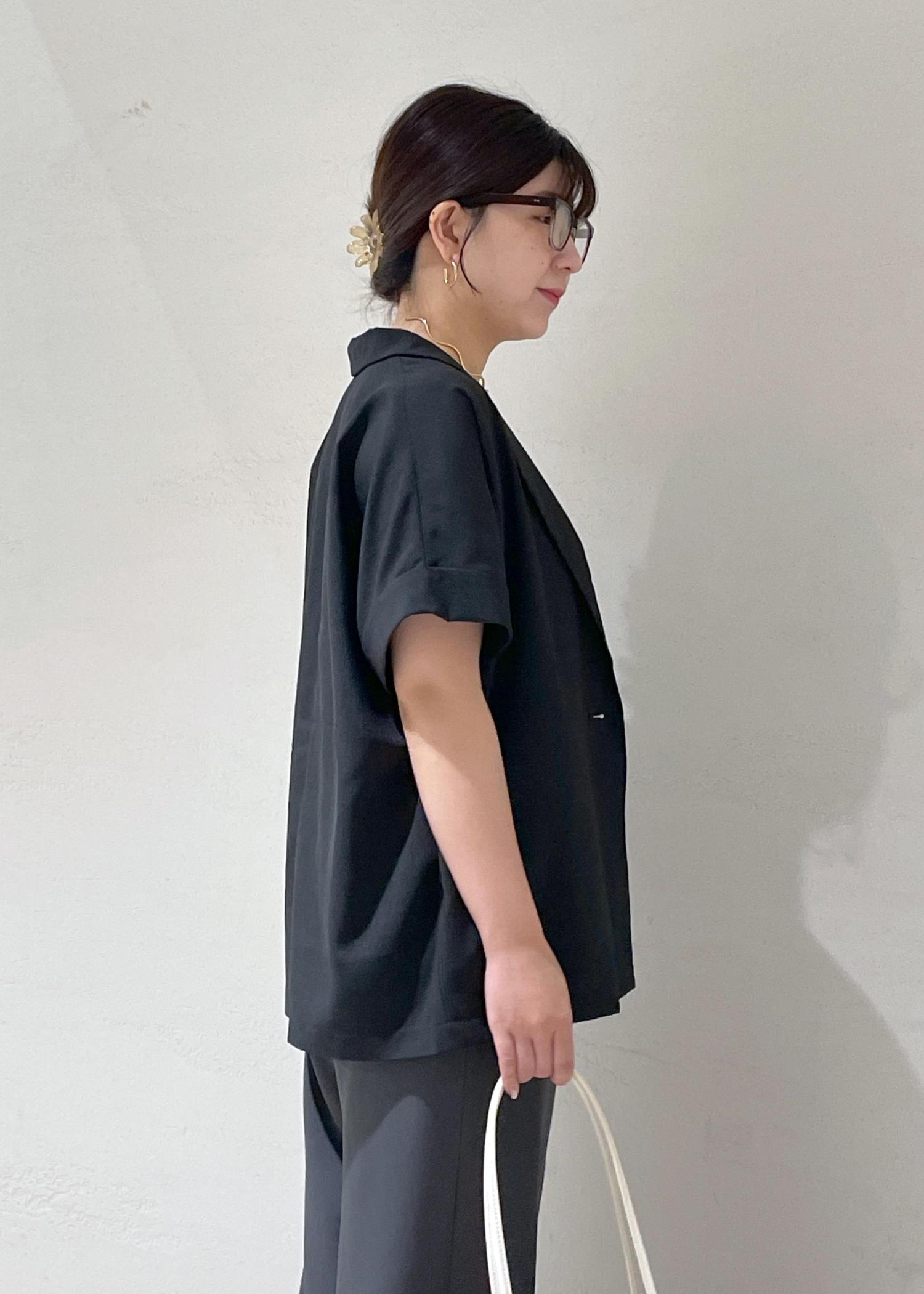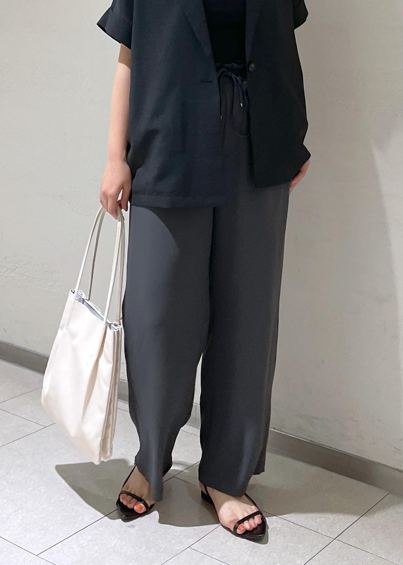 麻調ジャケットはセットでパンツがあるのですが、お腹周りやおしりが大きい私には履けなかったので、チャコールのとろみパンツを合わせてセットアップ風にしました!