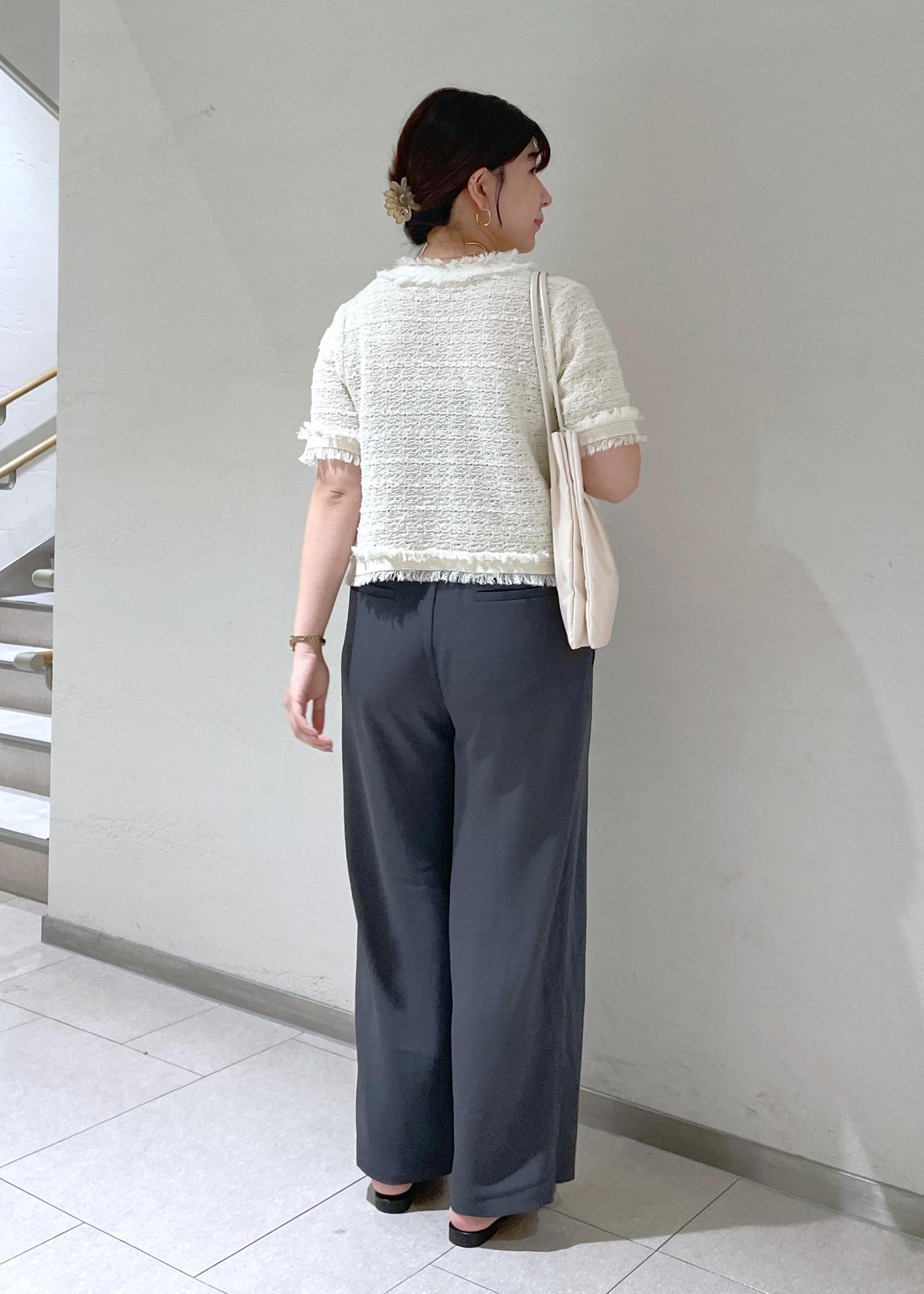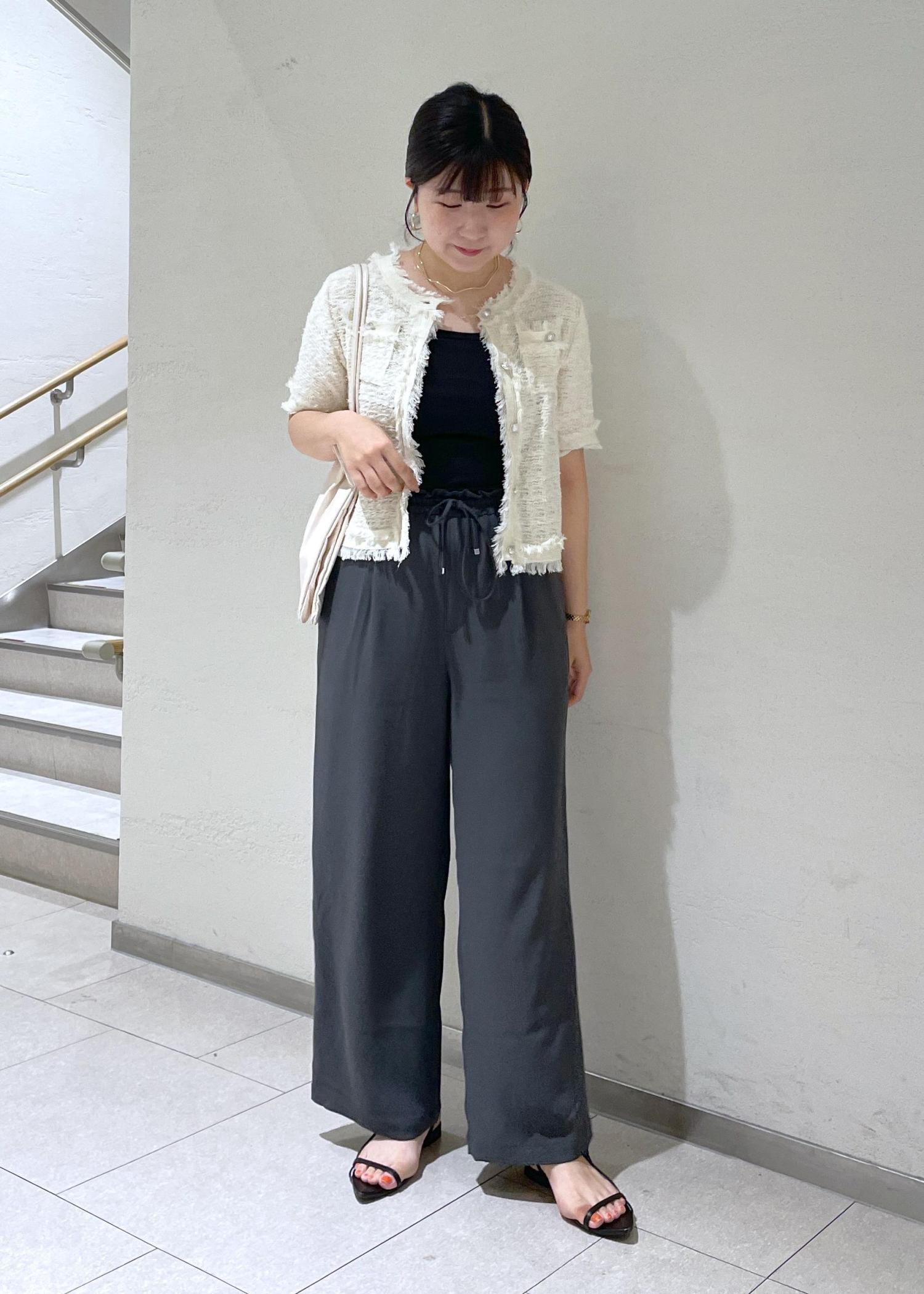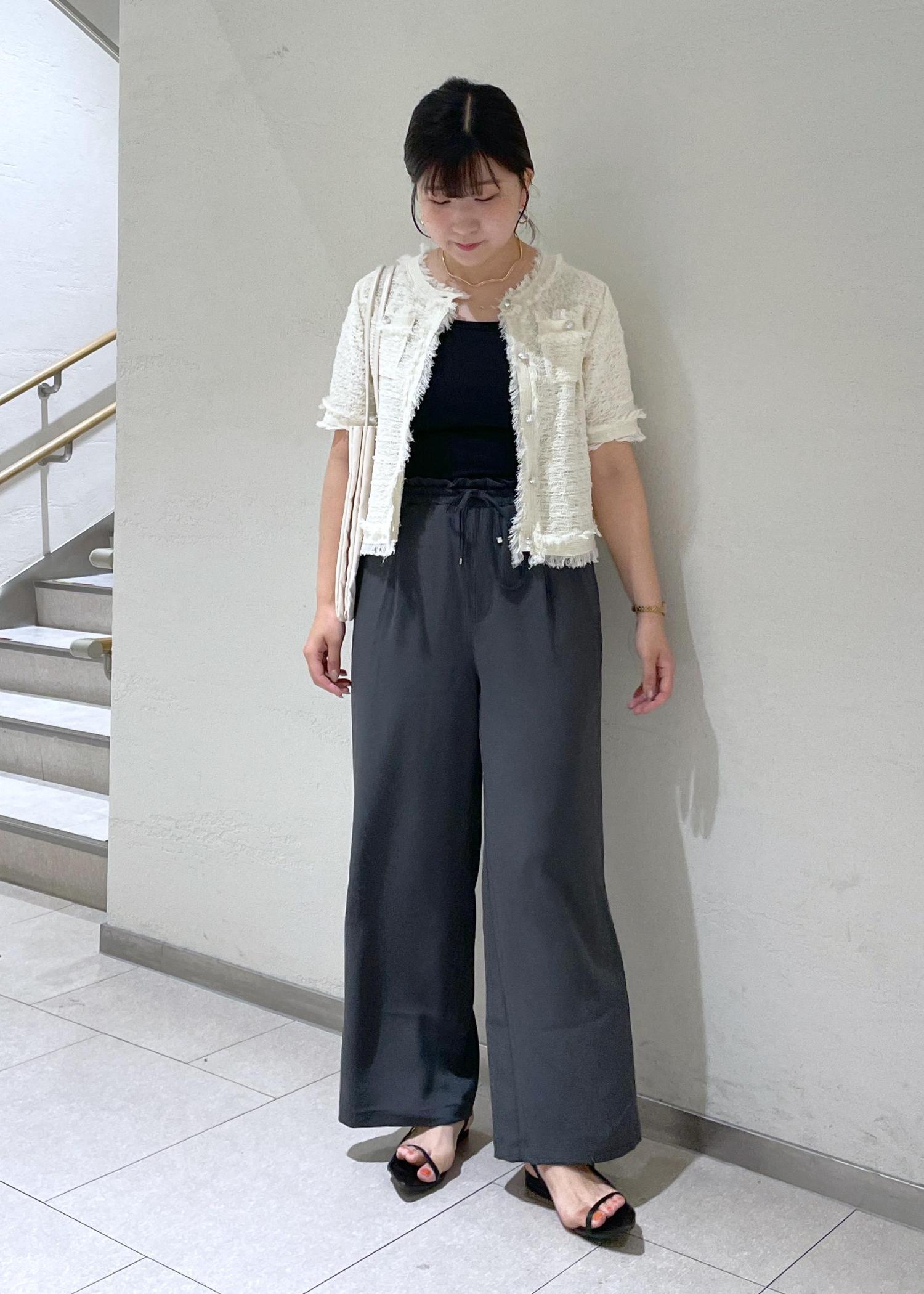 ジョグパンツと合わせてツイードのカチッとした感じをラフ感のあるコーデにしました。