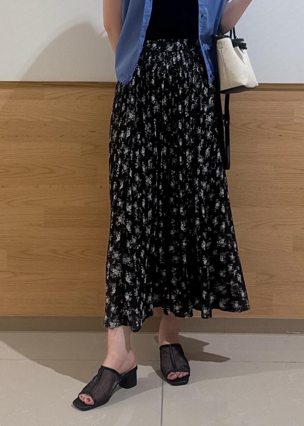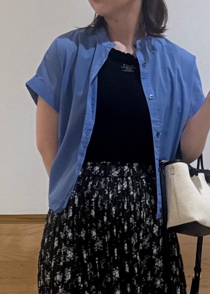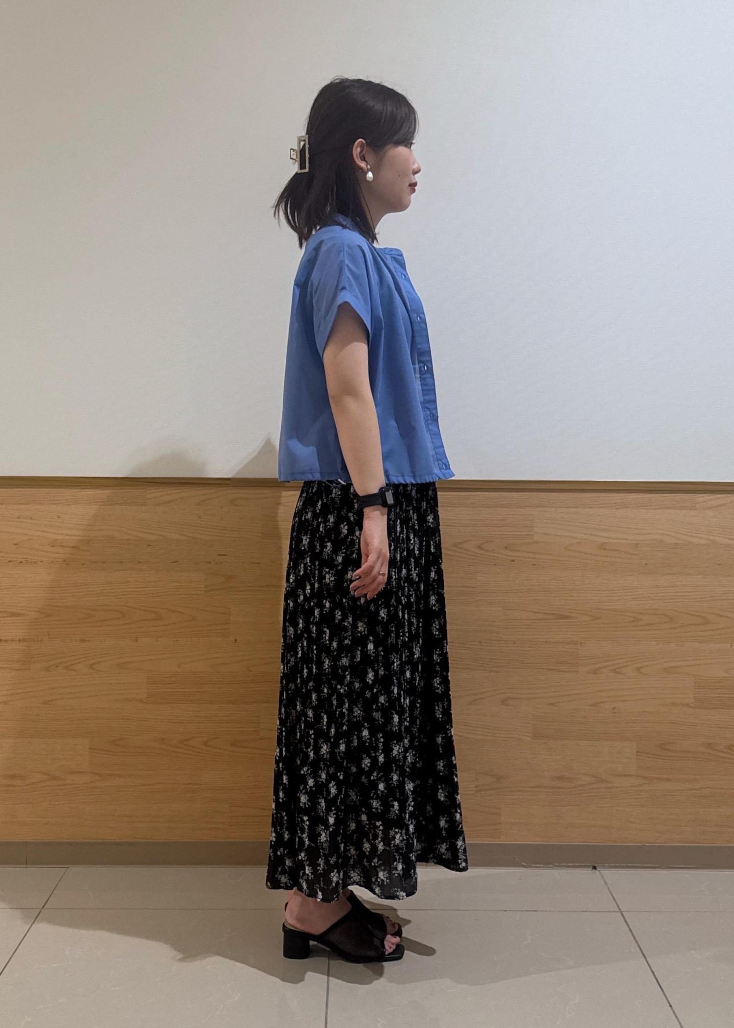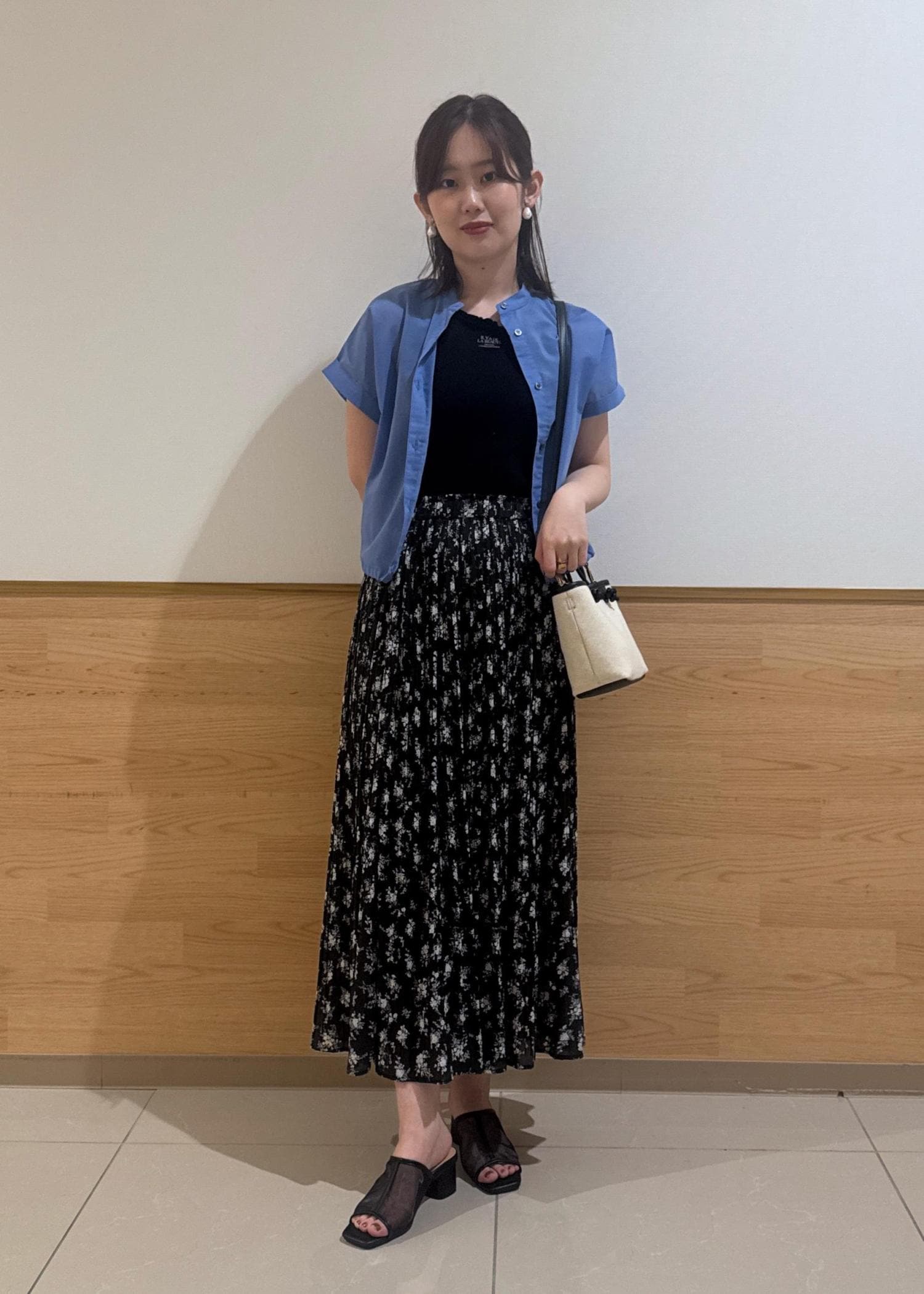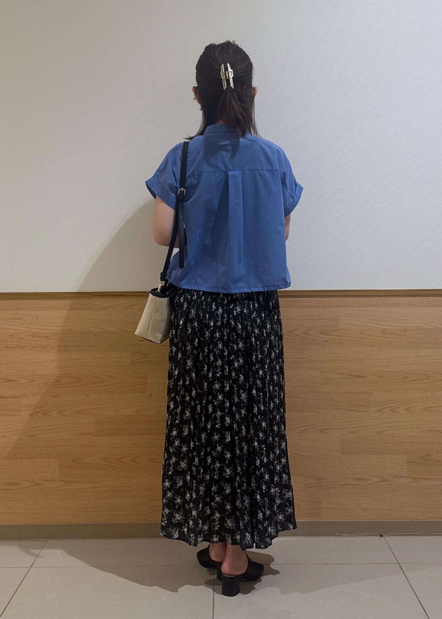 さらっとしたブルーのシャツに、花柄のプリーツスカートを合わせたコーデです。