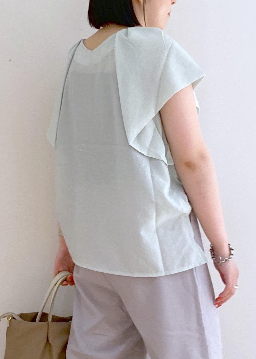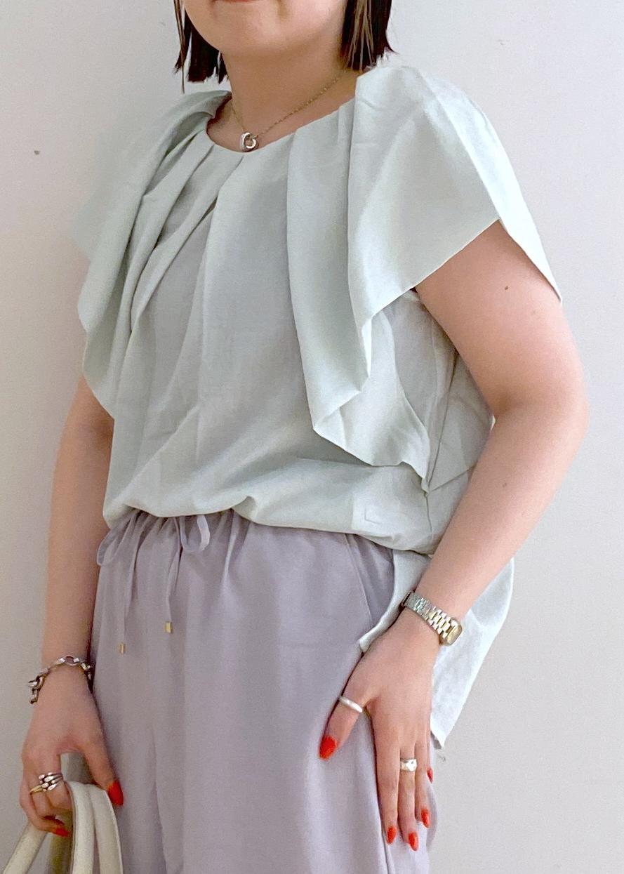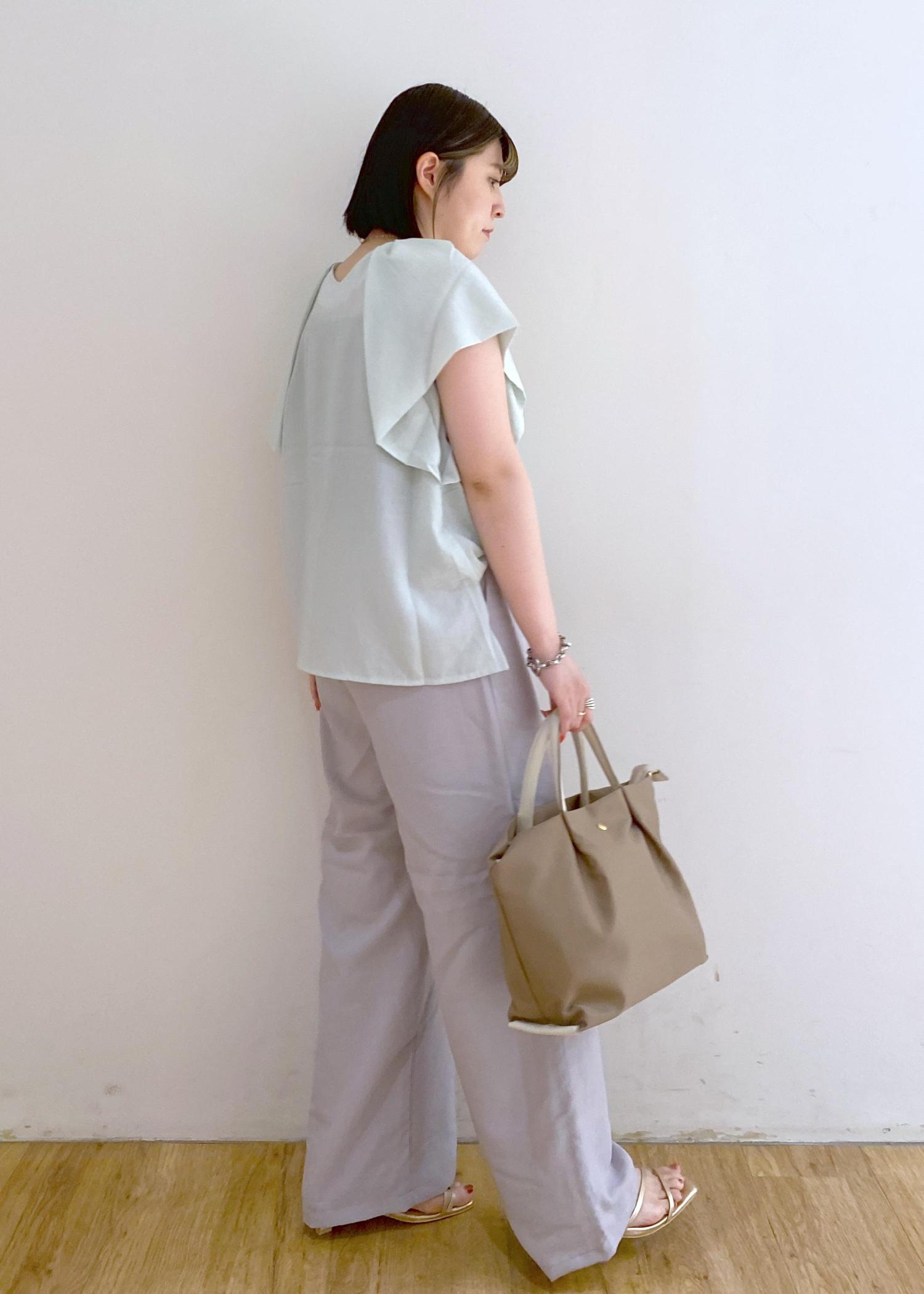 アウトレットROPÉ PICNICラッフルスリーブブラウス/通勤対応ライトグリーン / 38¥3,149レビューゆとりのあるデザインでボディラインをひろわないシルエットです☺︎二の腕もある程度隠れるので着痩せ効果◎やや前後差があり156cmでヒップが隠れる着丈です。