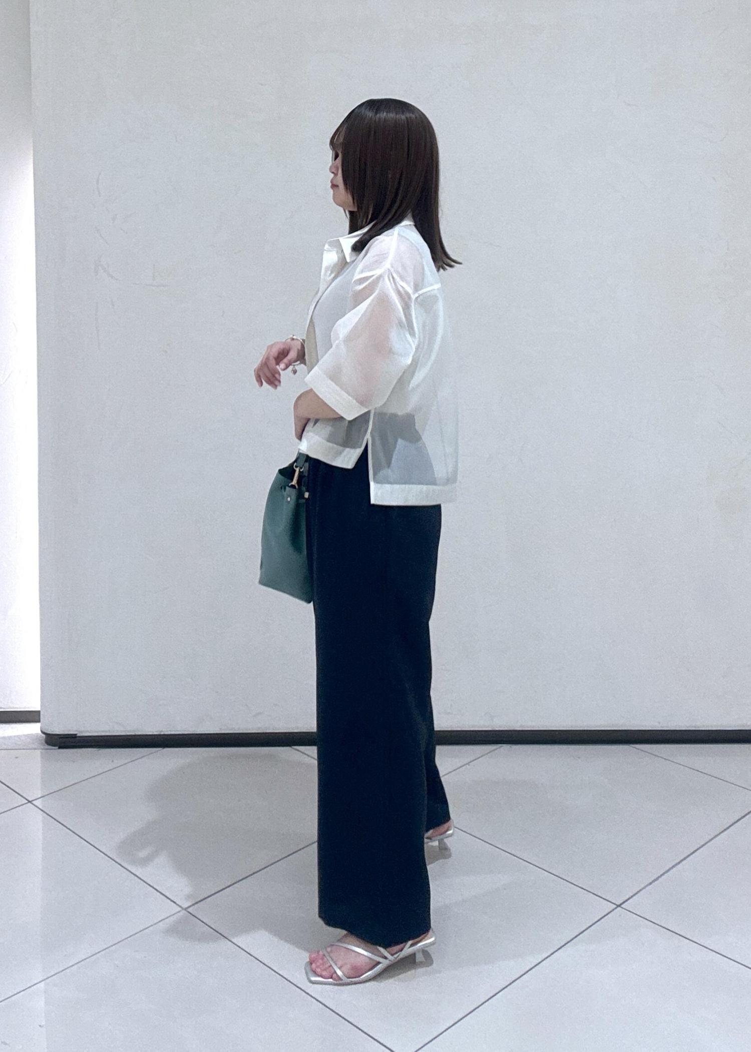 モノトーンコーデに、差し色でバッグは緑を選びました!