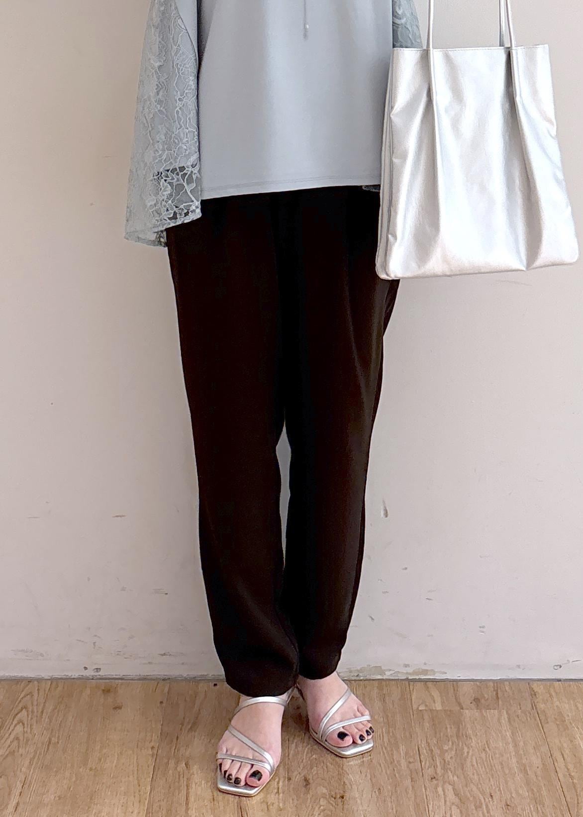 綺麗目なトップスを主役にしたお出かけスタイルです。ブラウンのパンツを合わせて柔らかな印象に。