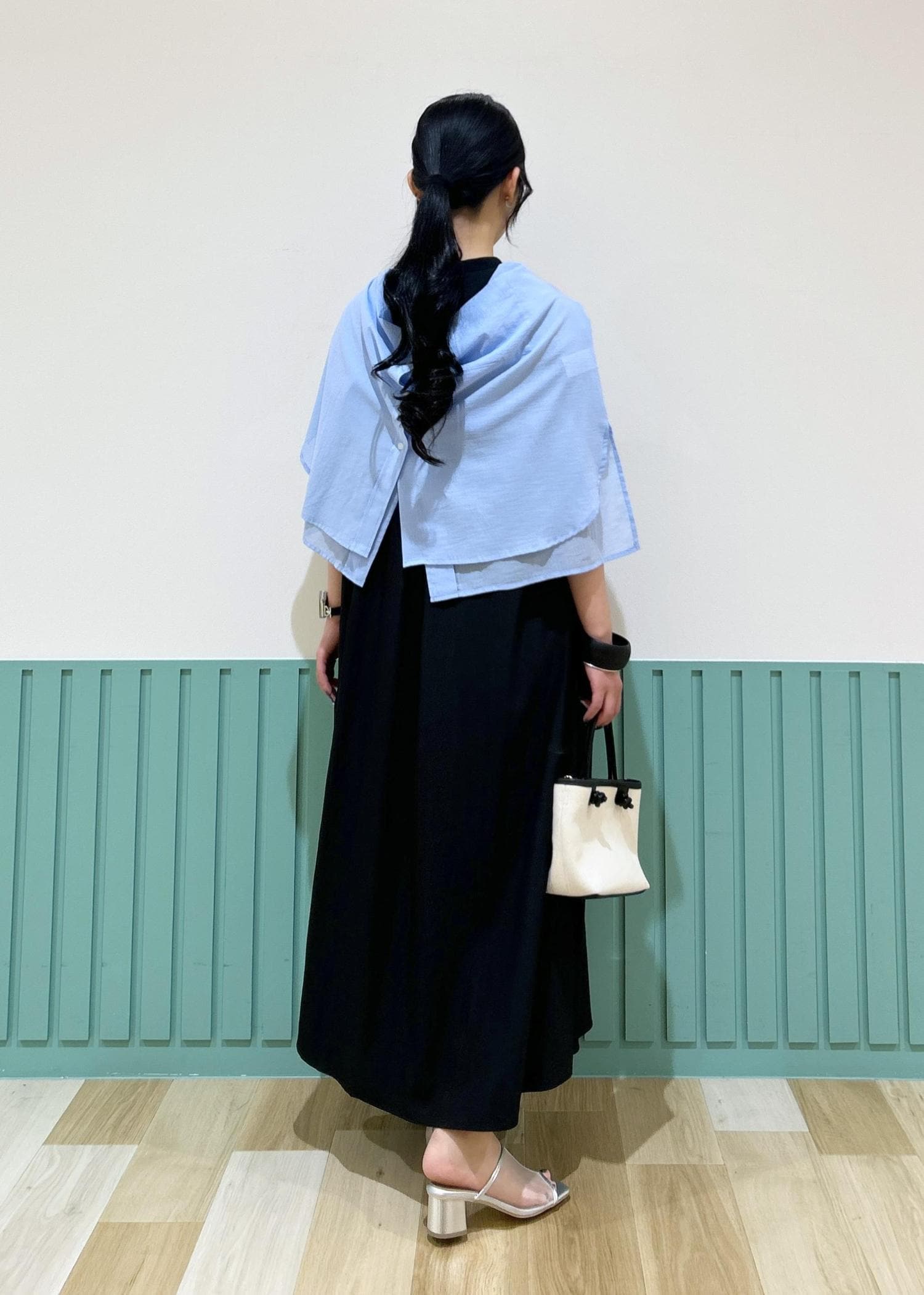 淡いブルーのシャツを肩掛けしたコーディネートです。