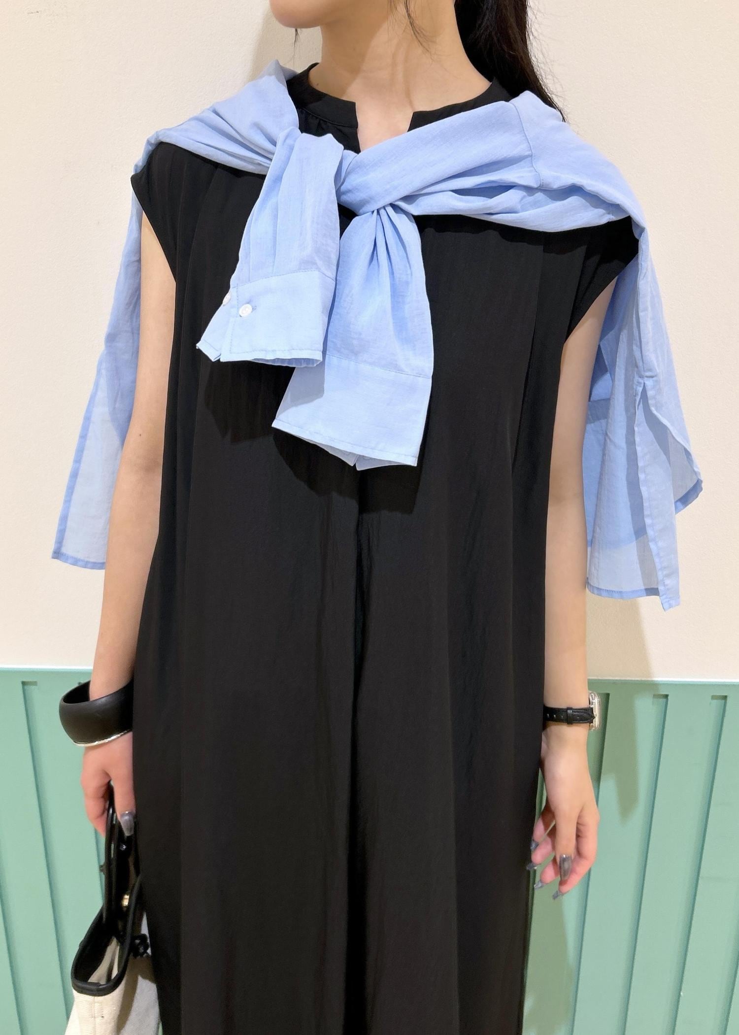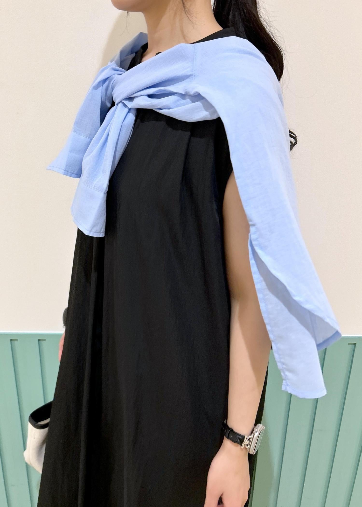 シンプルな黒ワンピにカラーシャツをプラスすることで、