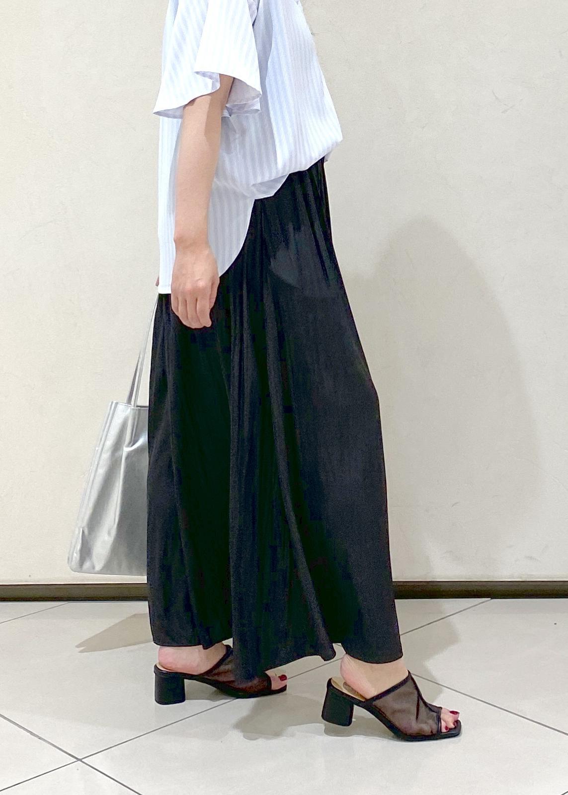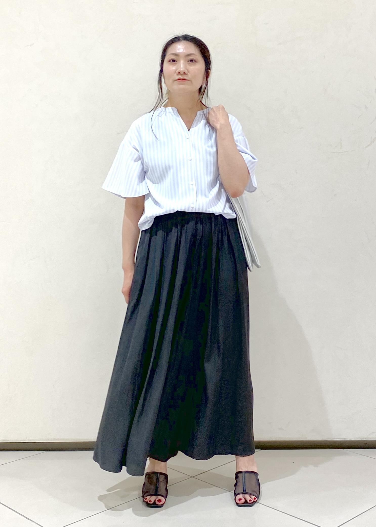 あまり足を見せたくない方はこちらの品番の通常丈がおススメ。身長153cmでも引きずらずに着用できます。生地感も重すぎず、サラッと軽く着用できます。