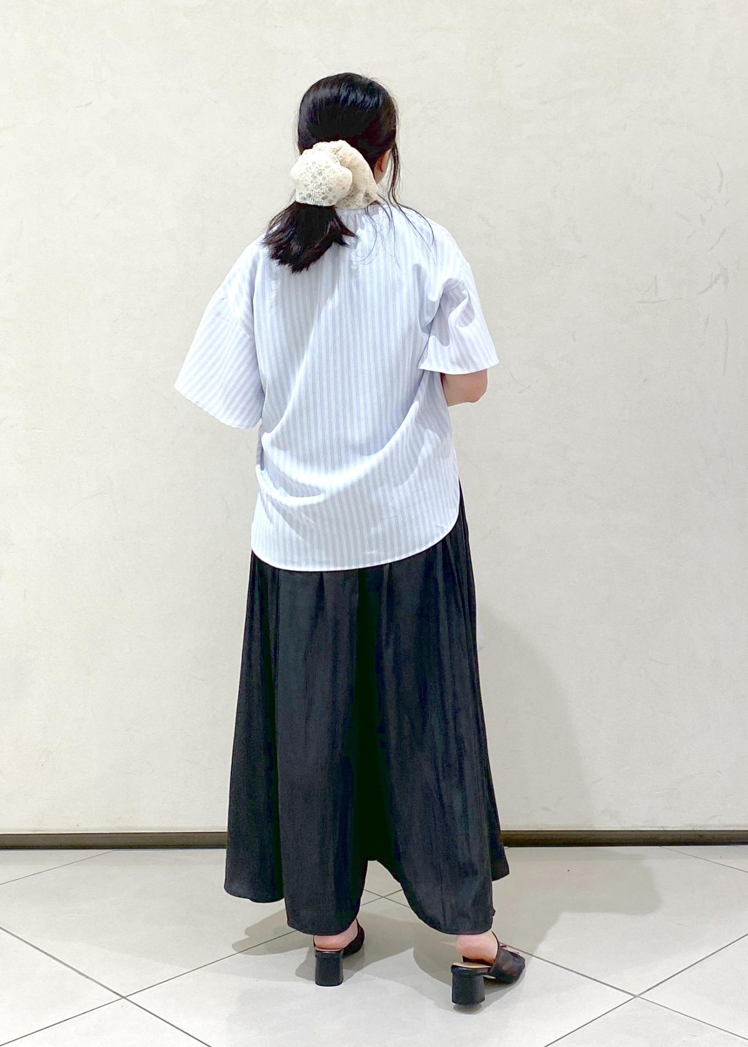 一枚で着られるブラウスとウエストゴムのスカーチョできちんと感もありつつ、ストレスフリーなコーデです。お仕事はもちろん、ちょっとしたお出かけにも使えます