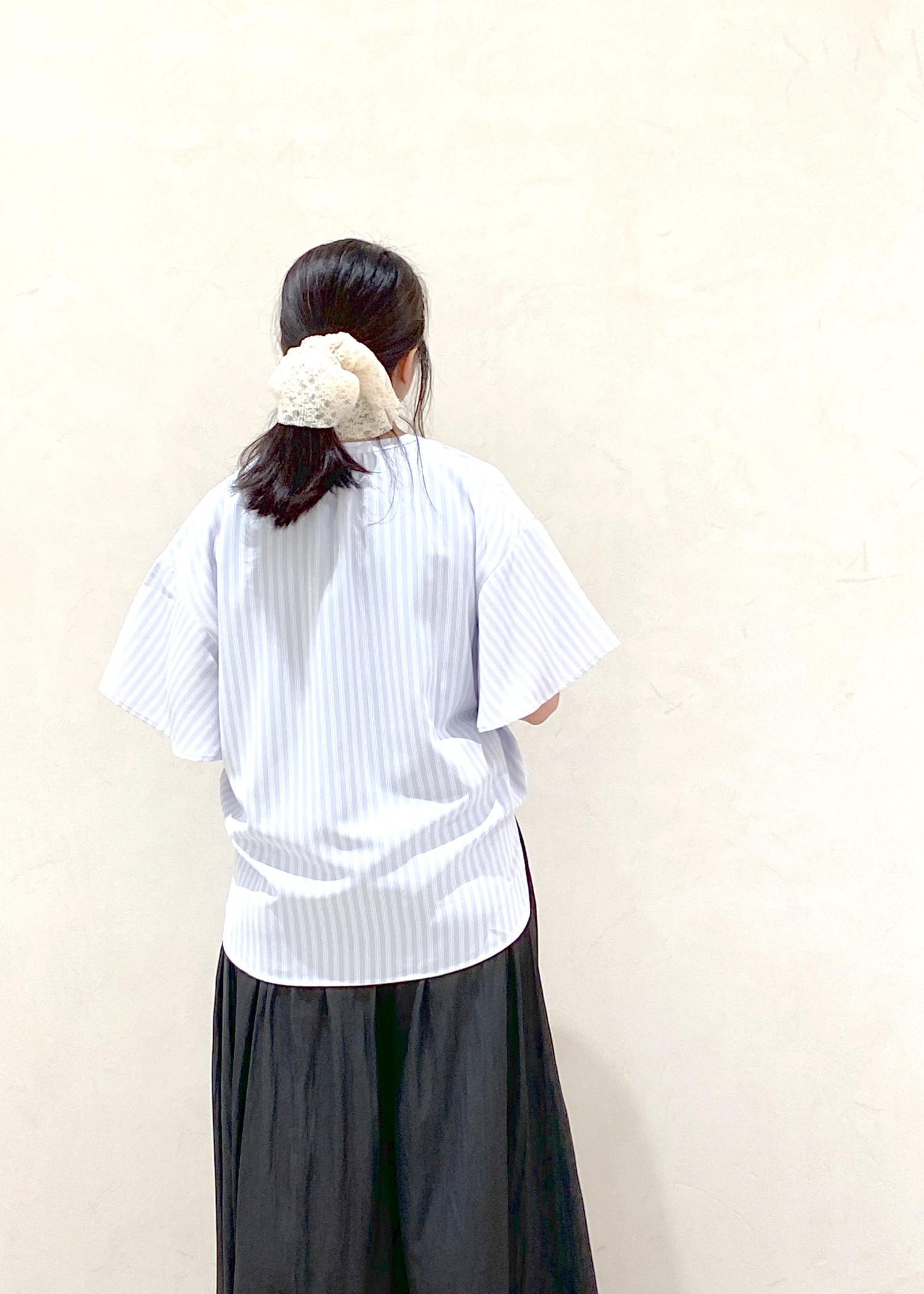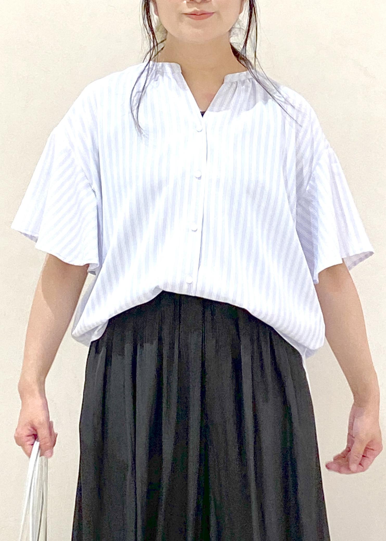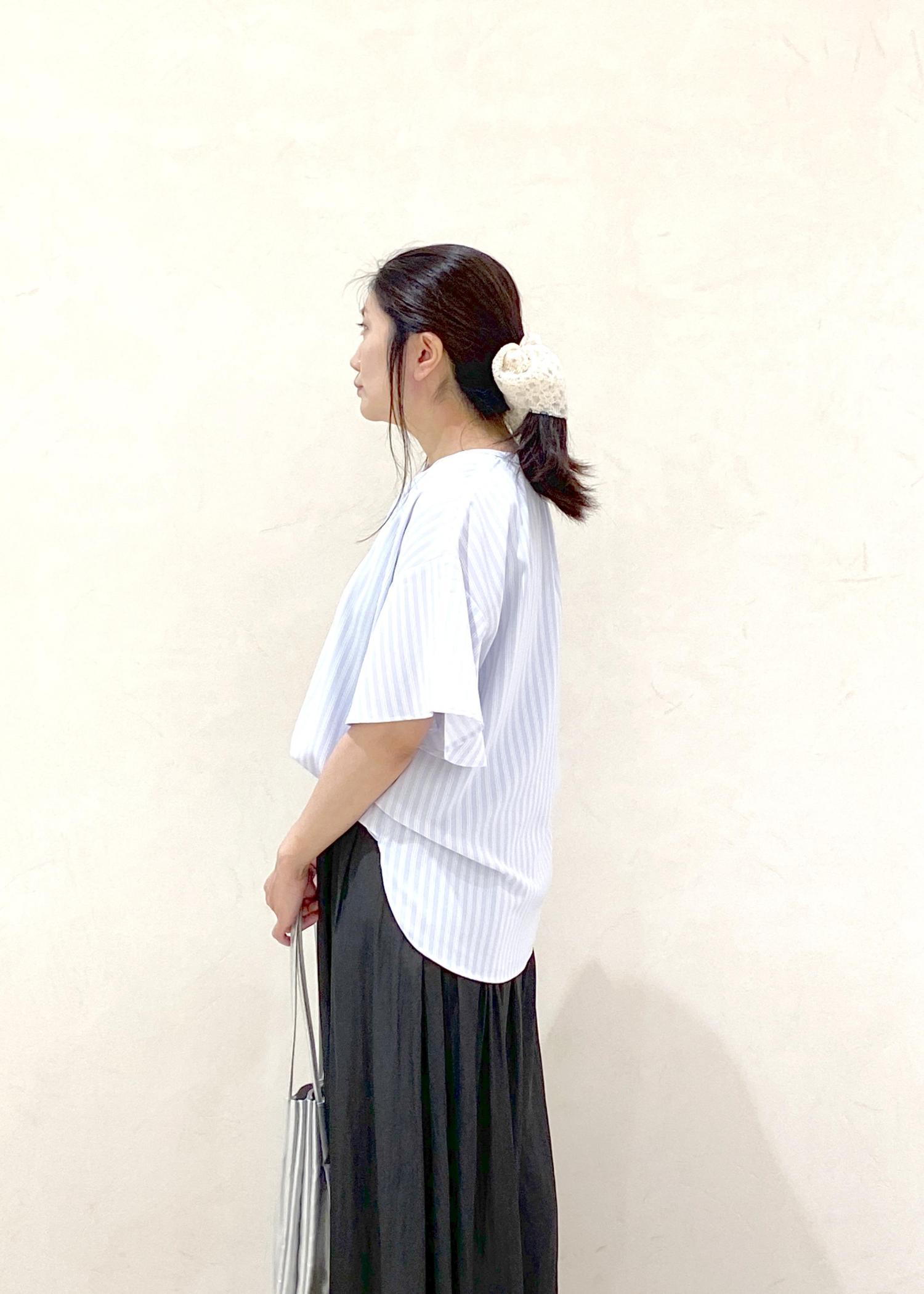 袖がしっかりあるので、腕見せが苦手な方も1枚で着られて安心です。肩はやや落ち感があり、ゆっくりしたシルエットで肌離れするので夏場でも涼しい着心地。
