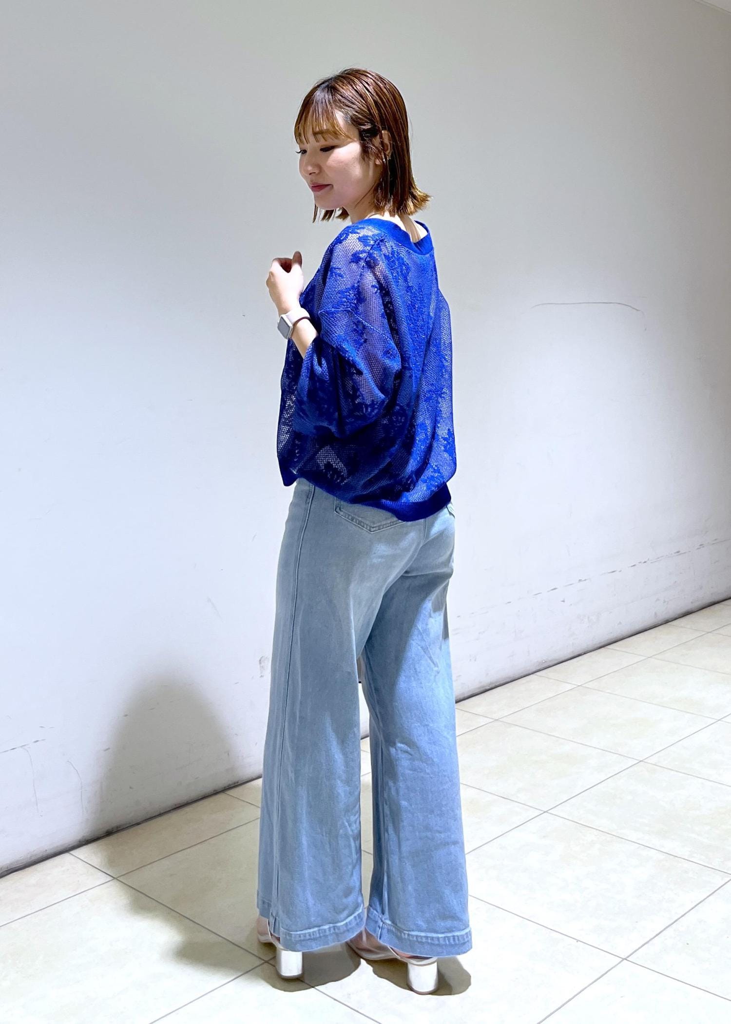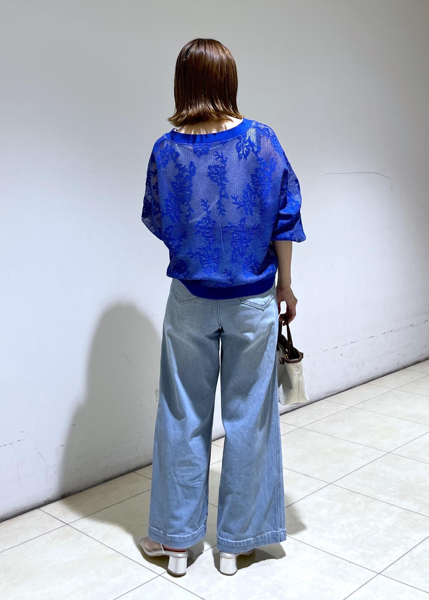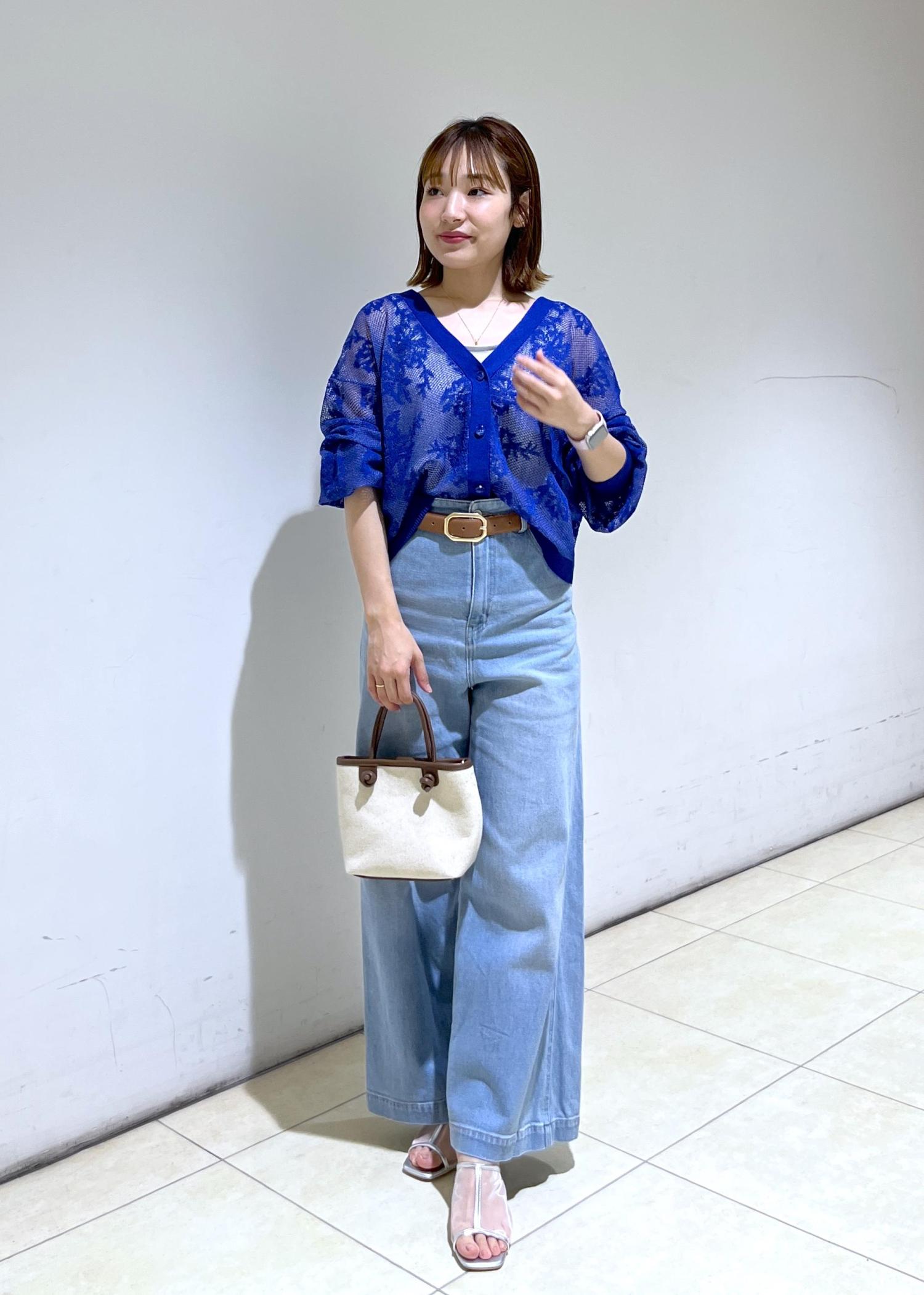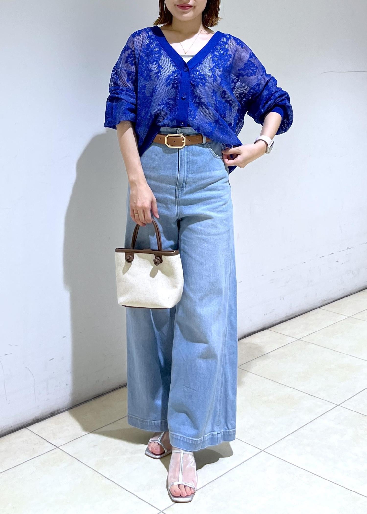 鮮やかなブルーの透かし編みカーディガンにデニムで合わせた大人カジュアルコーデ♪