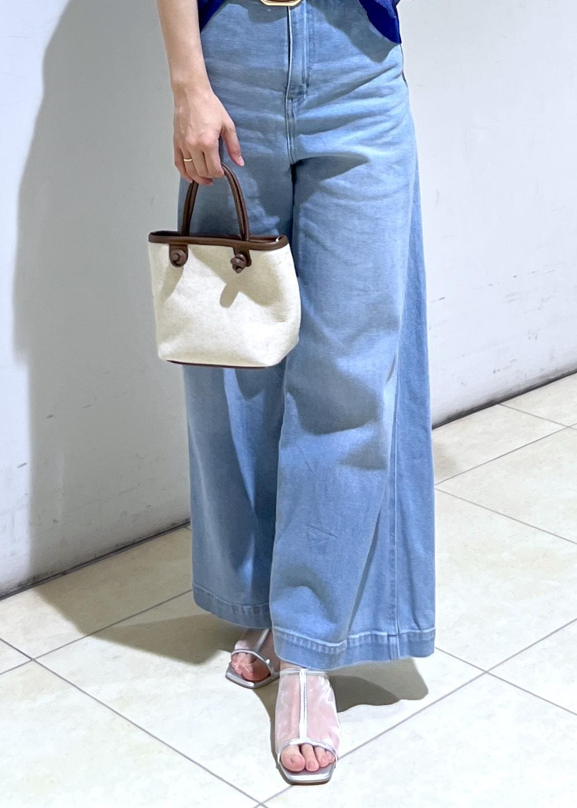 ウエストの内側に太いゴムが付いてるのでスッキリ見えが叶うデニムです。