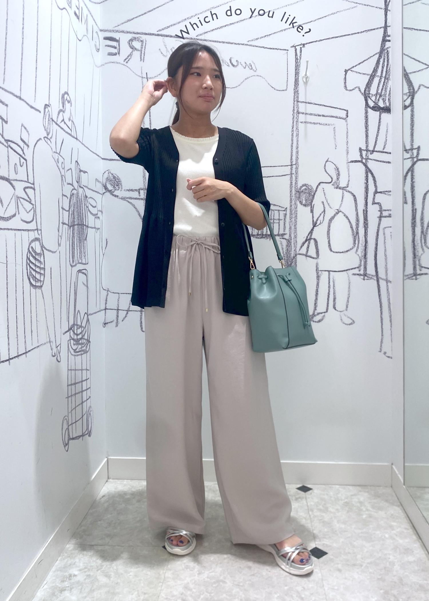 トップスのブラックにパンツの涼し気な素材感とバックの色味を夏らしいブルー系をプラスすることで重く見えず着こなすことができます。