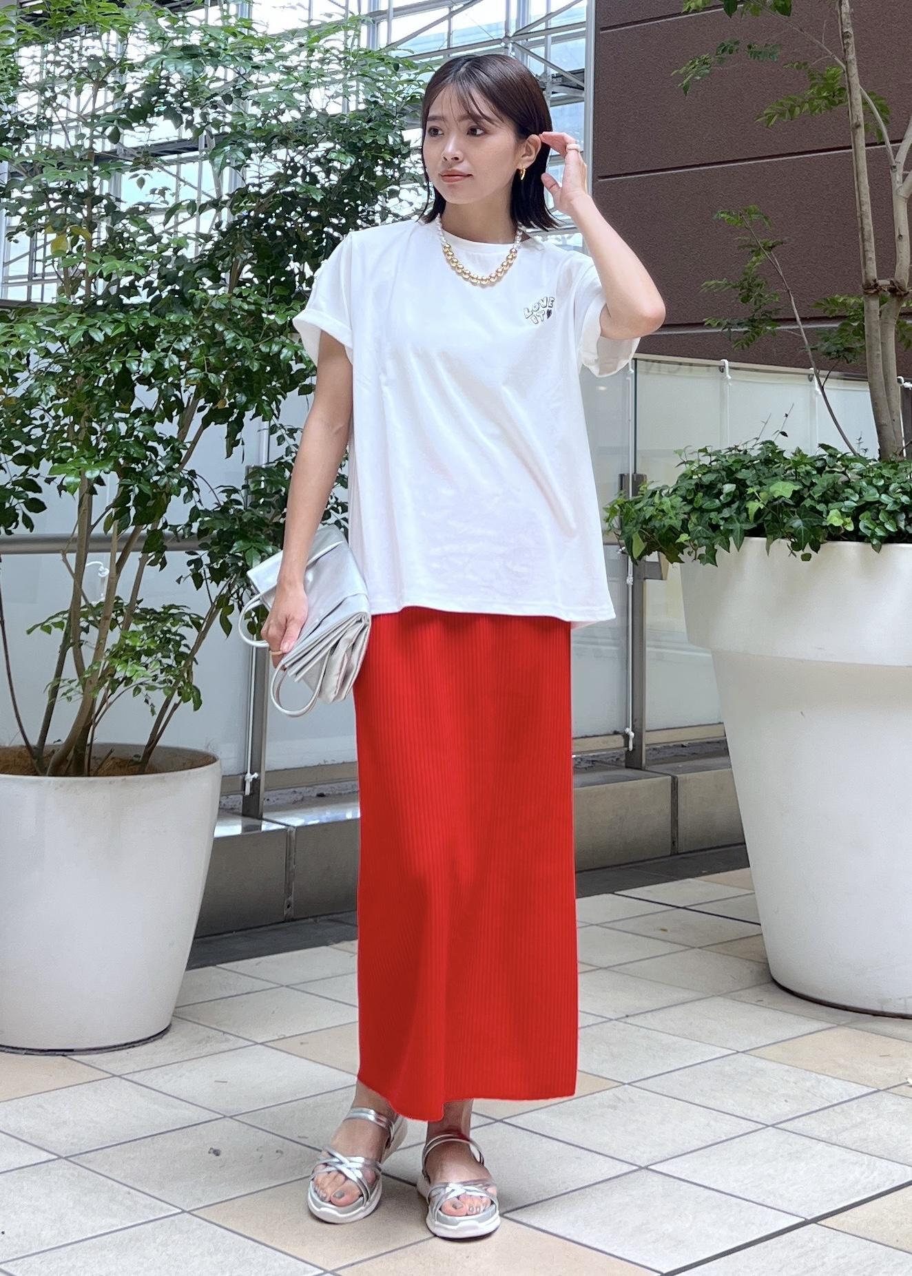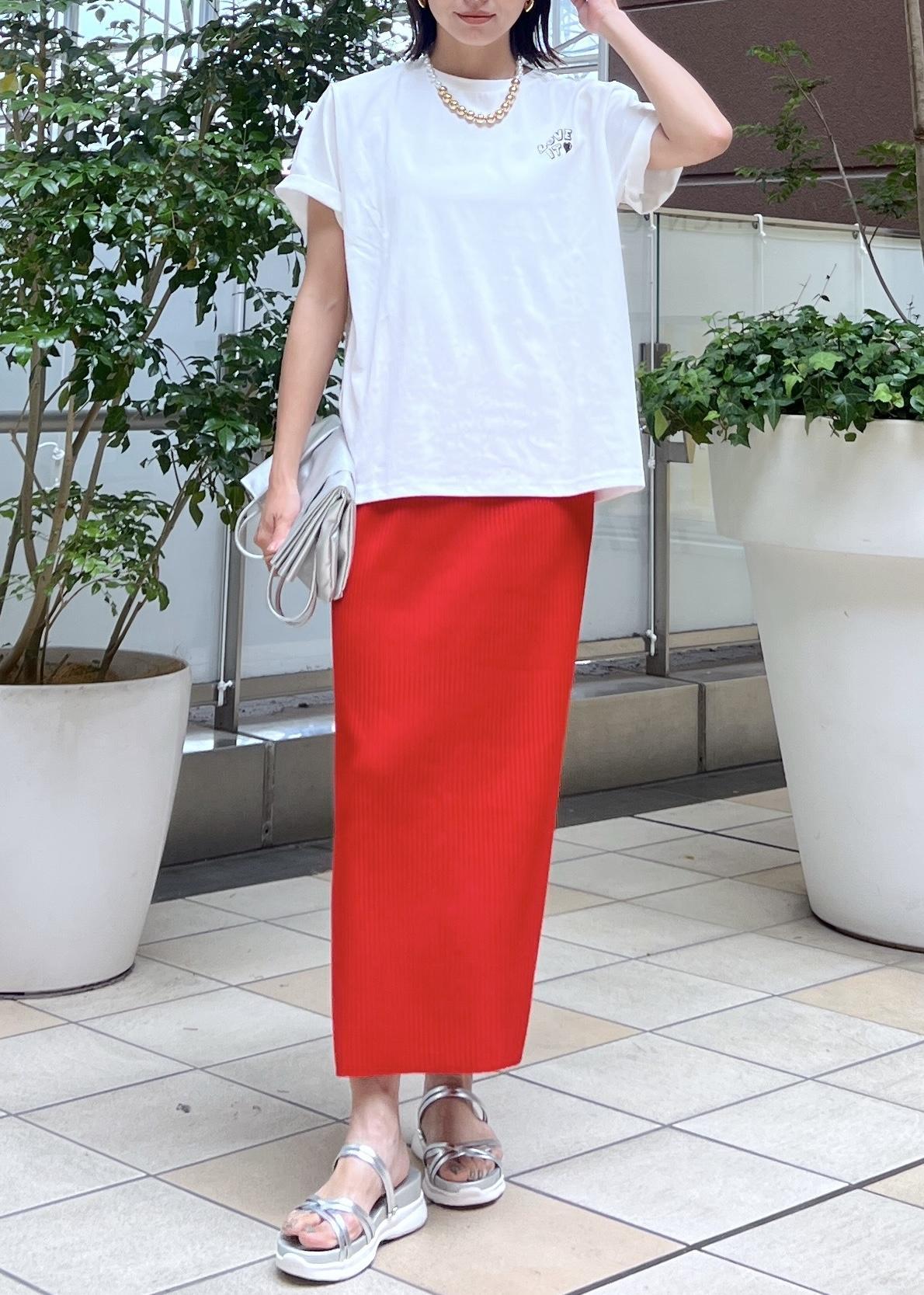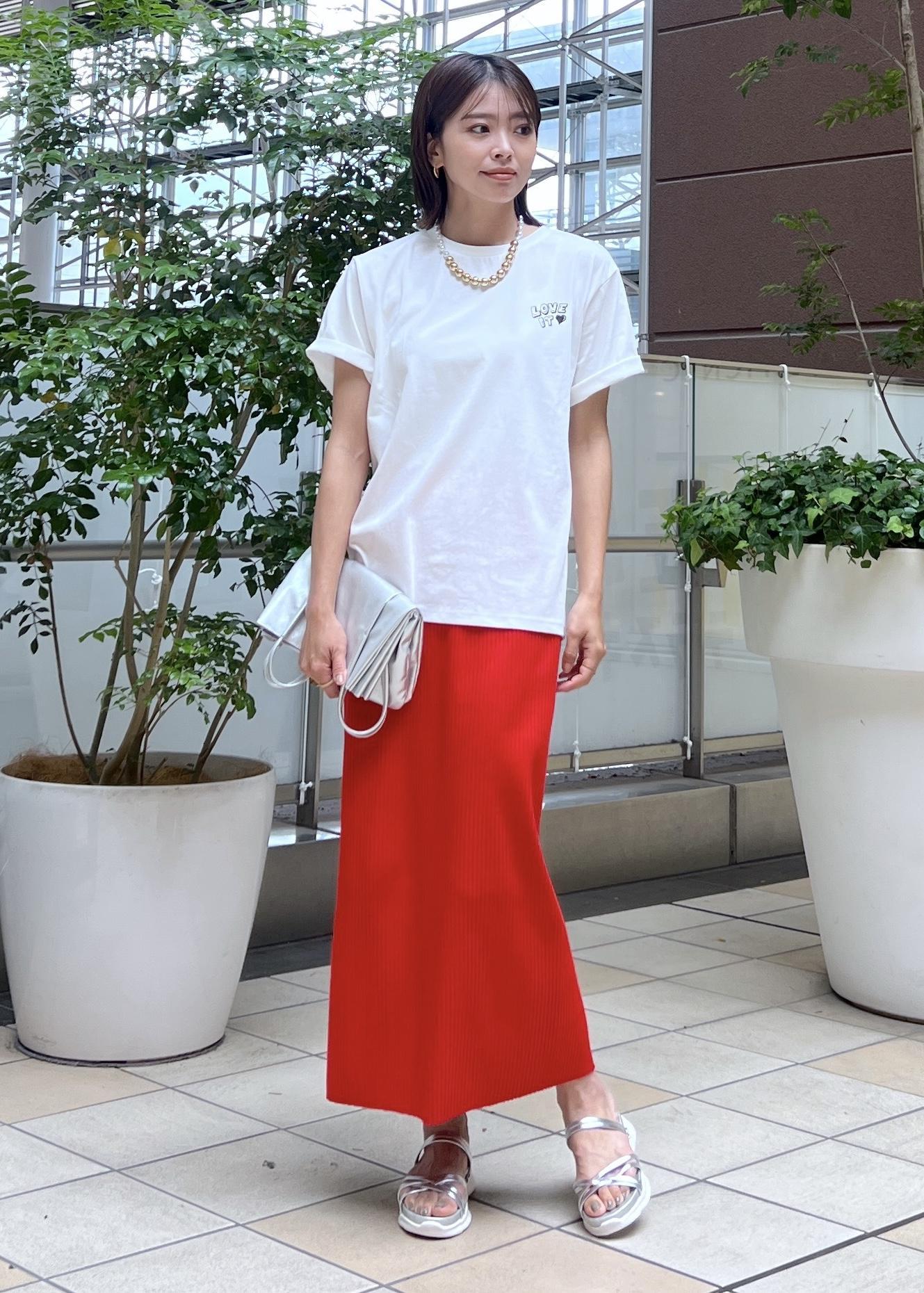 パッと目を引く赤のスカートは、白Tを合わせて夏のカジュアルスタイルに◎。