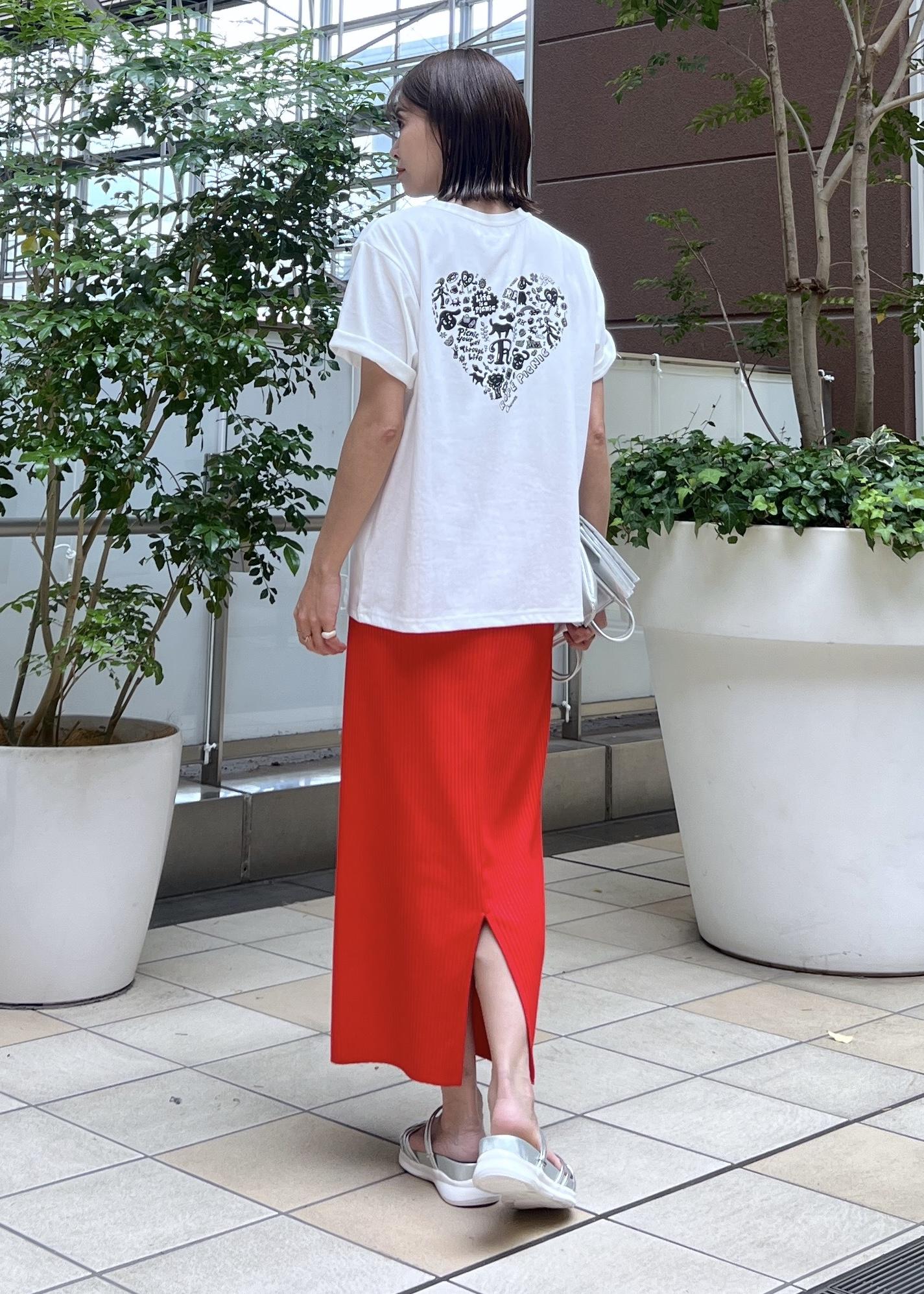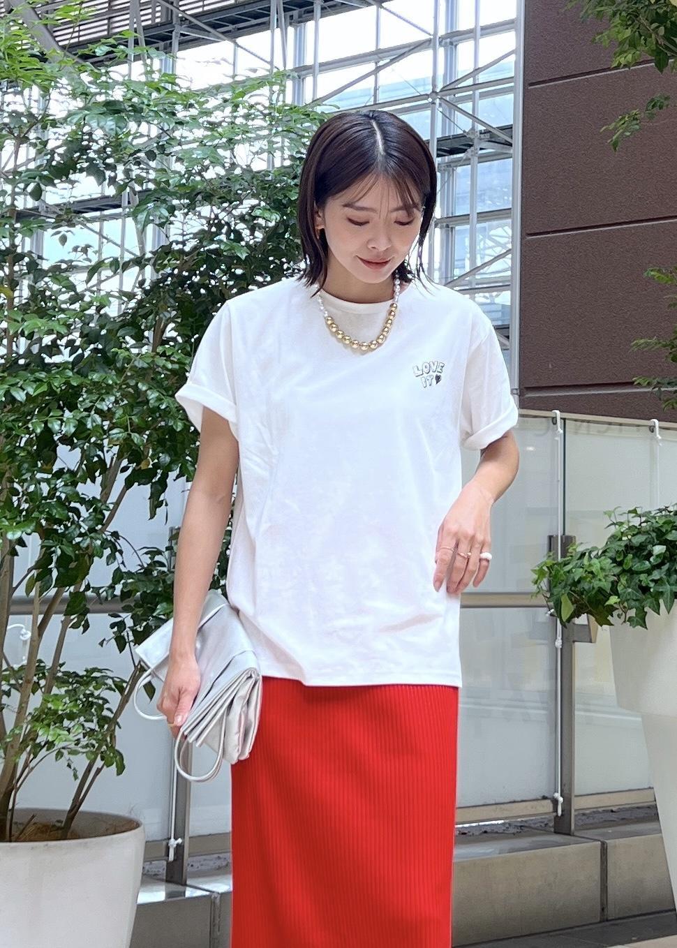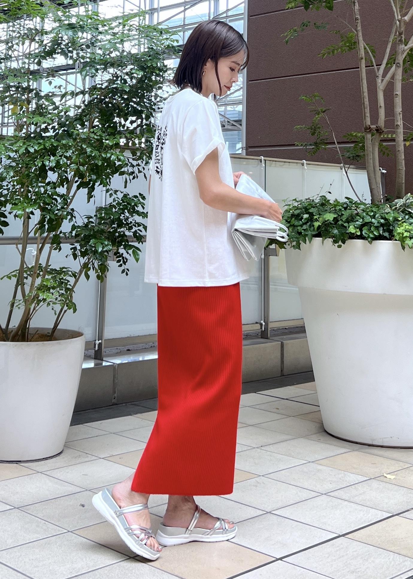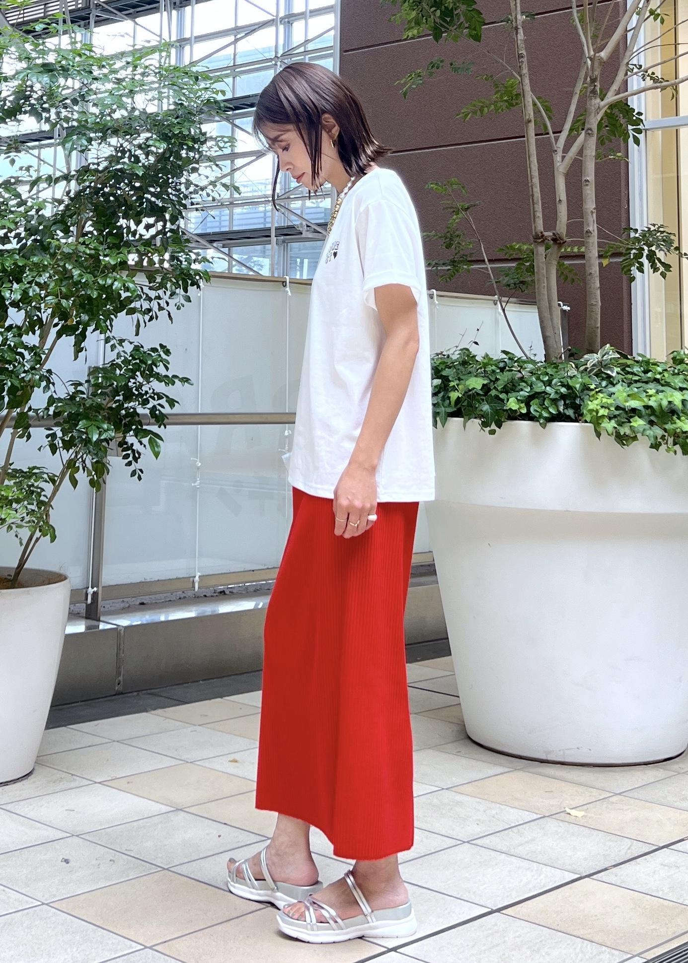 パッと目を引く赤のスカートは、白Tを合わせて夏のカジュアルスタイルに◎。