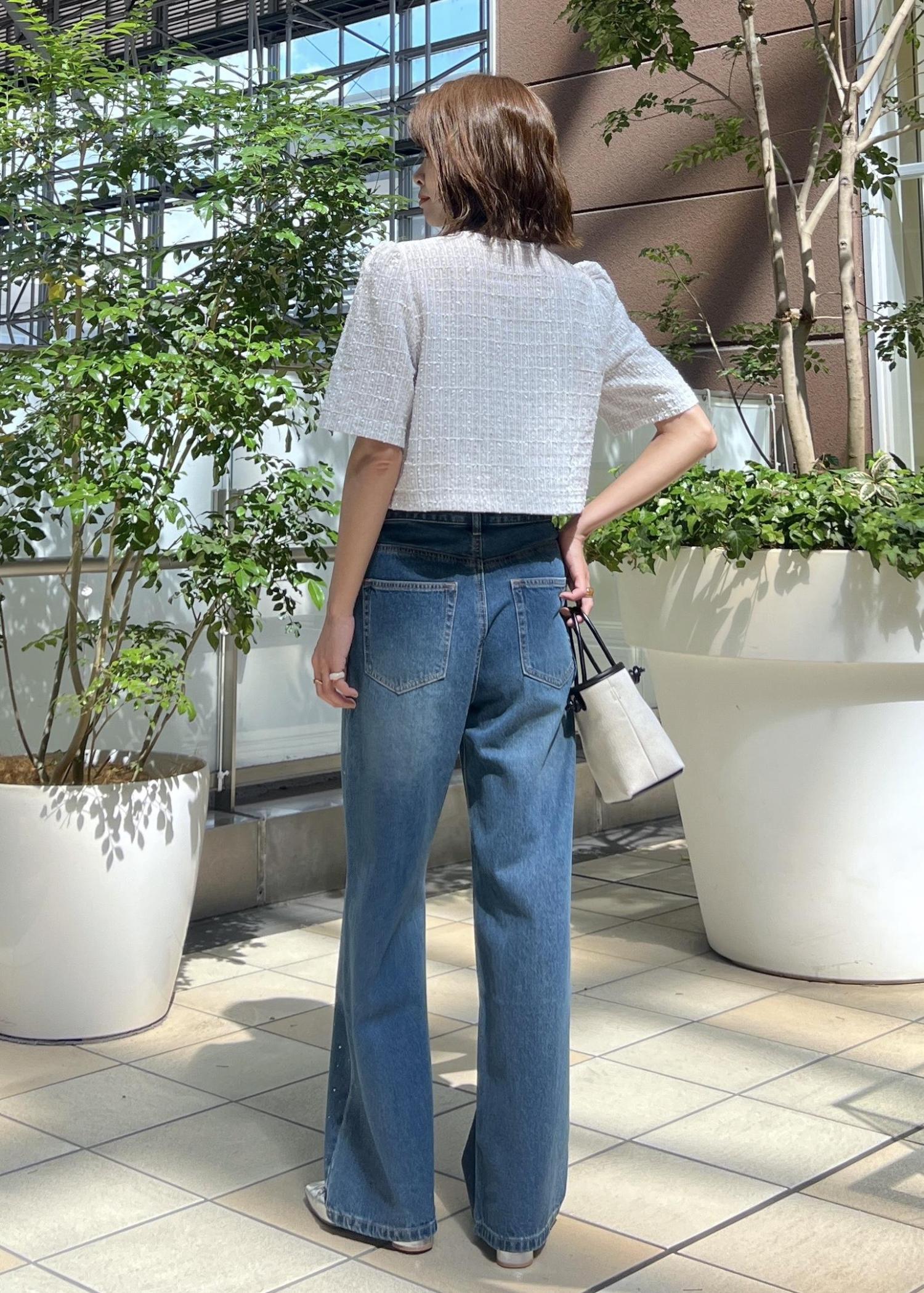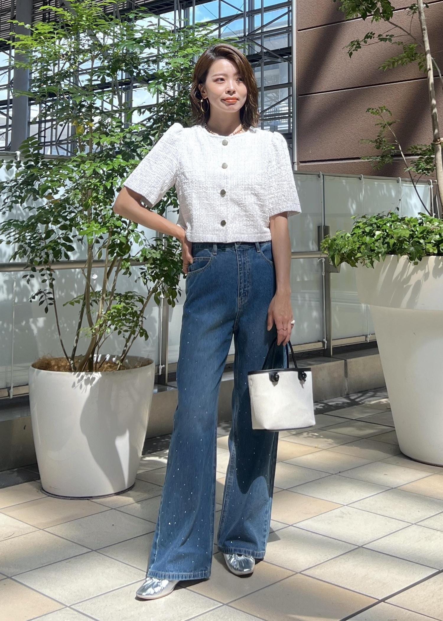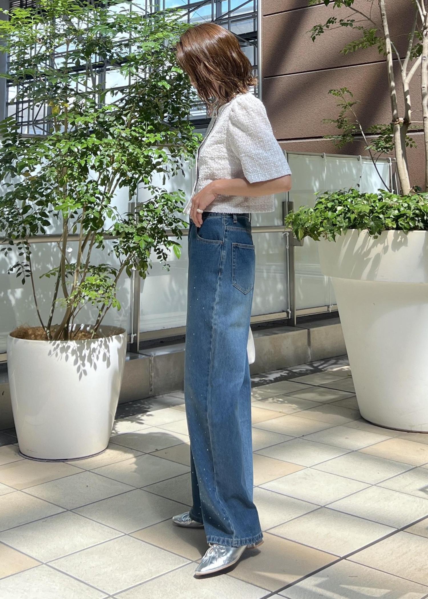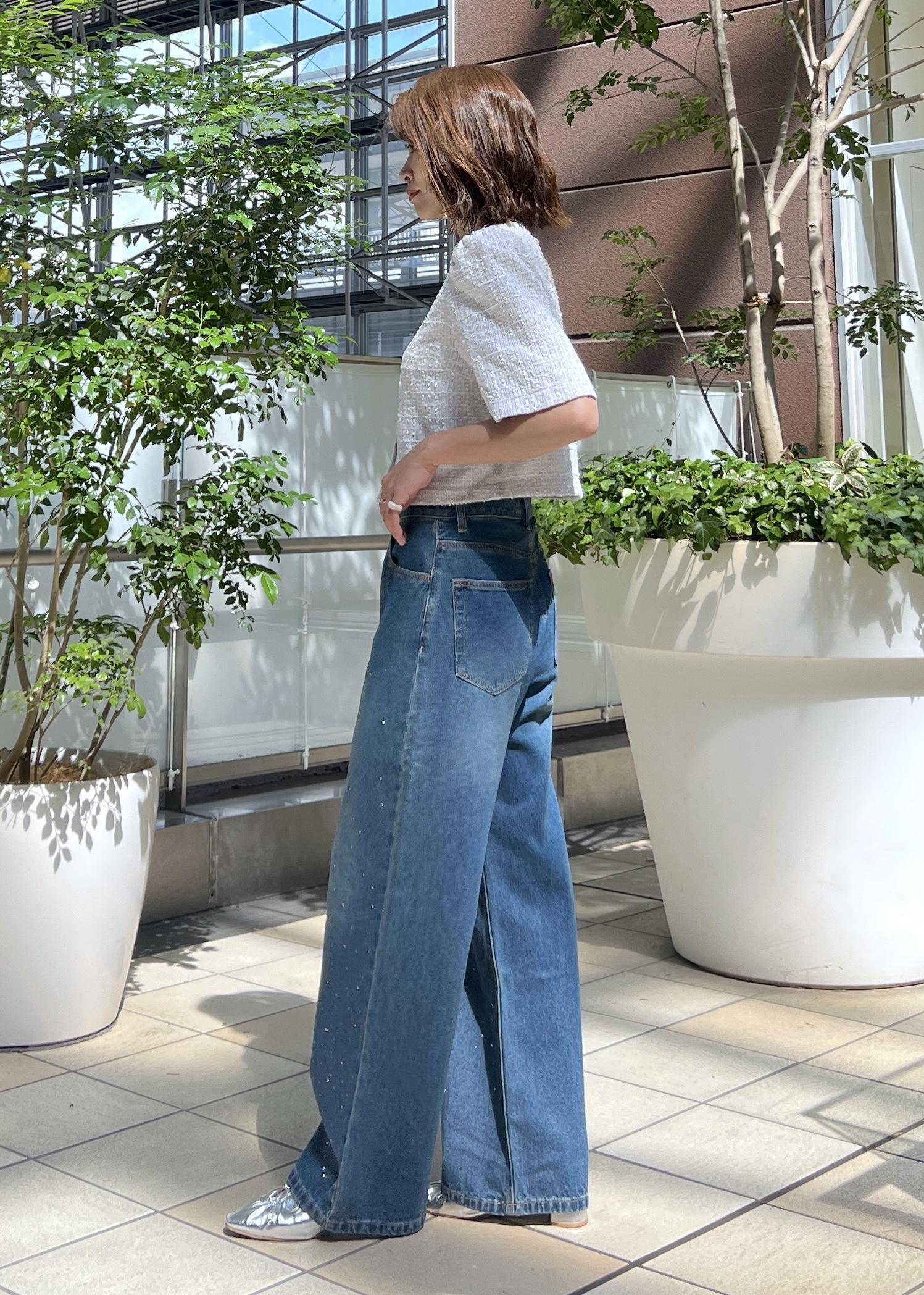 デニムはさりげないキラキラ感のあるビジュータイプにして、夏らしい軽やかさのあるスタイリングにしました。