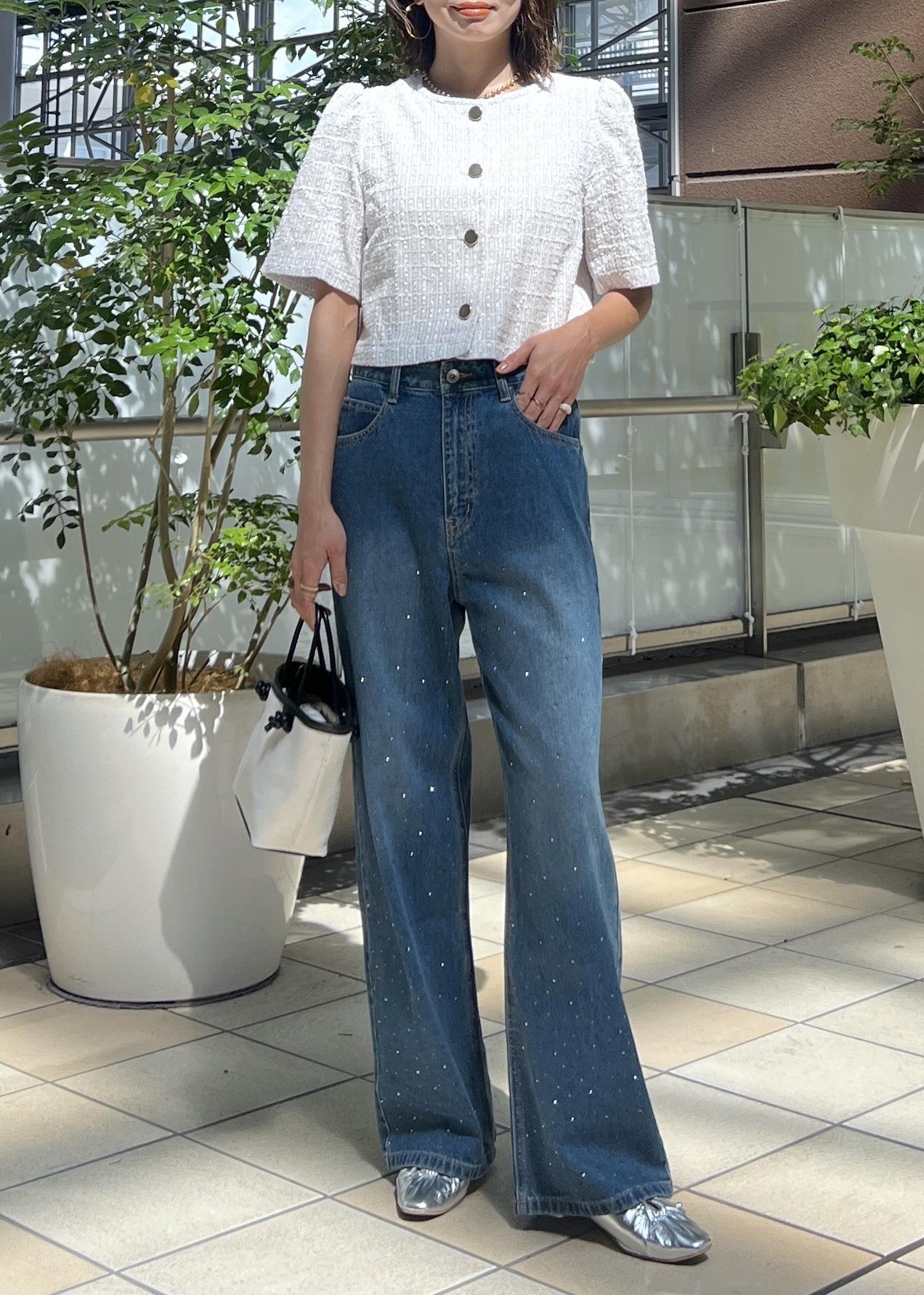 柔らかくしなやかなデニム生地で、前身頃には小さめのビジューがランダムに付いています。