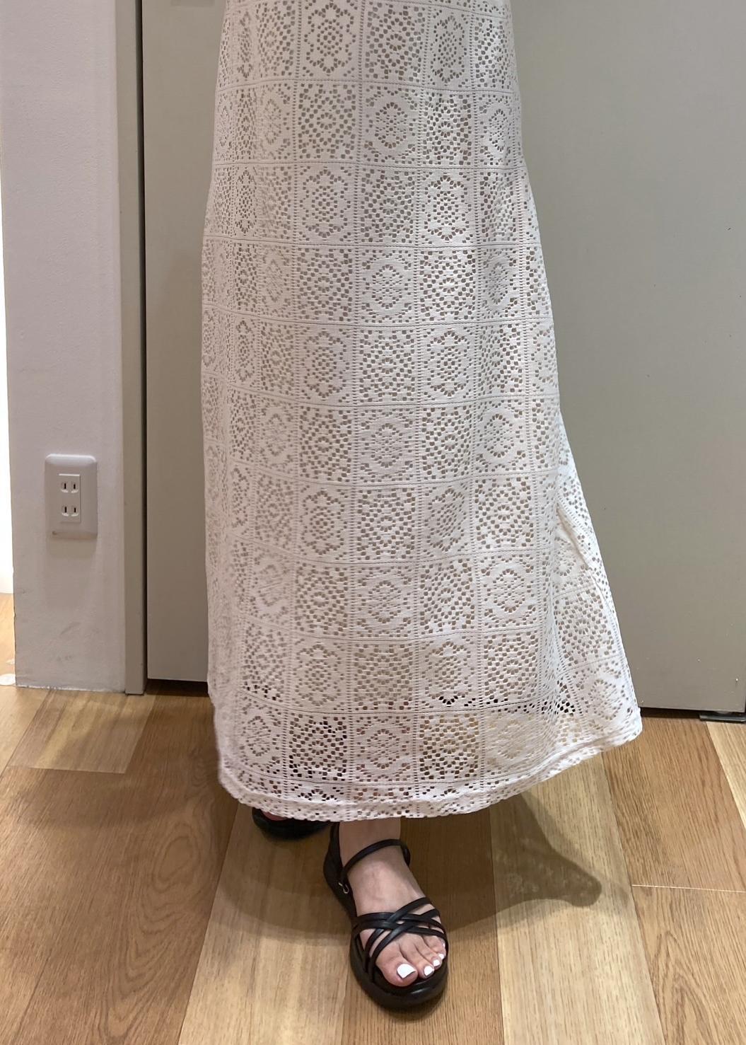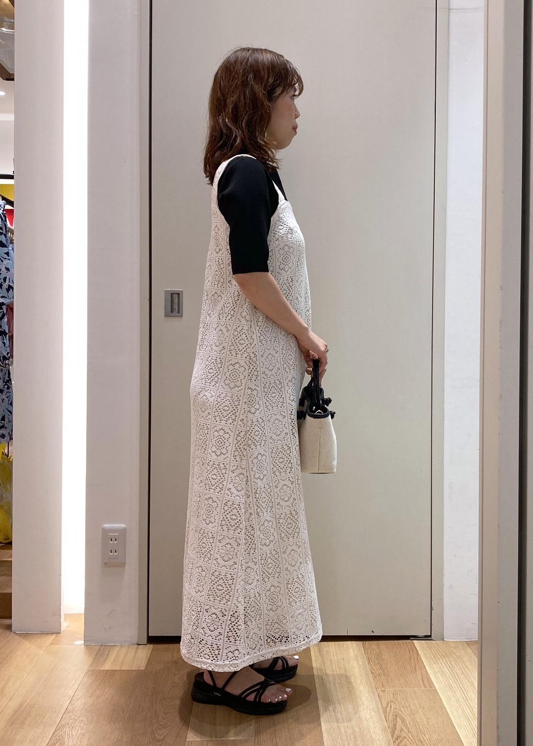 レースワンピースは横がファスナーで着脱しやすいデザインですが、バスト回りは少し小さめなので、インナーはフィット感のあるニットやTシャツとの合わせがおすすめです。