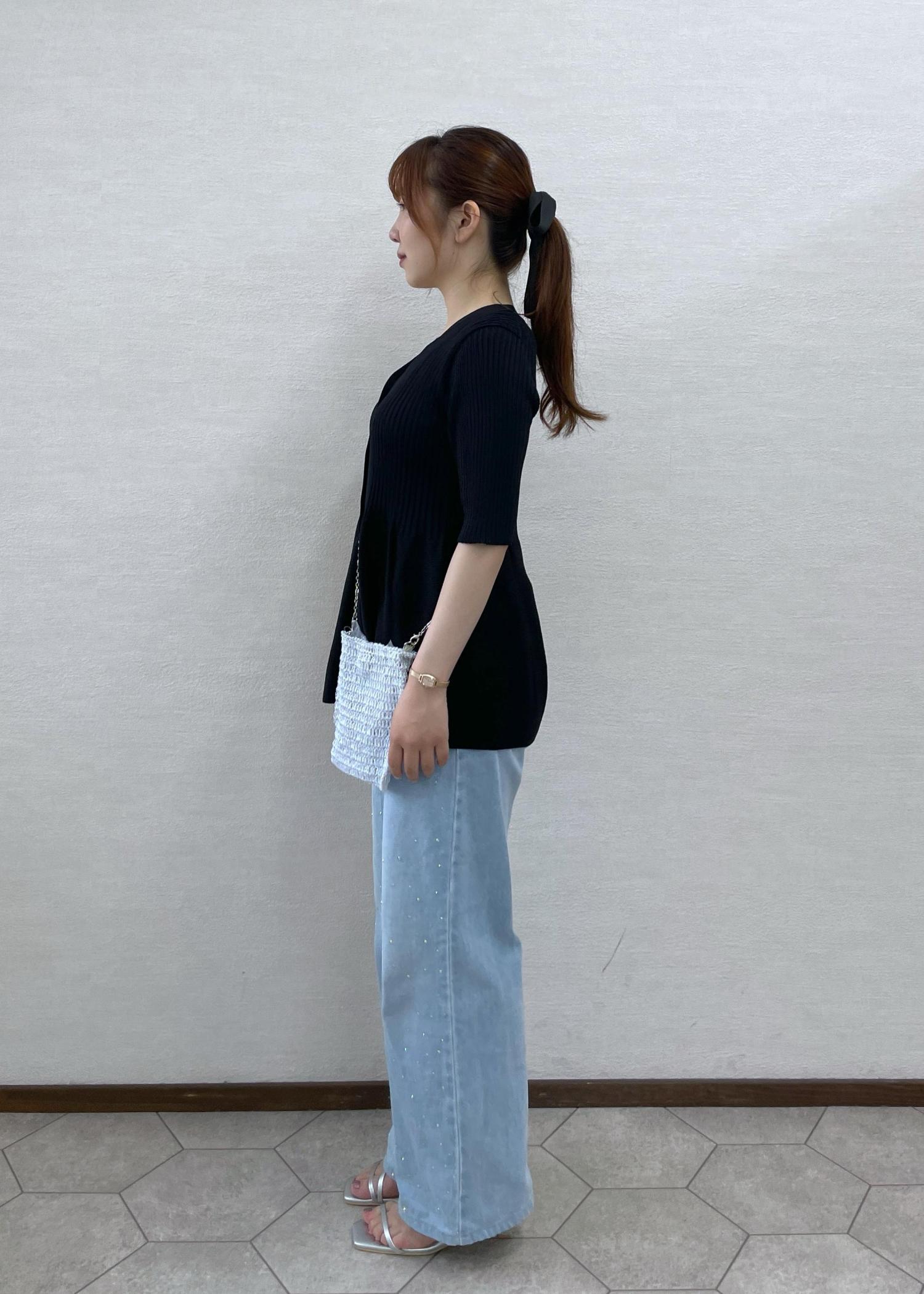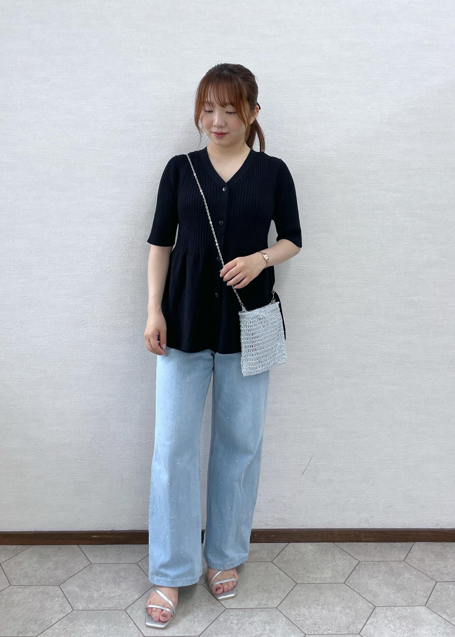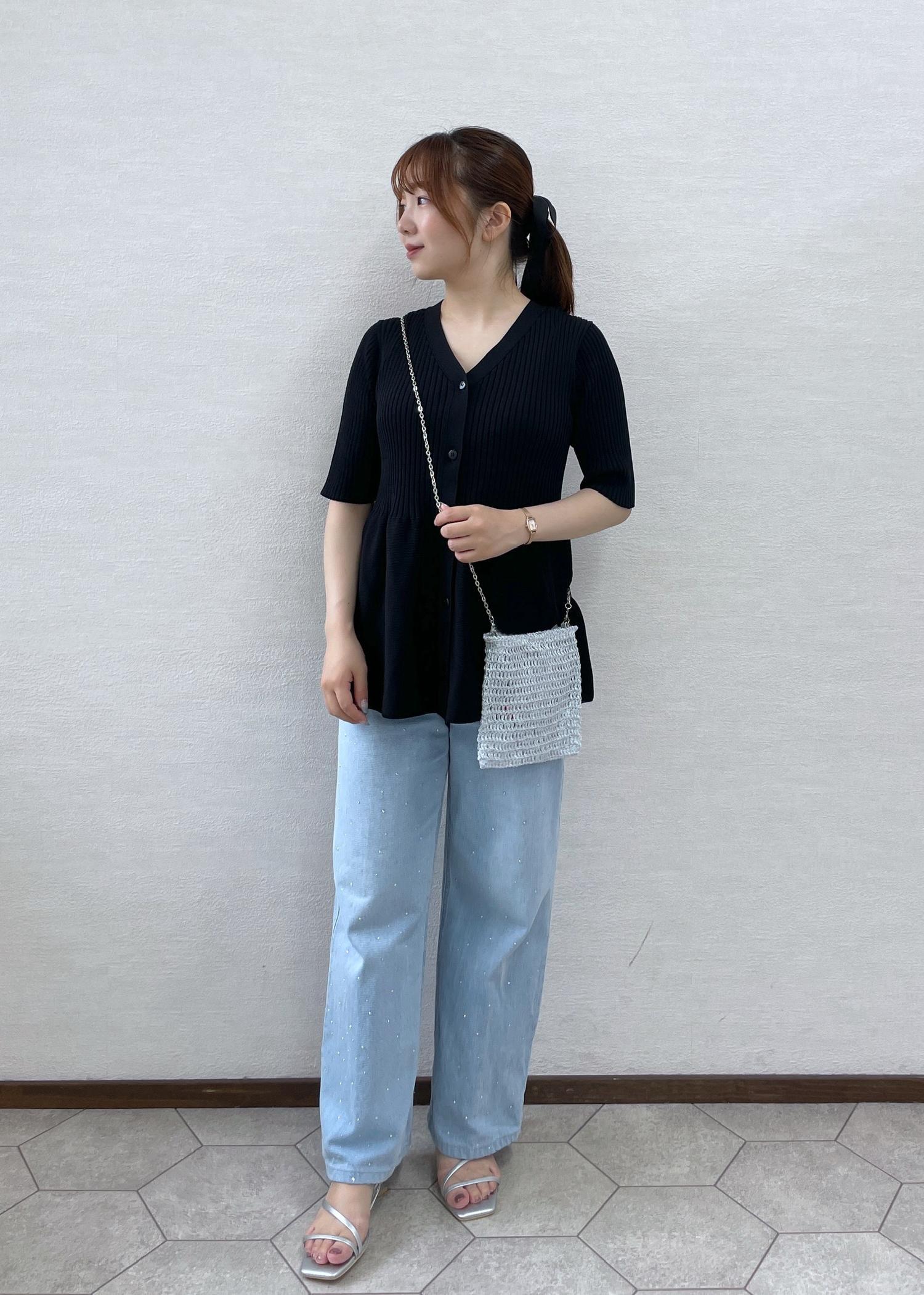 デニムにトップスとシンプルな合わせですが、キラキラで可愛いビジューがついたデニムや華奢見えするサンダルとバッグを同色でまとめることで、女子会やお出かけにぴったりです!