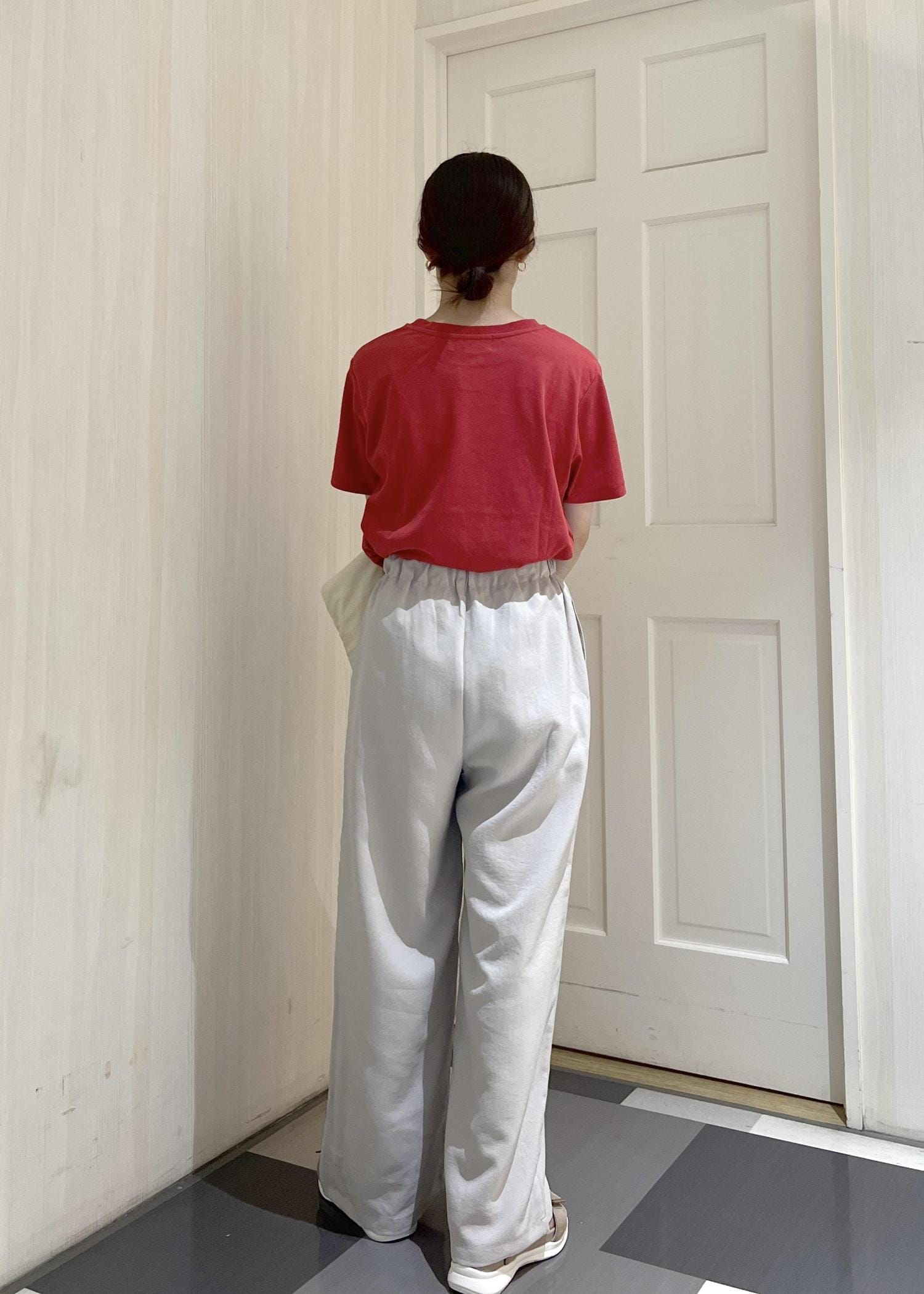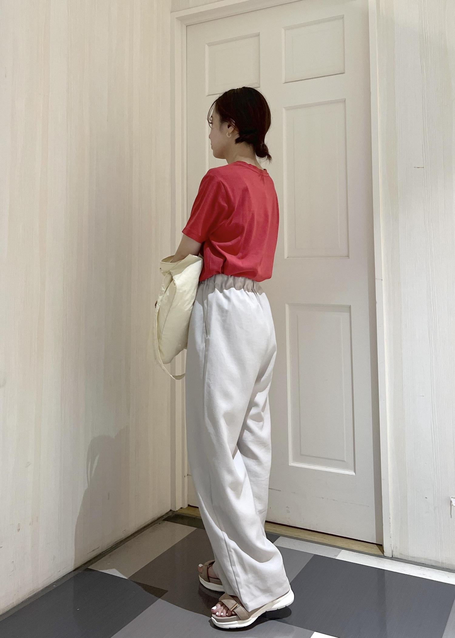 赤Tシャツにワイドパンツでシンプルにスタイリング。