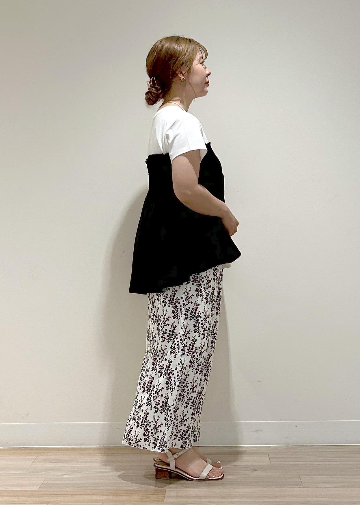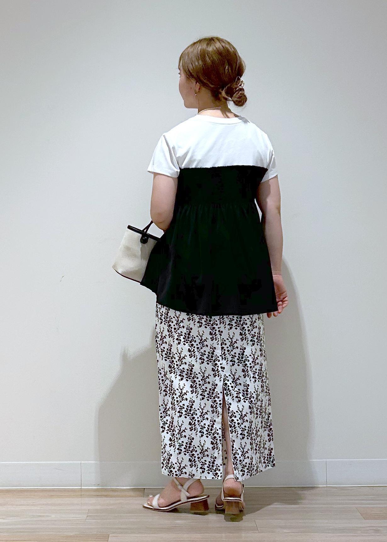 シャーリングドッキングカットトップス×フラワープリントスカートでモノトーンコーデ