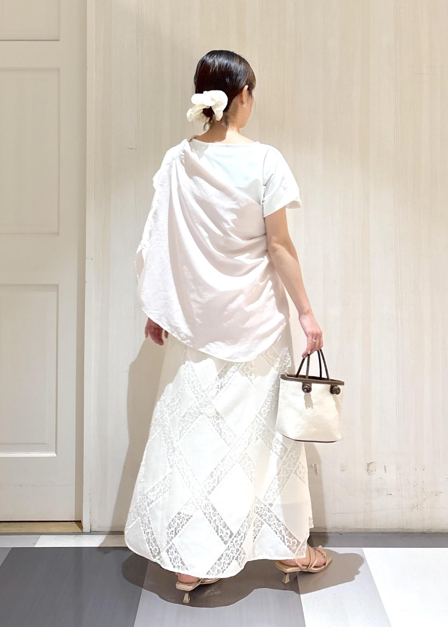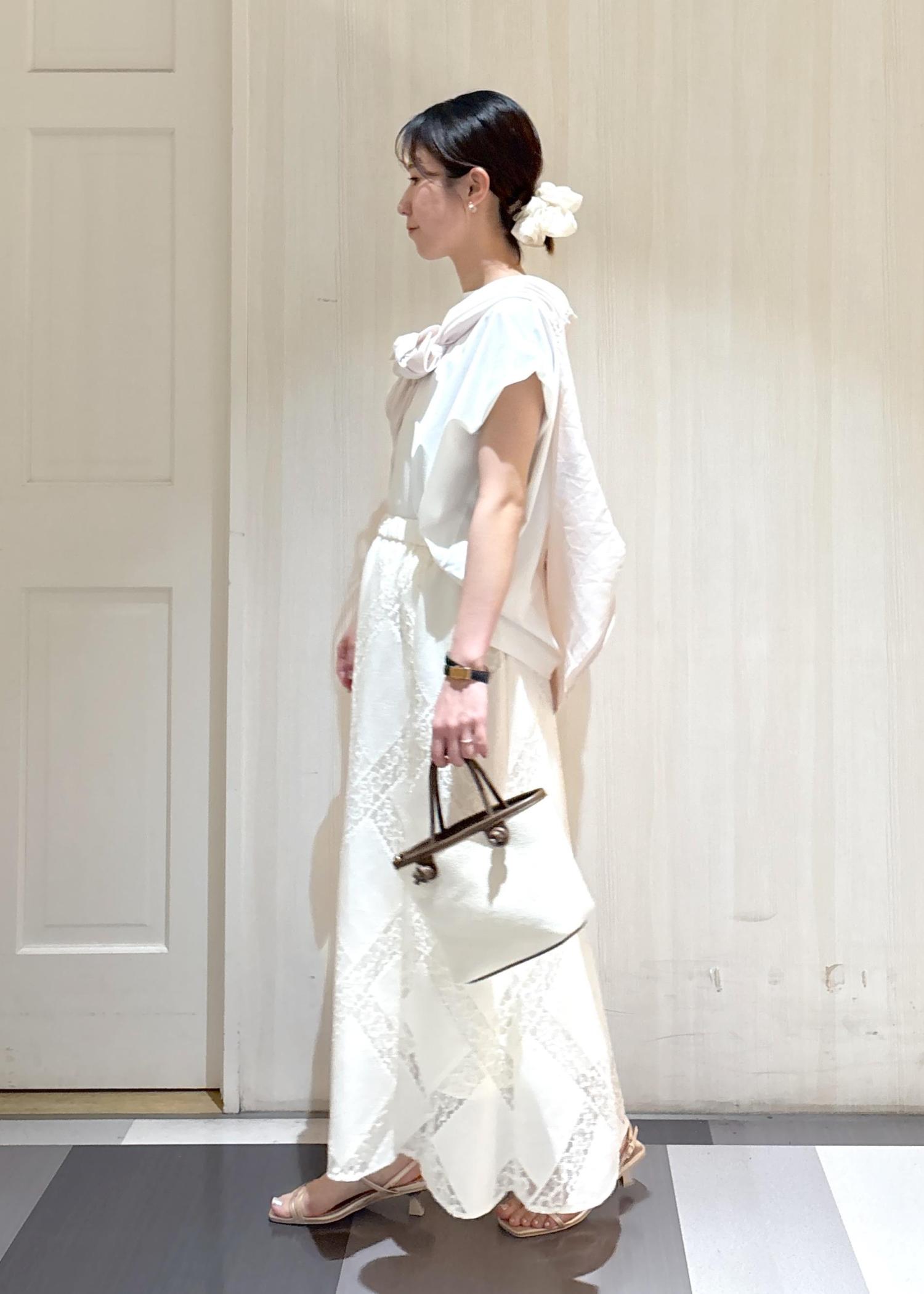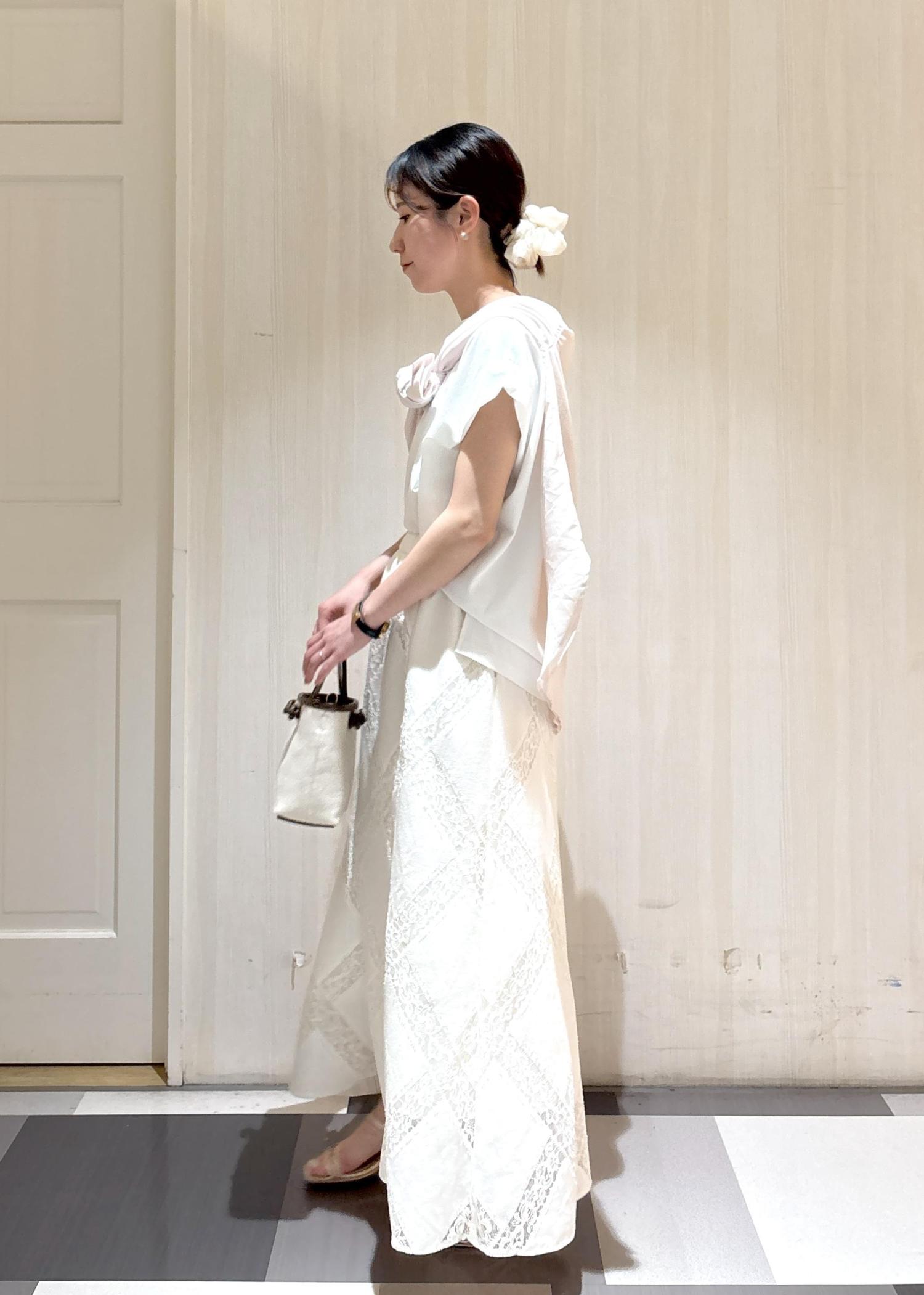 白のワンカラー上下に、優しげなピンクのシアーシャツでポイントにしました