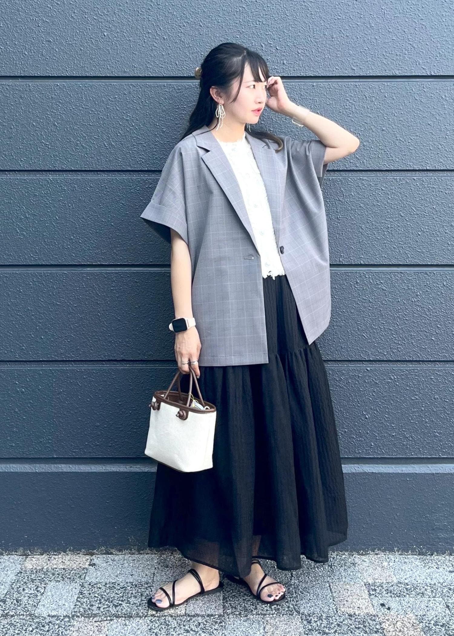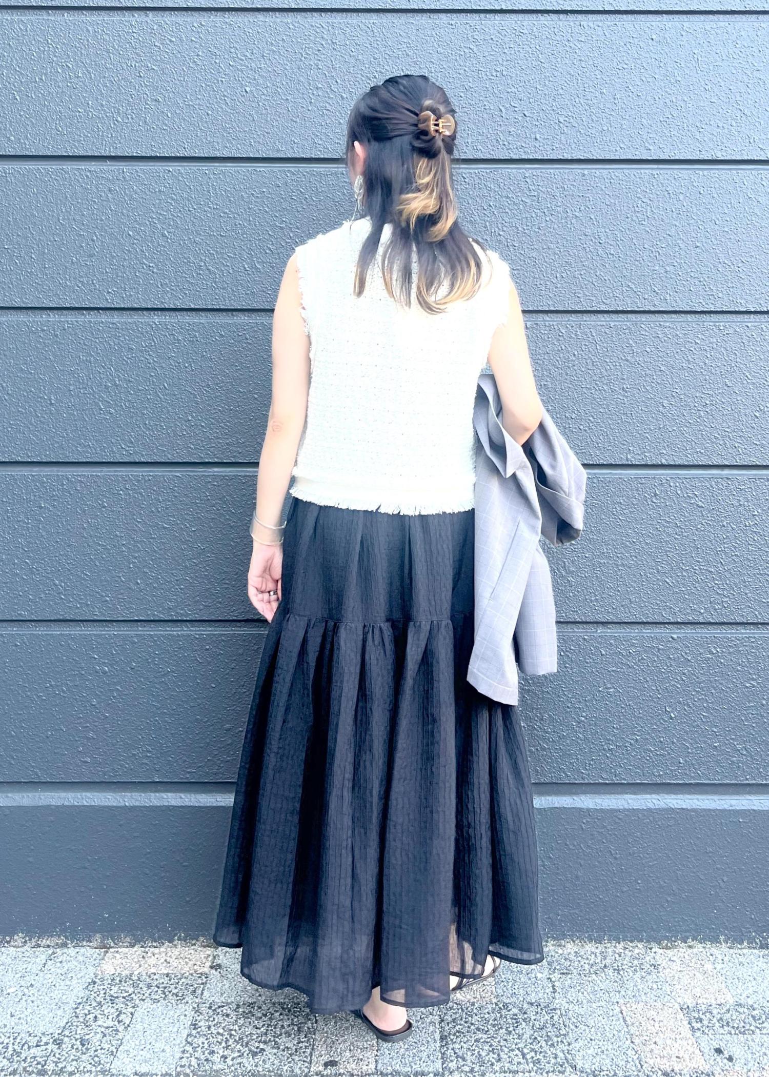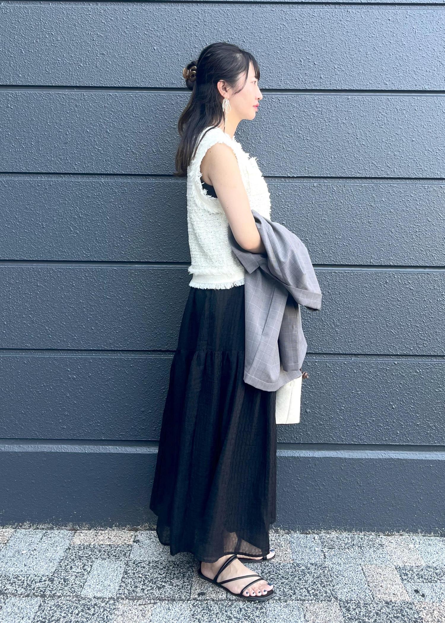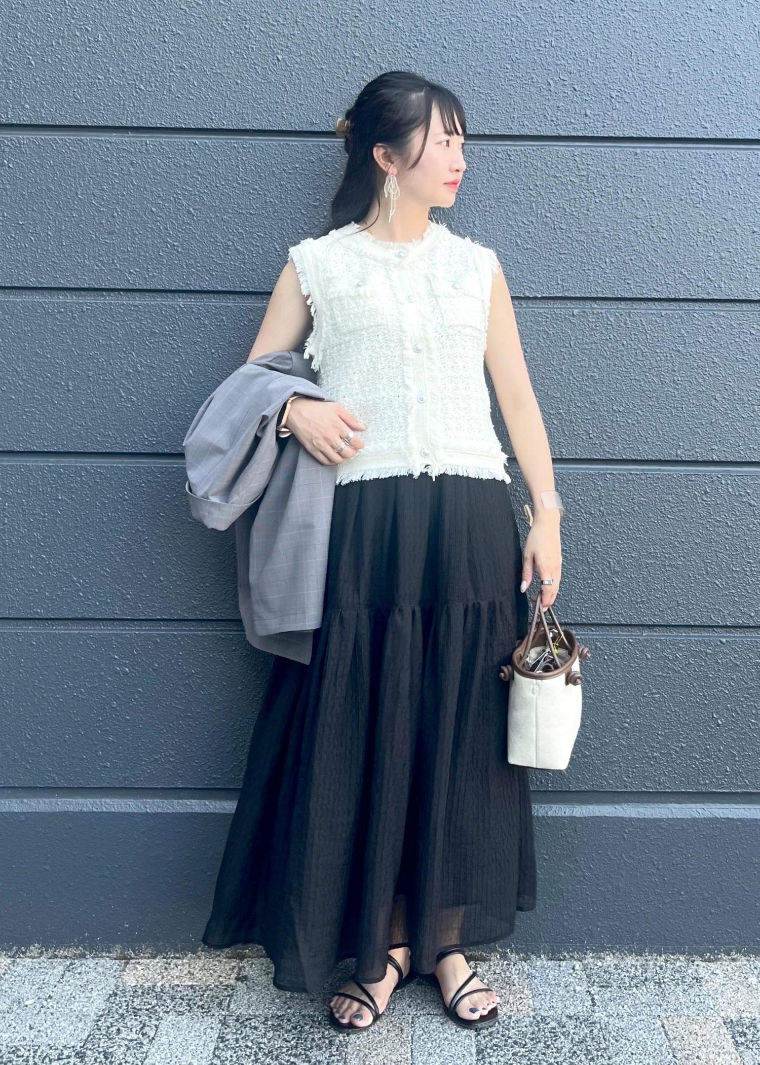 暑い時期でも涼しくきれいめスタイルが叶うサマーツイードトップスを使った着回しコーデ。
