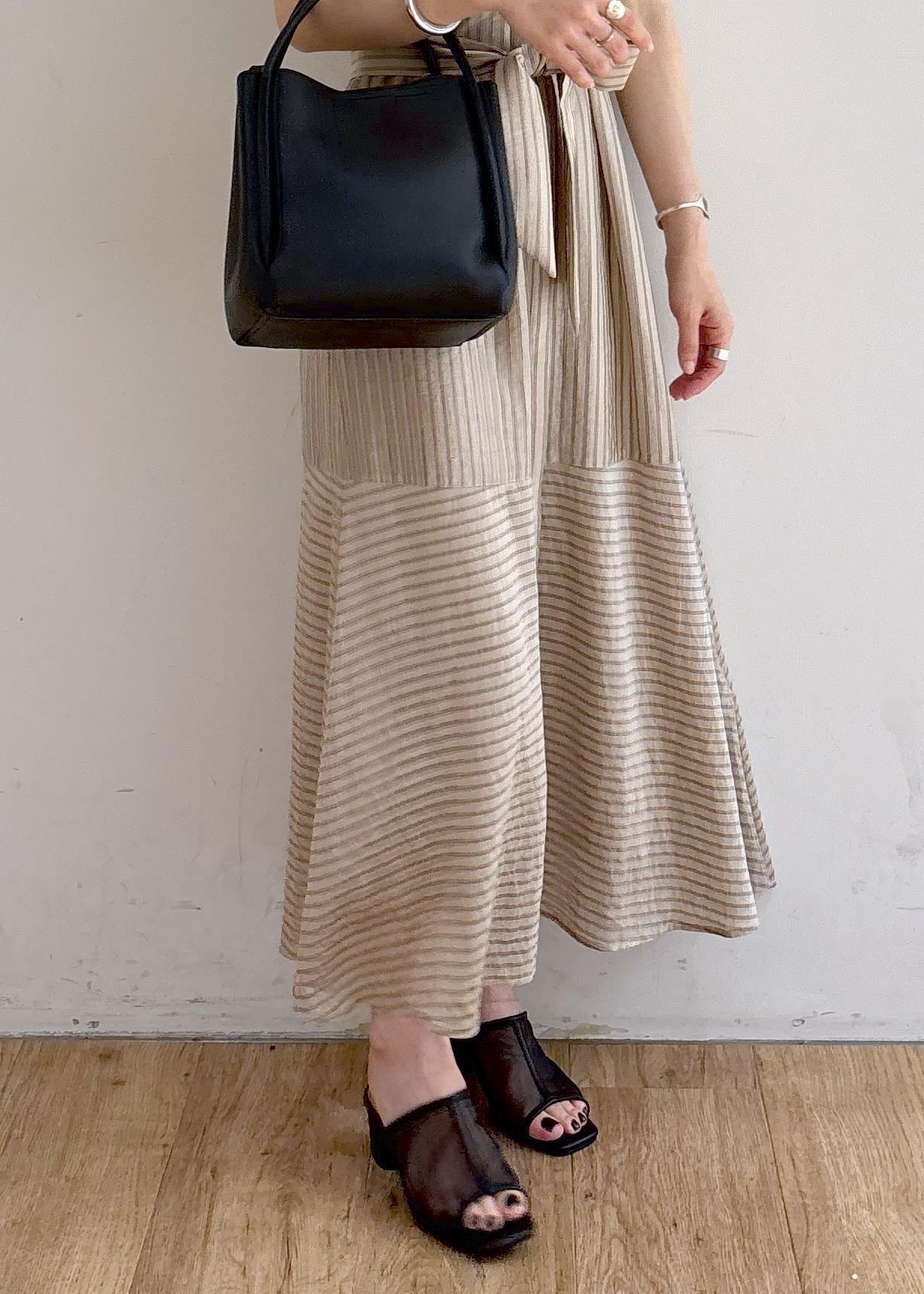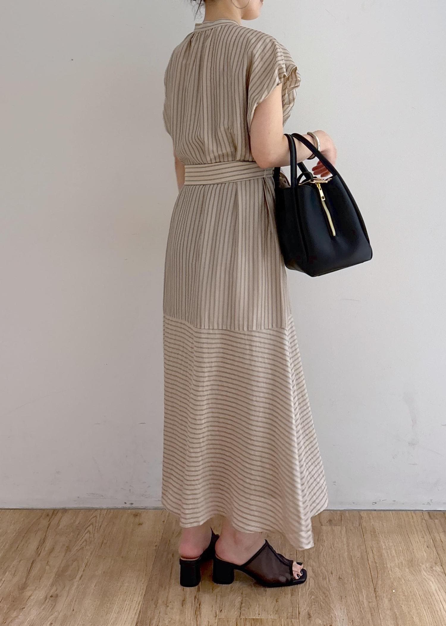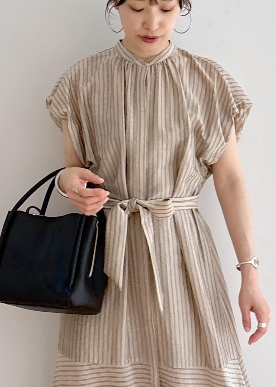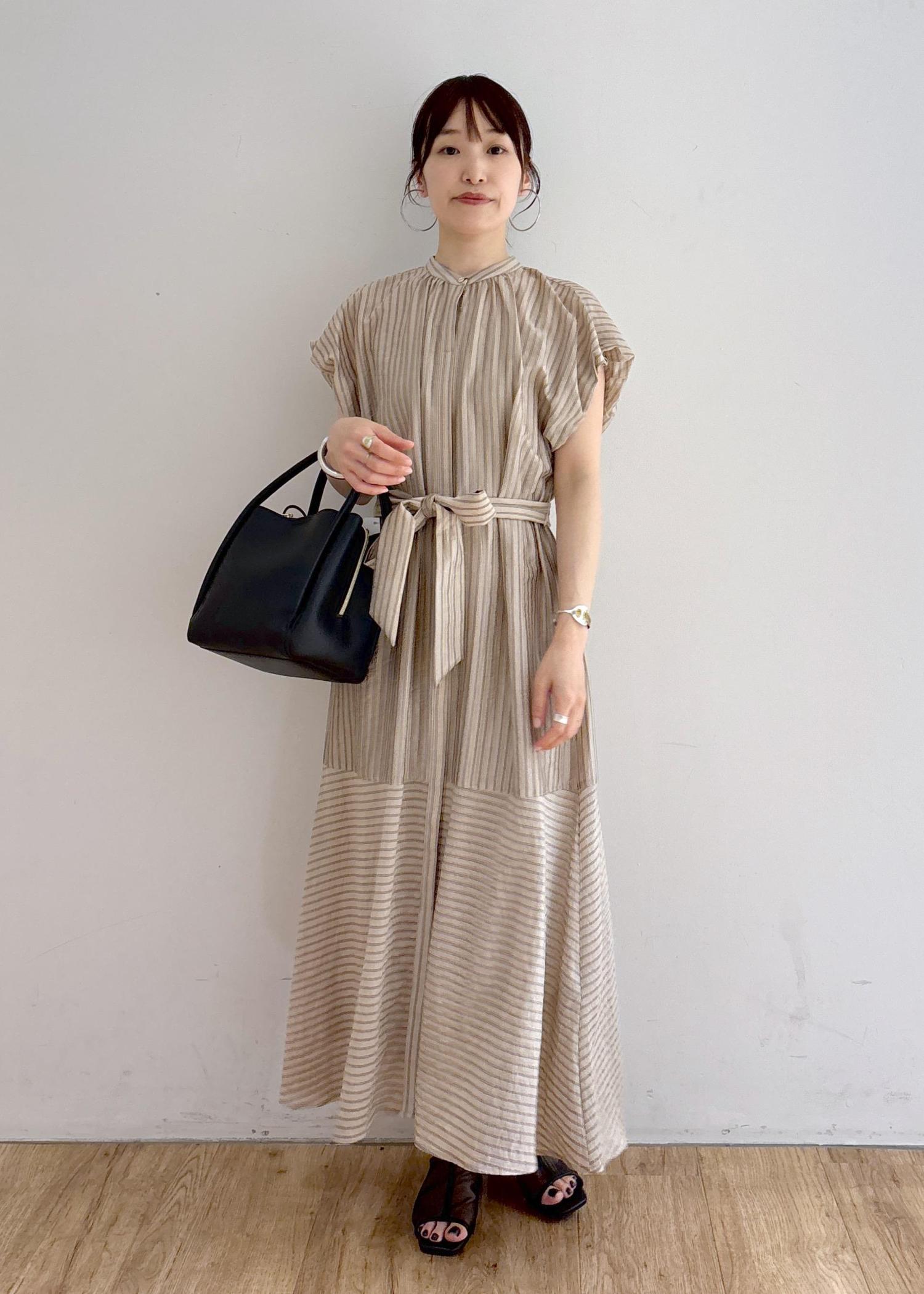 ワンピースをベージュ×ブラックカラーでコーディネートしました。おでかけにもぴったりな一枚です。